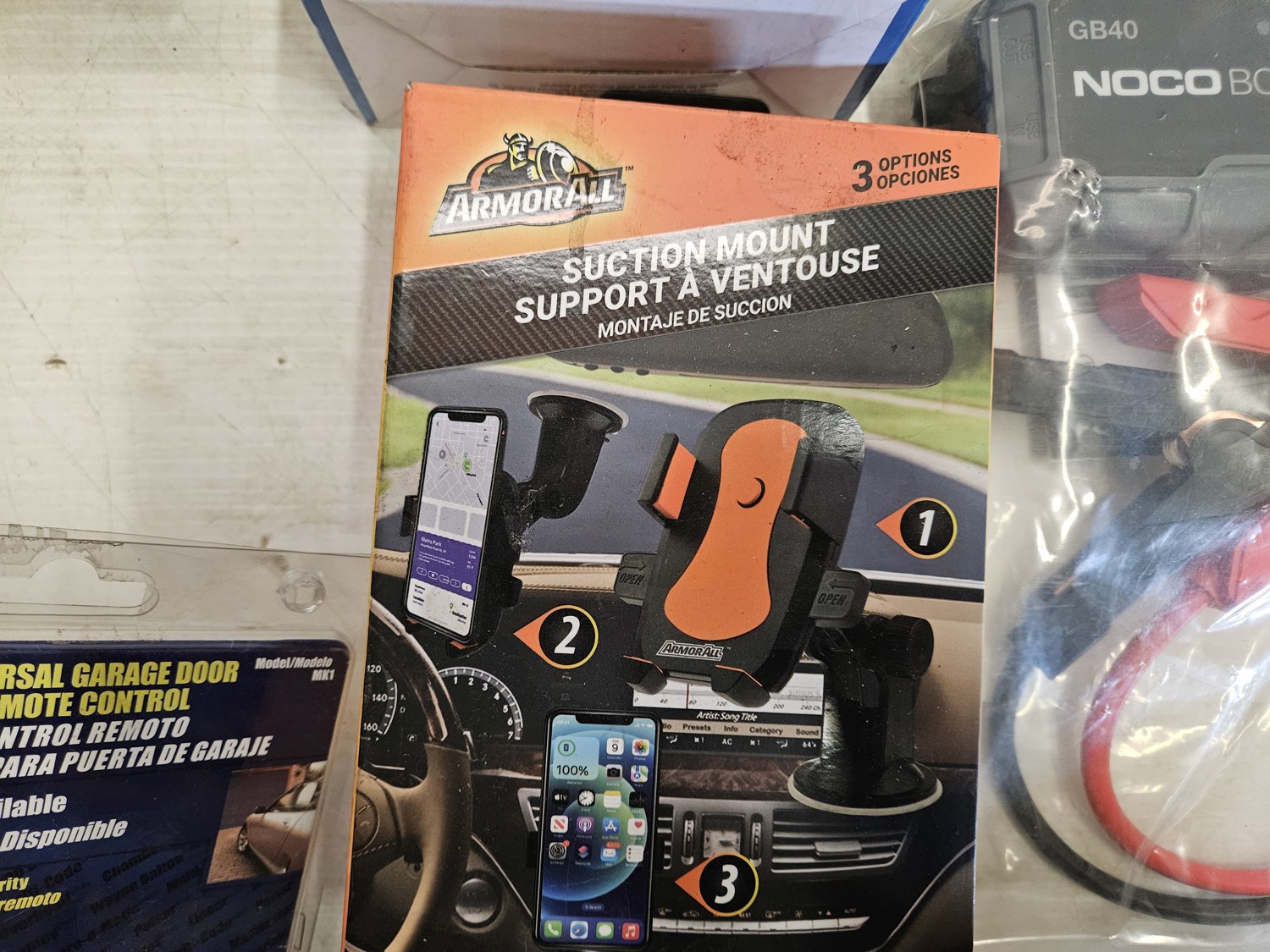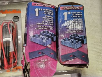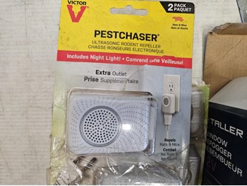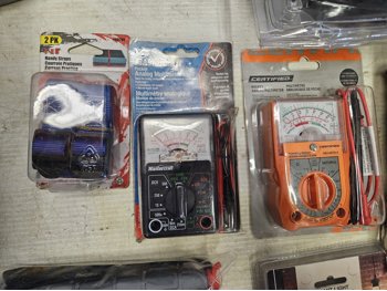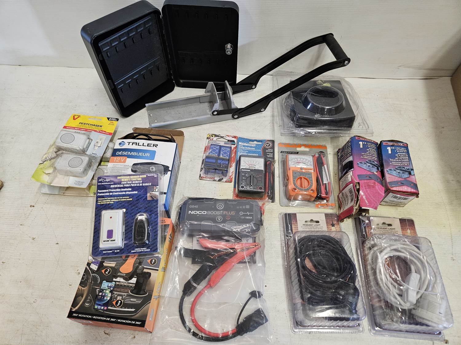 (2) pendant lights, (1) battery booster, (1) garage door remote, (1) phone holder for vehicle, (2) analog multimeters, (2) ultrasonic rodent repeller, (1) key box, (2) light duty aluminum 1 inch block kit,