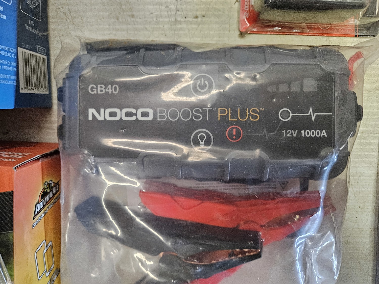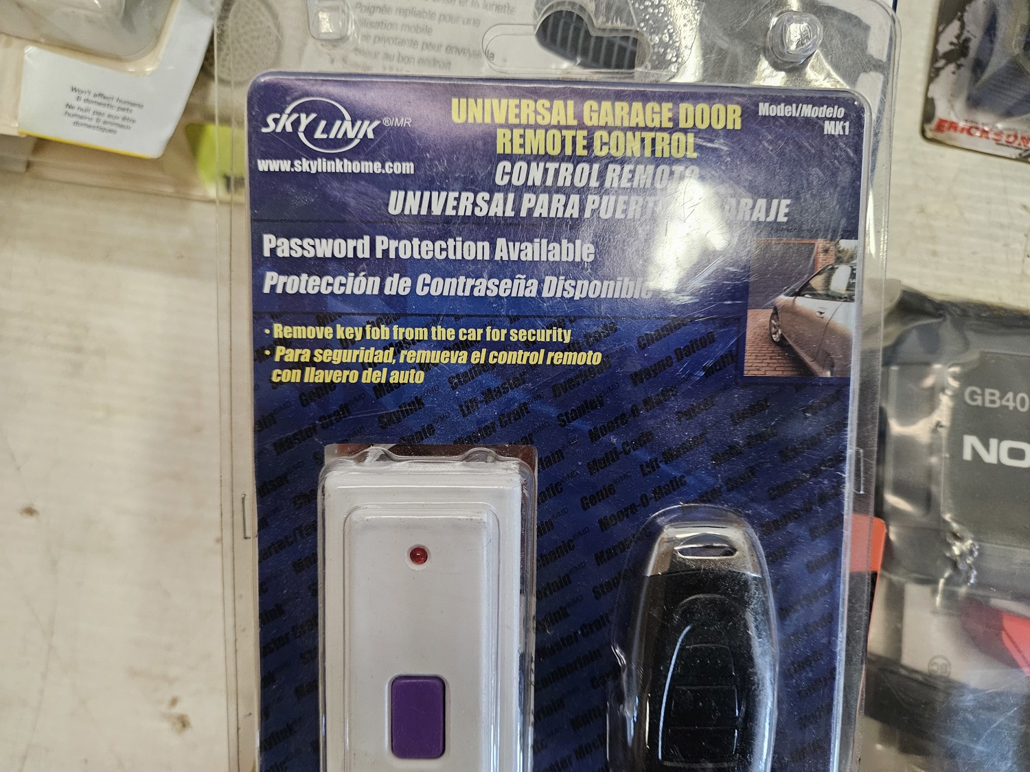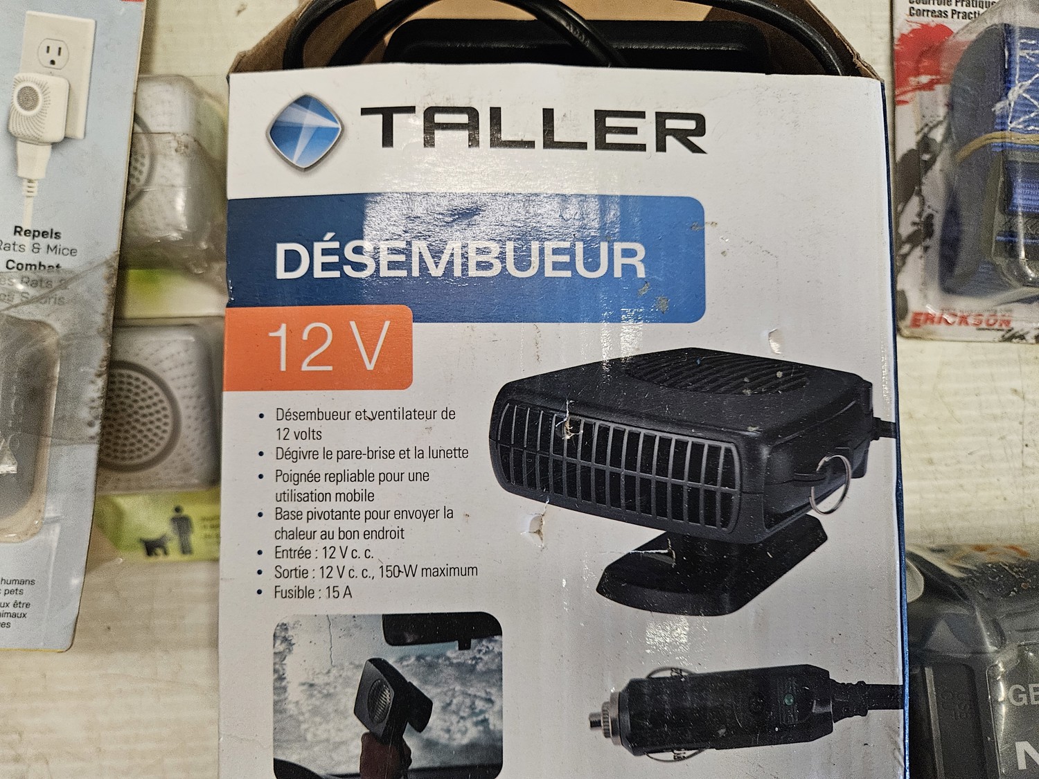 (2) pendant lights, (1) battery booster, (1) garage door remote, (1) phone holder for vehicle, (2) analog multimeters, (2) ultrasonic rodent repeller, (1) key box, (2) light duty aluminum 1 inch block kit,