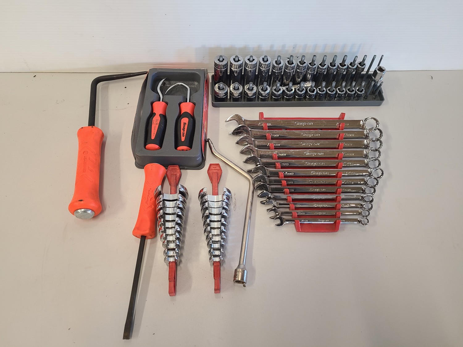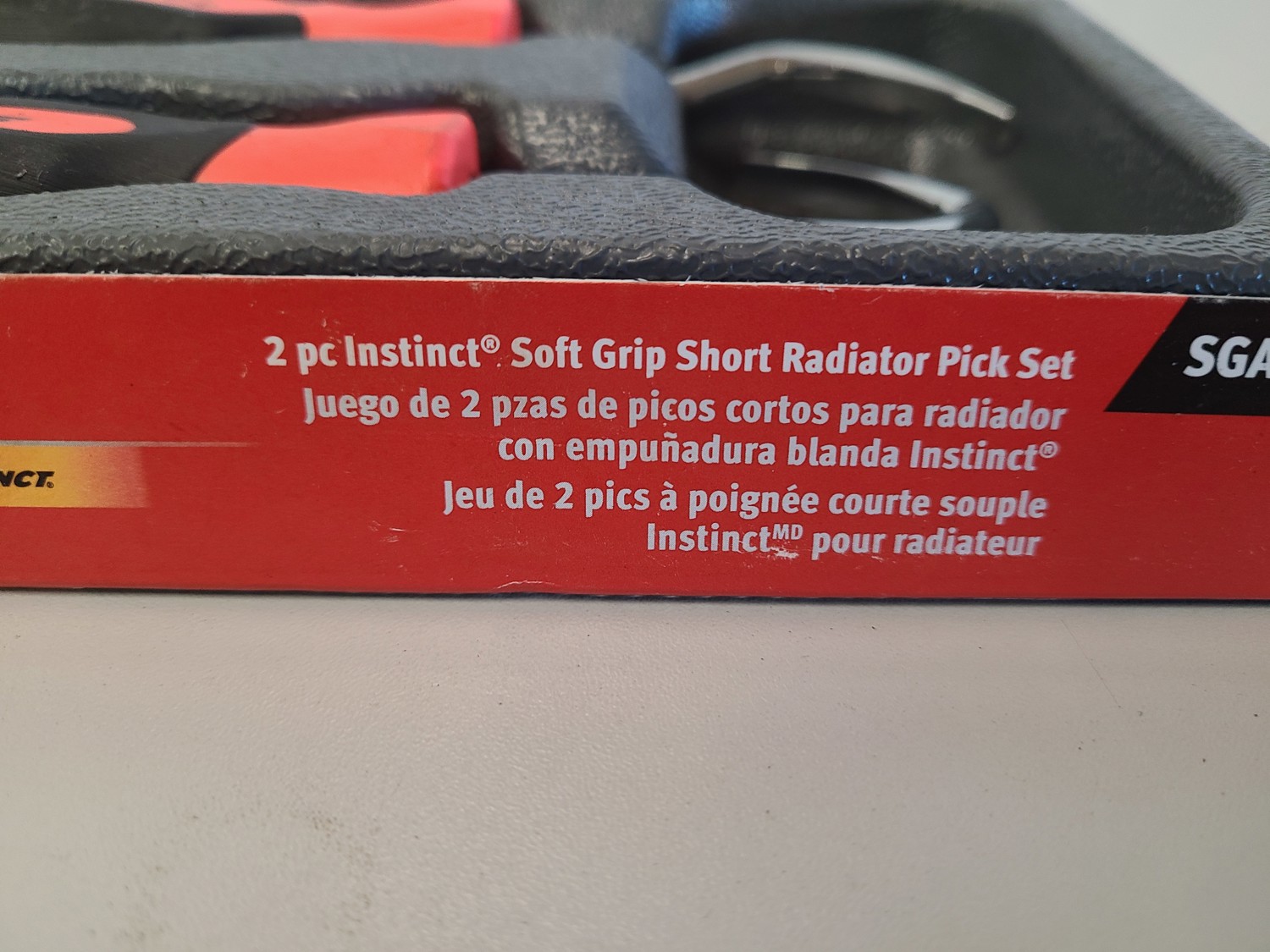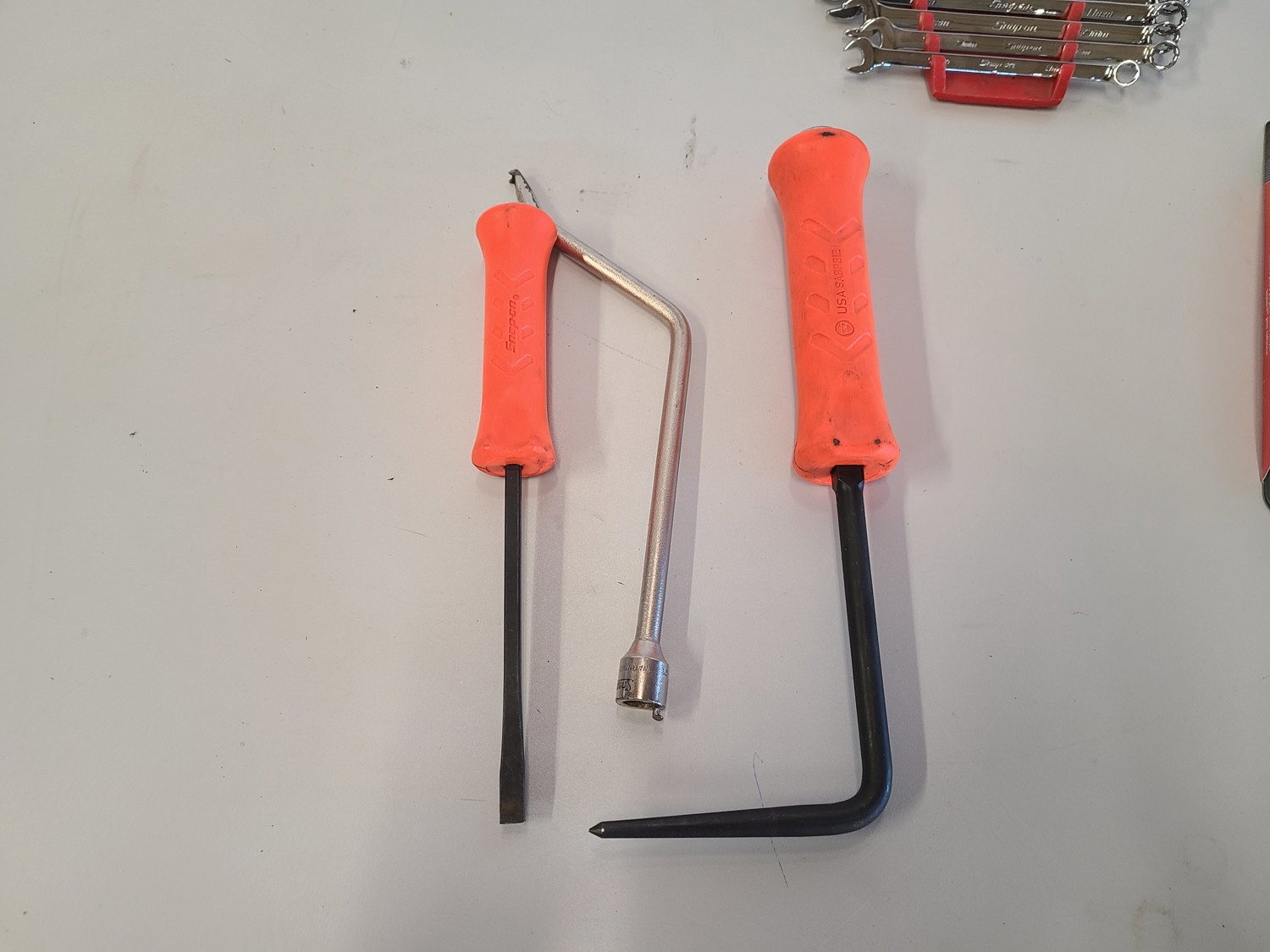 Metric wrenches, 3/8 inch metric sockets, 2 piece soft grip short radiator picks, screw drivers