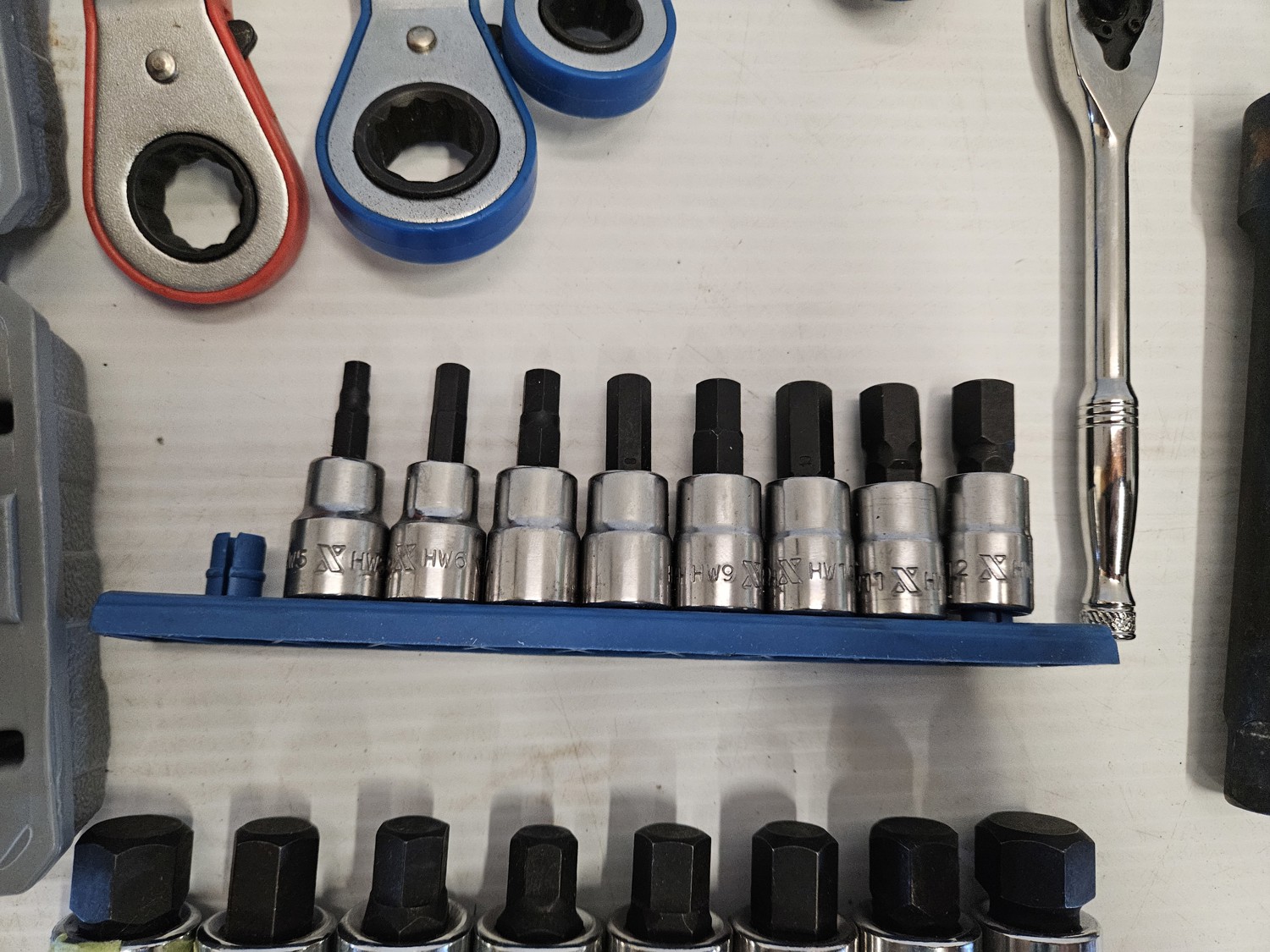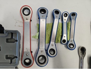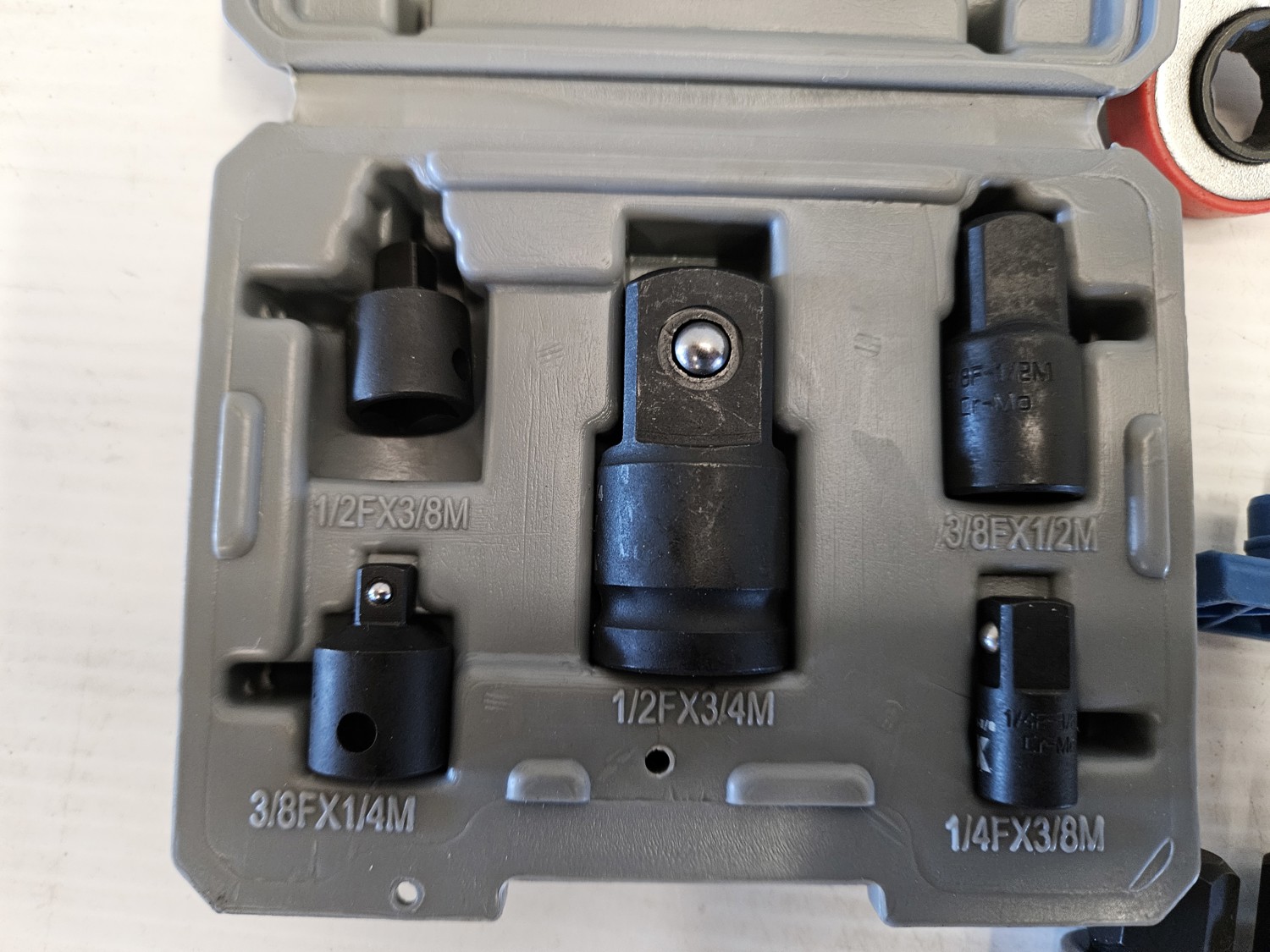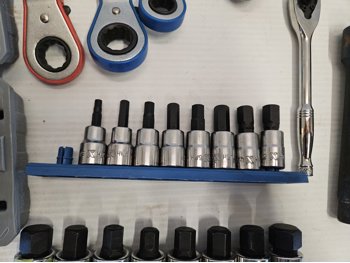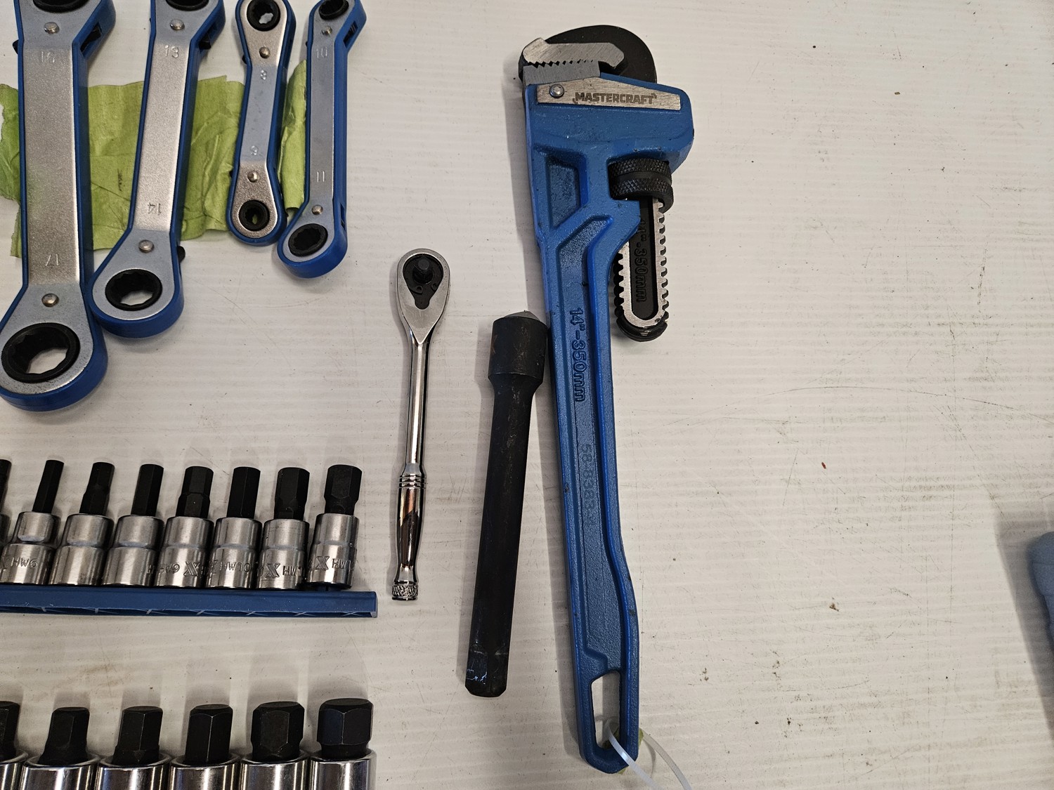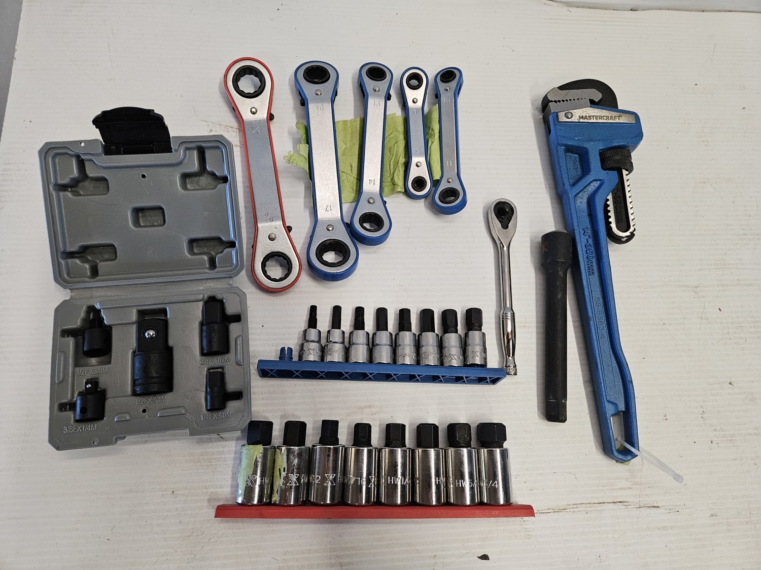 (1) socket adapter set 3/4 inch 5/8 inch 9/16 inch 1/2 inch 7/16 inch drive, (2) socket sets, (1) 1/4 inch ratchet, pipe wrench, speed wrench set
