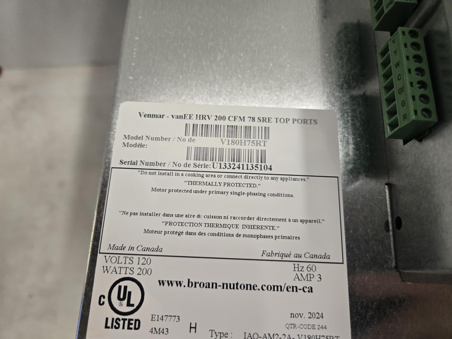 Venmar V160H8ORT Air Exchanger (Unused)