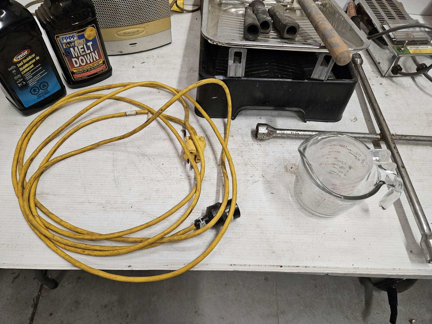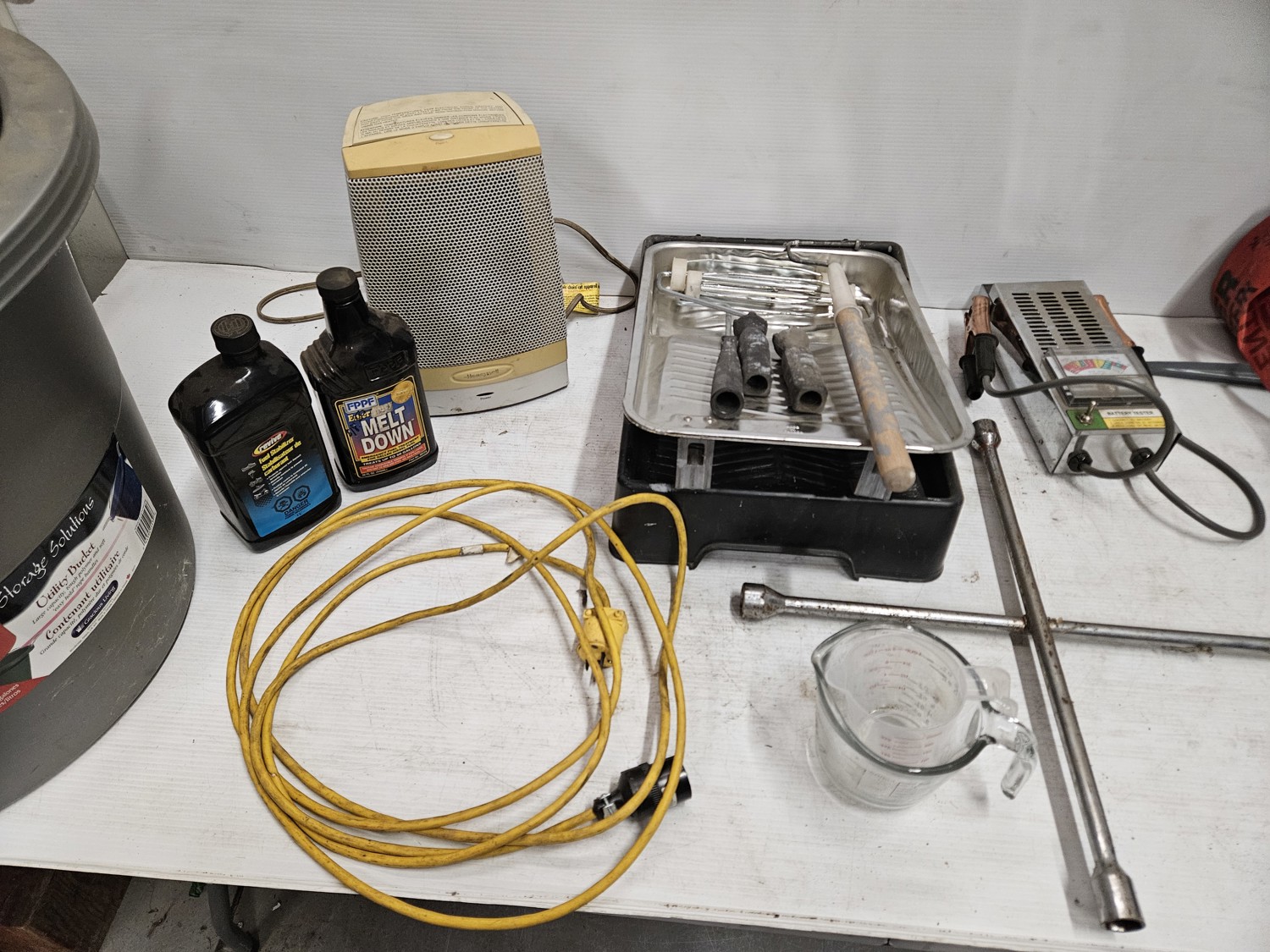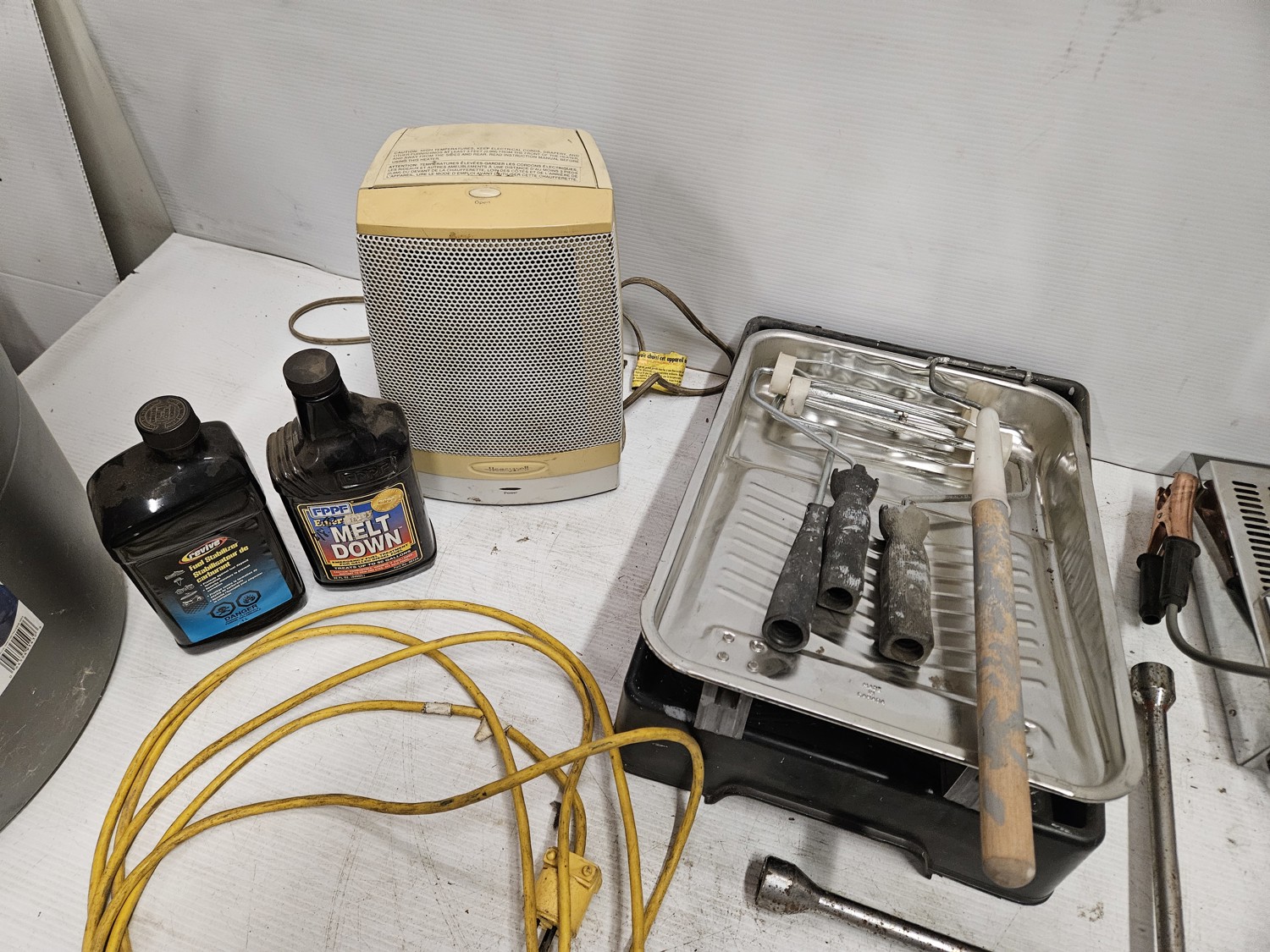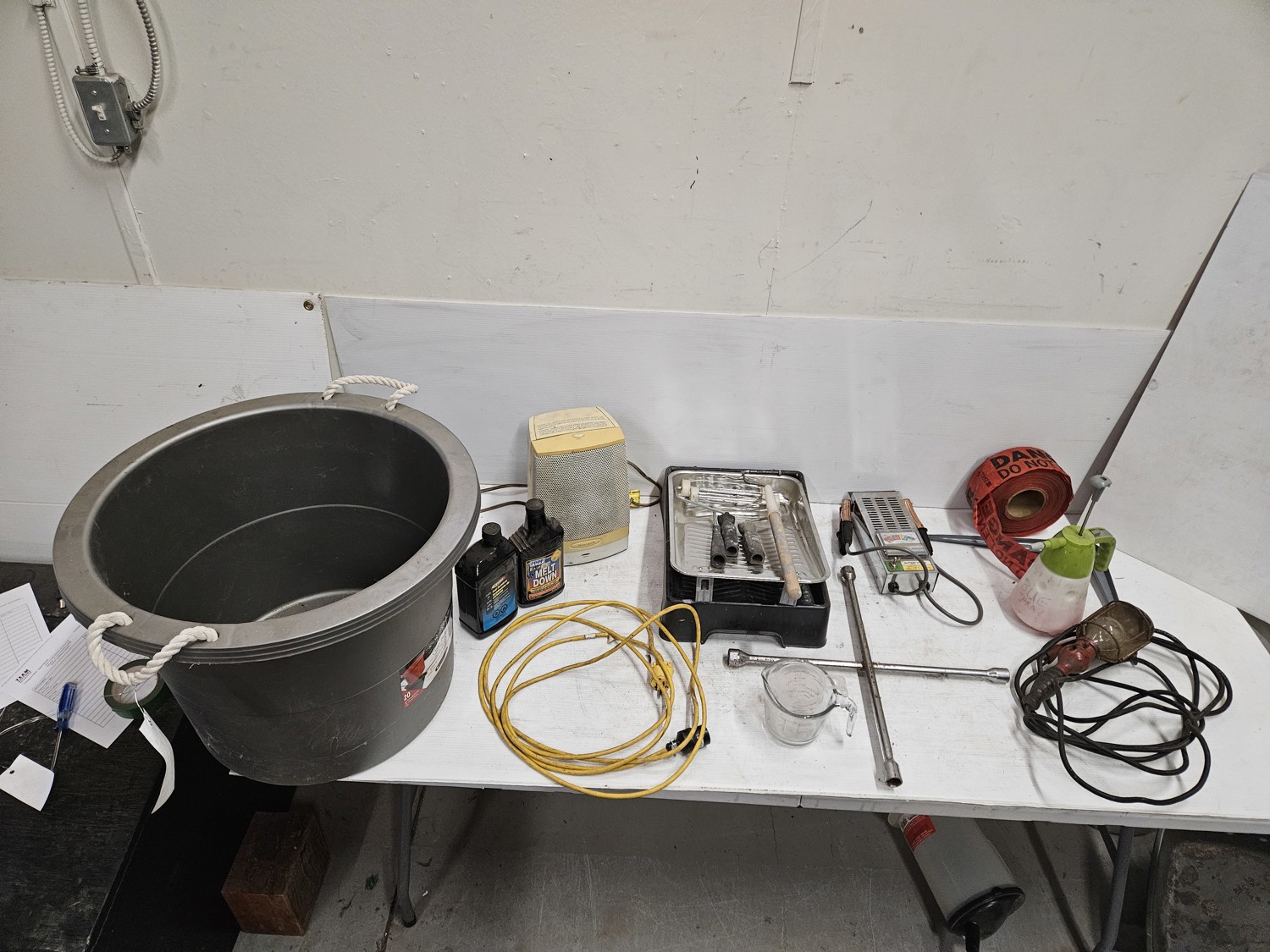 Space heater, fuel stabilizer, melt down, extension cord, measuring cups, paint trays, pump sprayer, work light, bungie cords, large tote