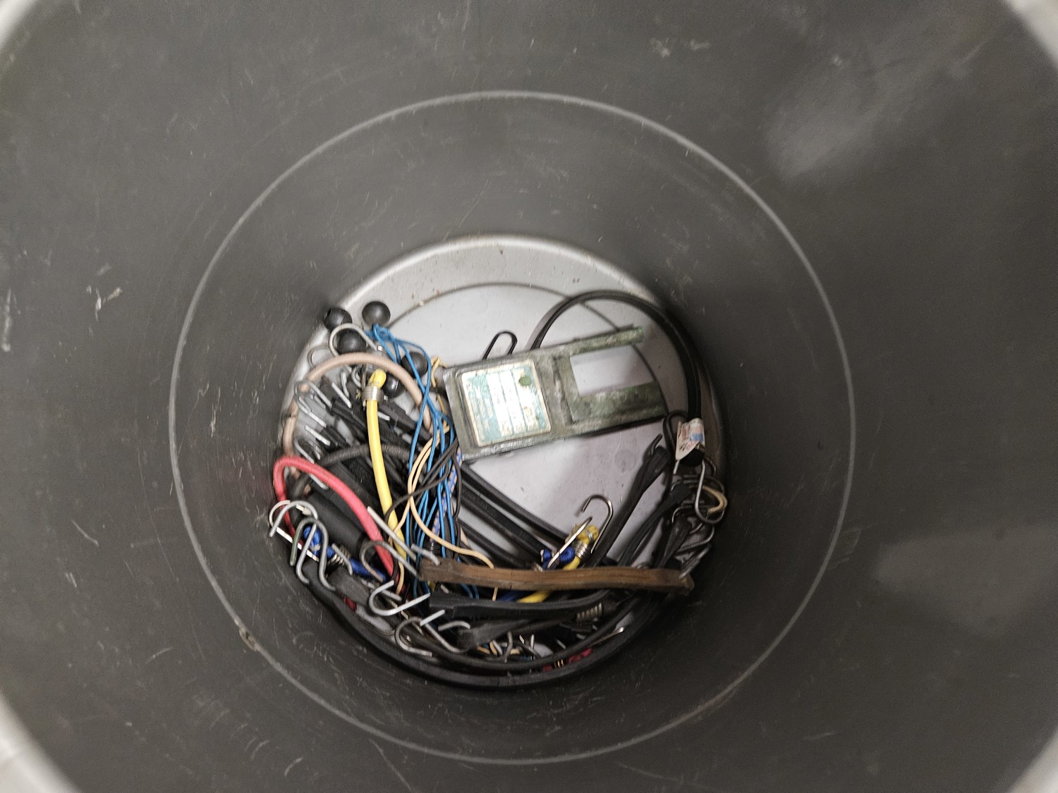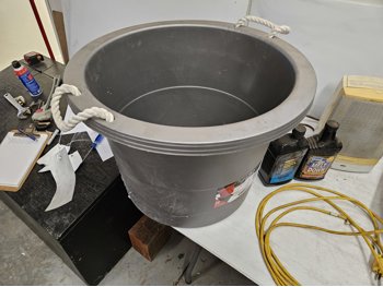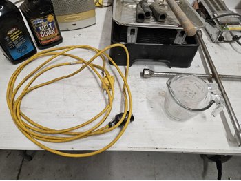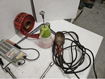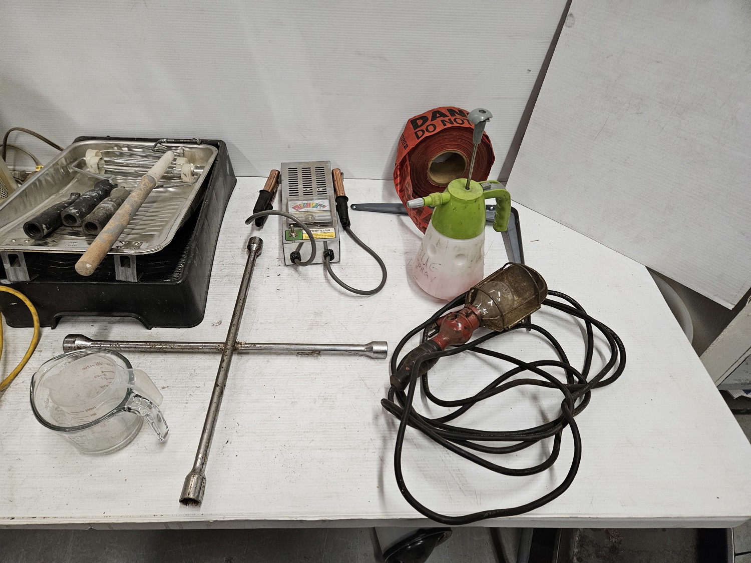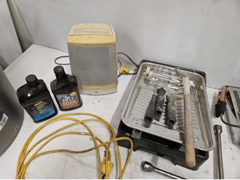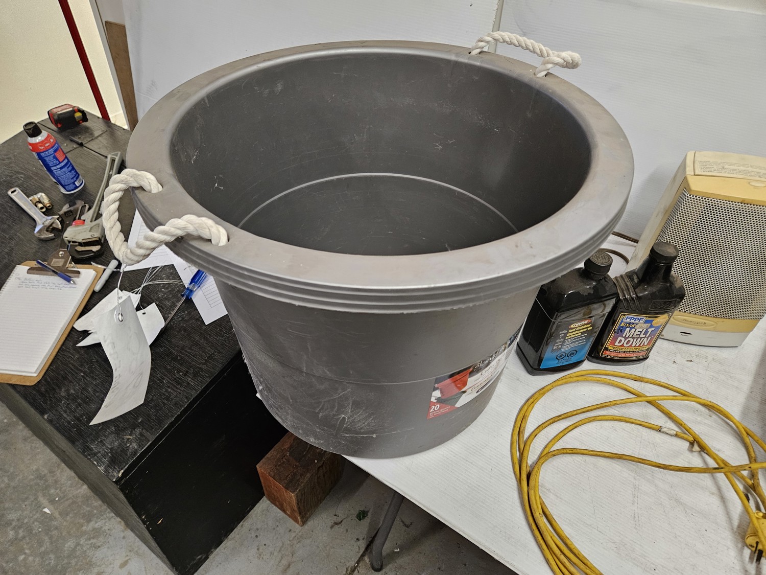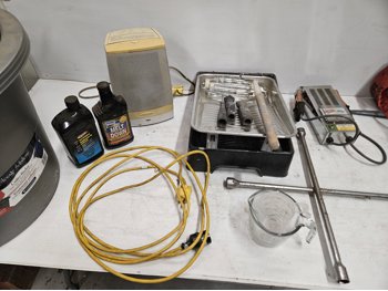 Space heater, fuel stabilizer, melt down, extension cord, measuring cups, paint trays, pump sprayer, work light, bungie cords, large tote