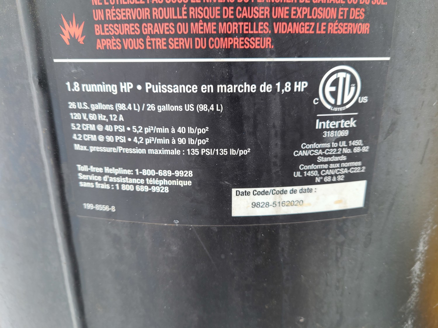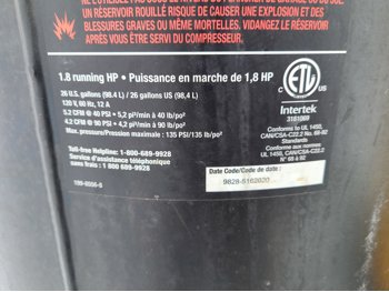 Mastercraft- 26 gallon, 90PSI,120V