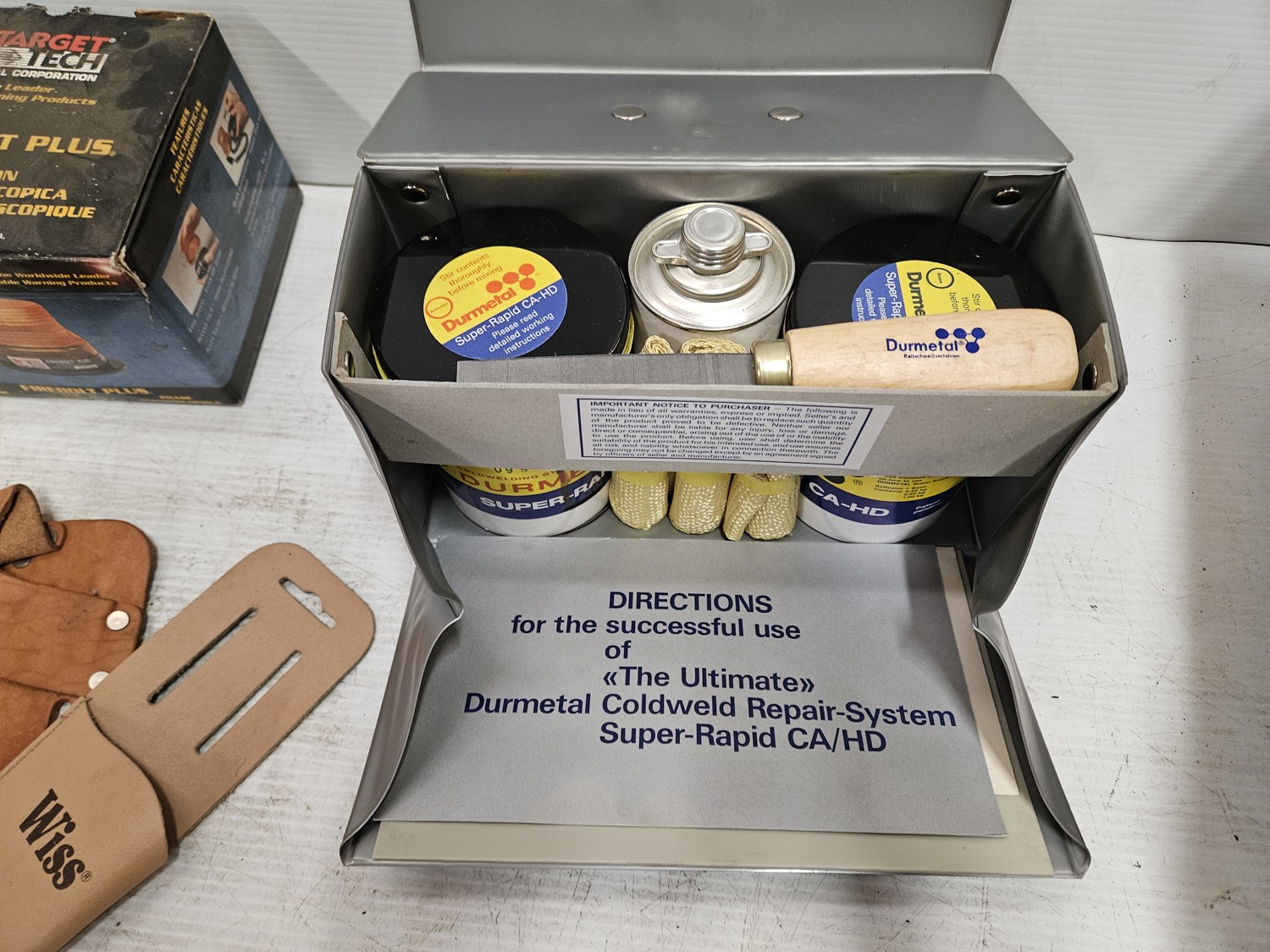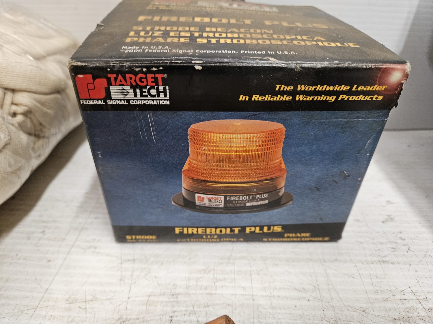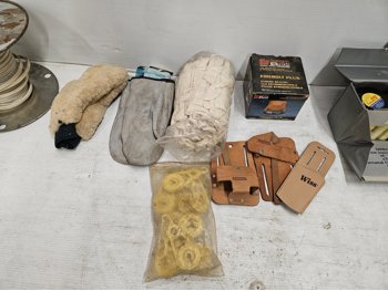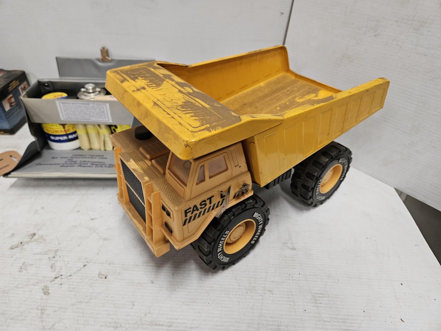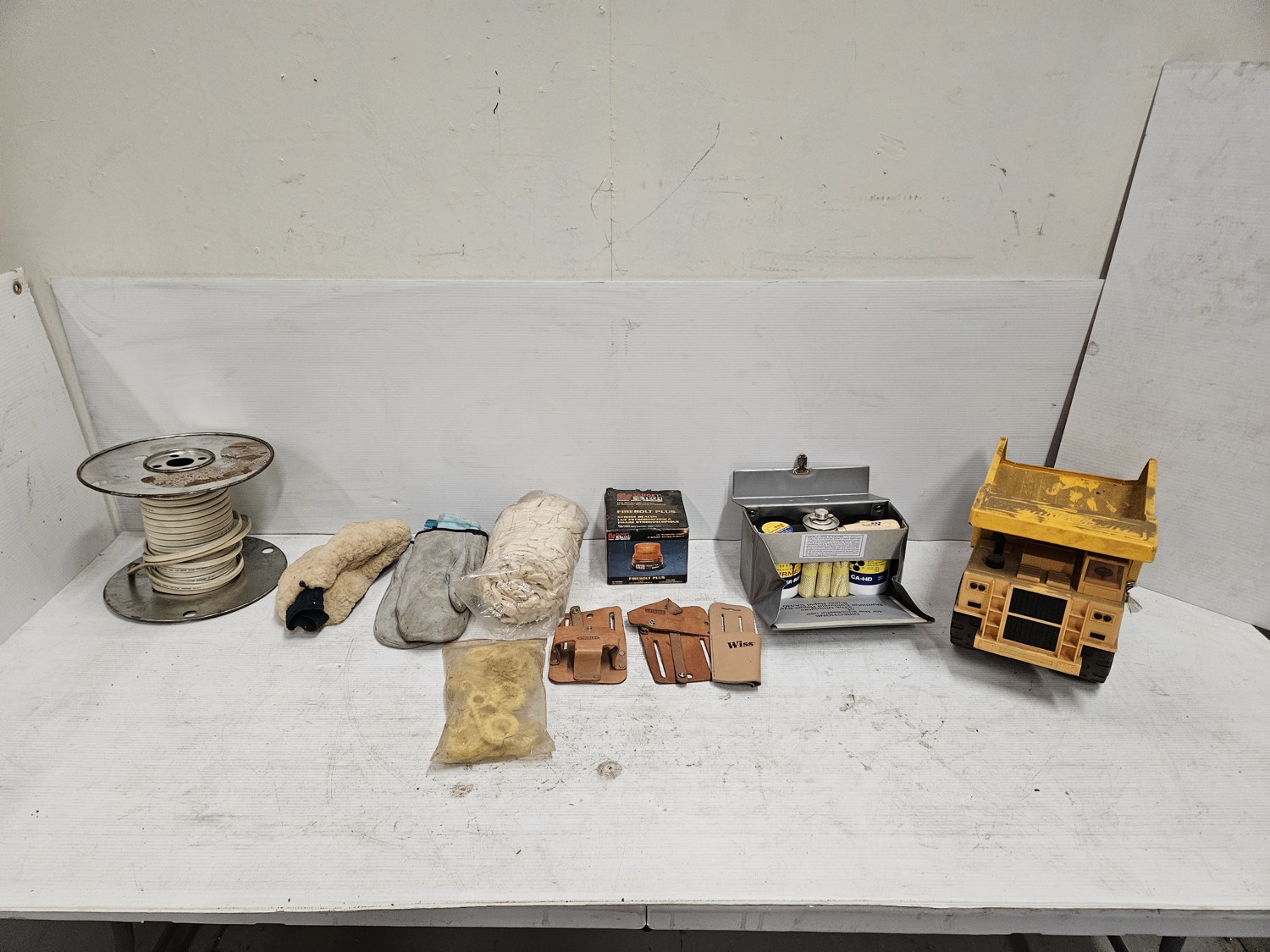 Beacon light, gloves, wash mit, roll of electrical cable, mighty wheels dump truck toy