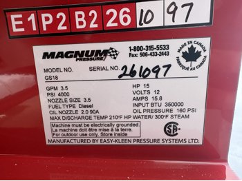 3.5 GPM at 4000 PSI, 15 HP, gasoline engine, electric start, 12 volt burner, oil/diesel fired burned/thermostat, schedule 80 coil with stainless steel housing, fully welded, powder coated frame, 10 gallon poly fuel tank, 30 ft hose and wand