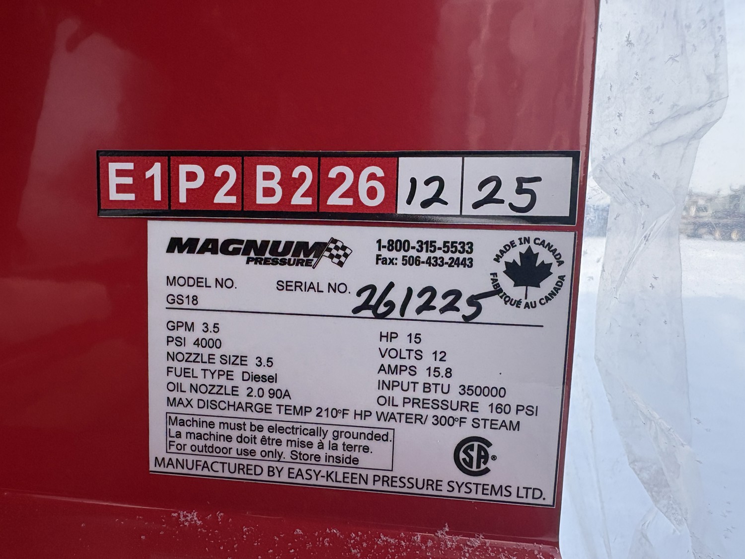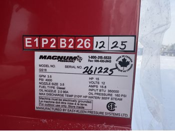 3.5 GPM at 4000 PSI, 15 HP, gasoline engine, electric start, 12 volt burner, oil/diesel fired burned/thermostat, schedule 80 coil with stainless steel housing, fully welded, powder coated frame, 10 gallon poly fuel tank, 30 ft hose and wand