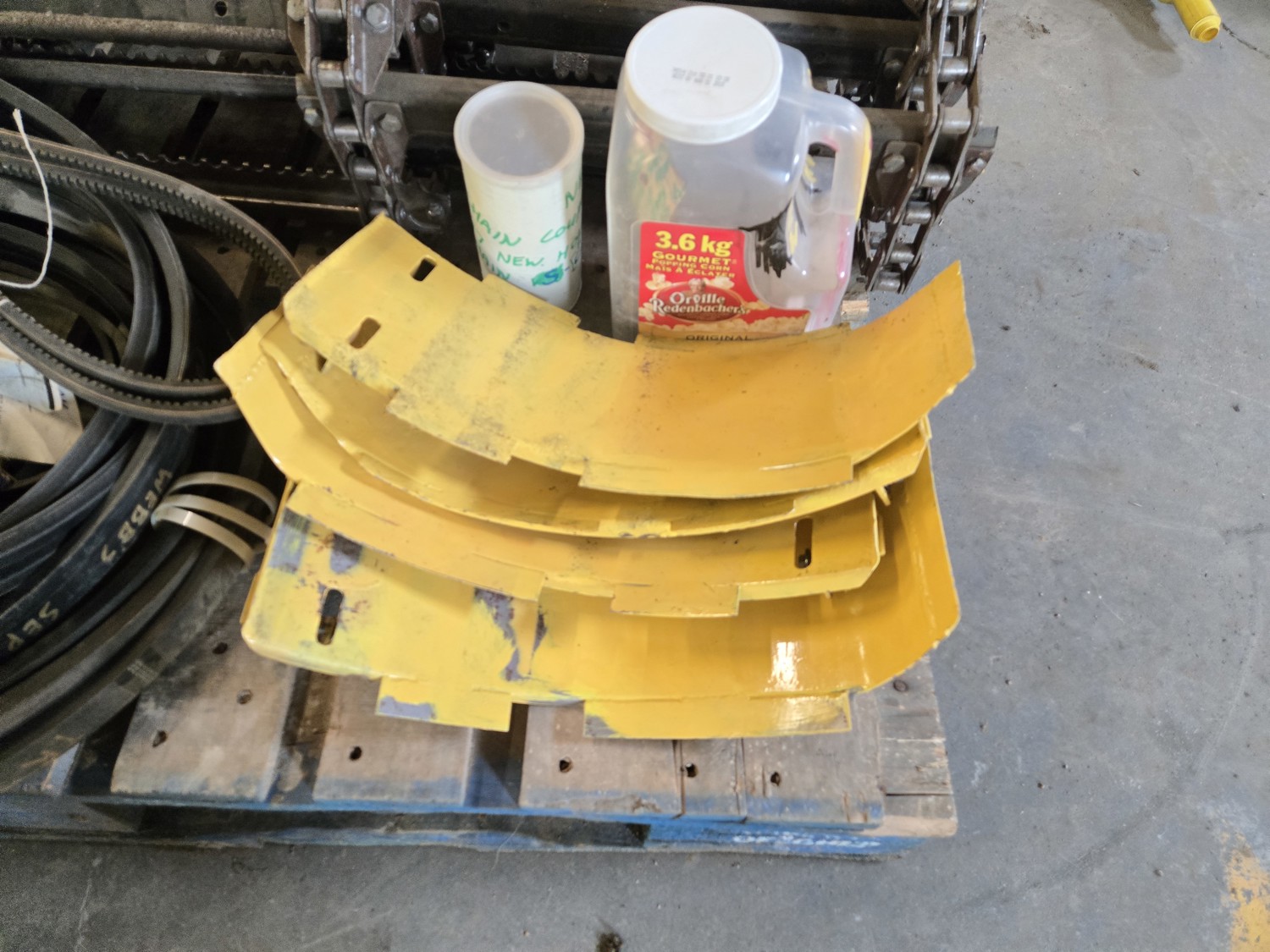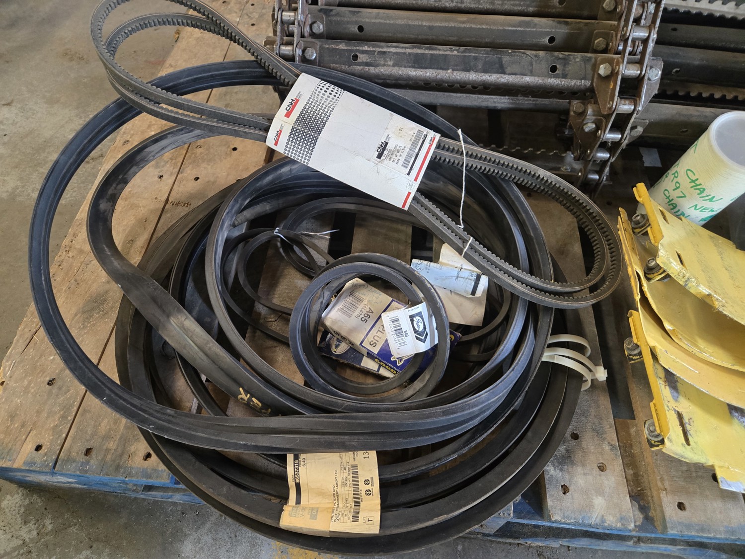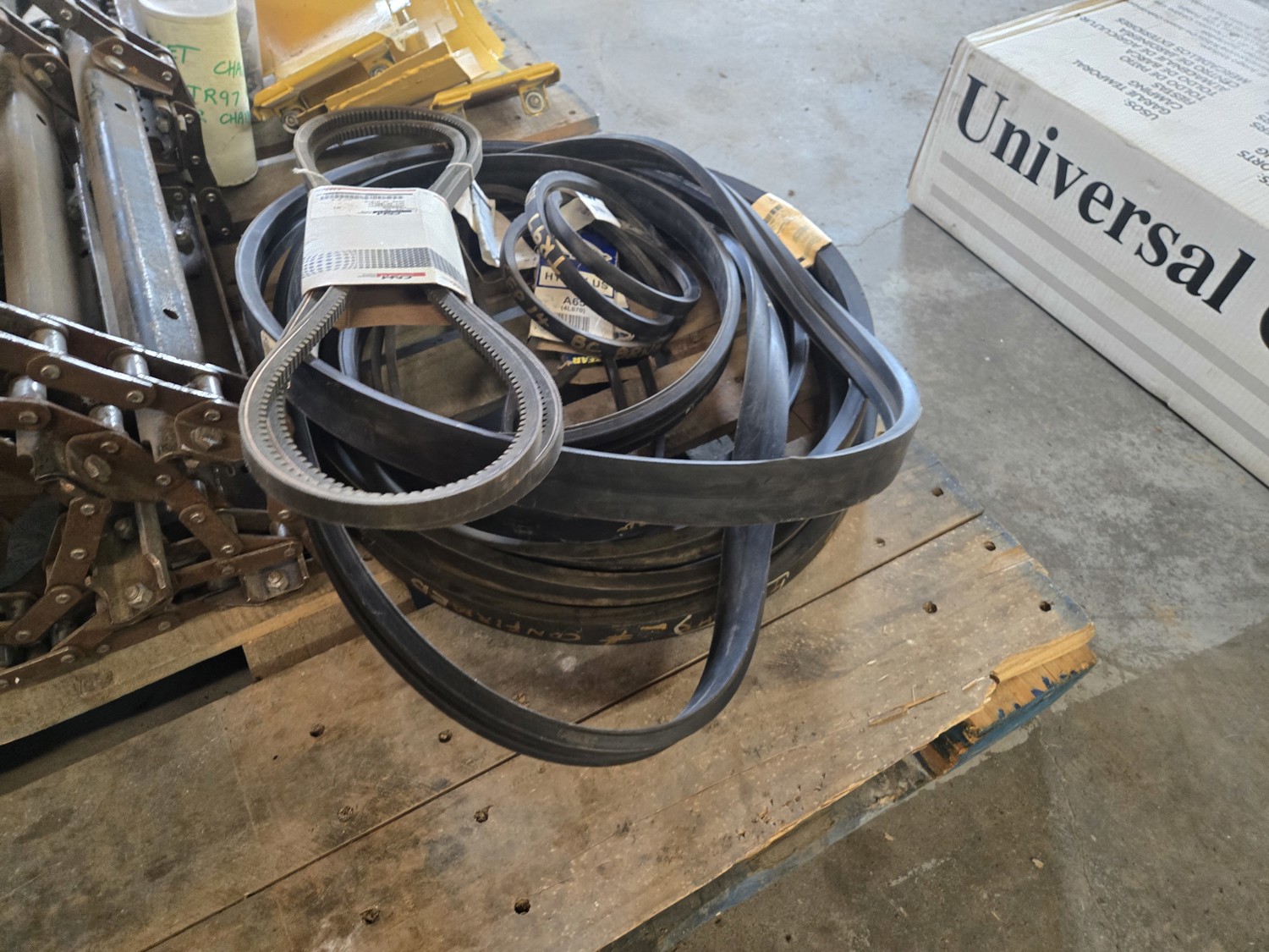feeder chain with 268 hrs, elevator bottom inspection covers, qty of various unused belts