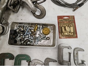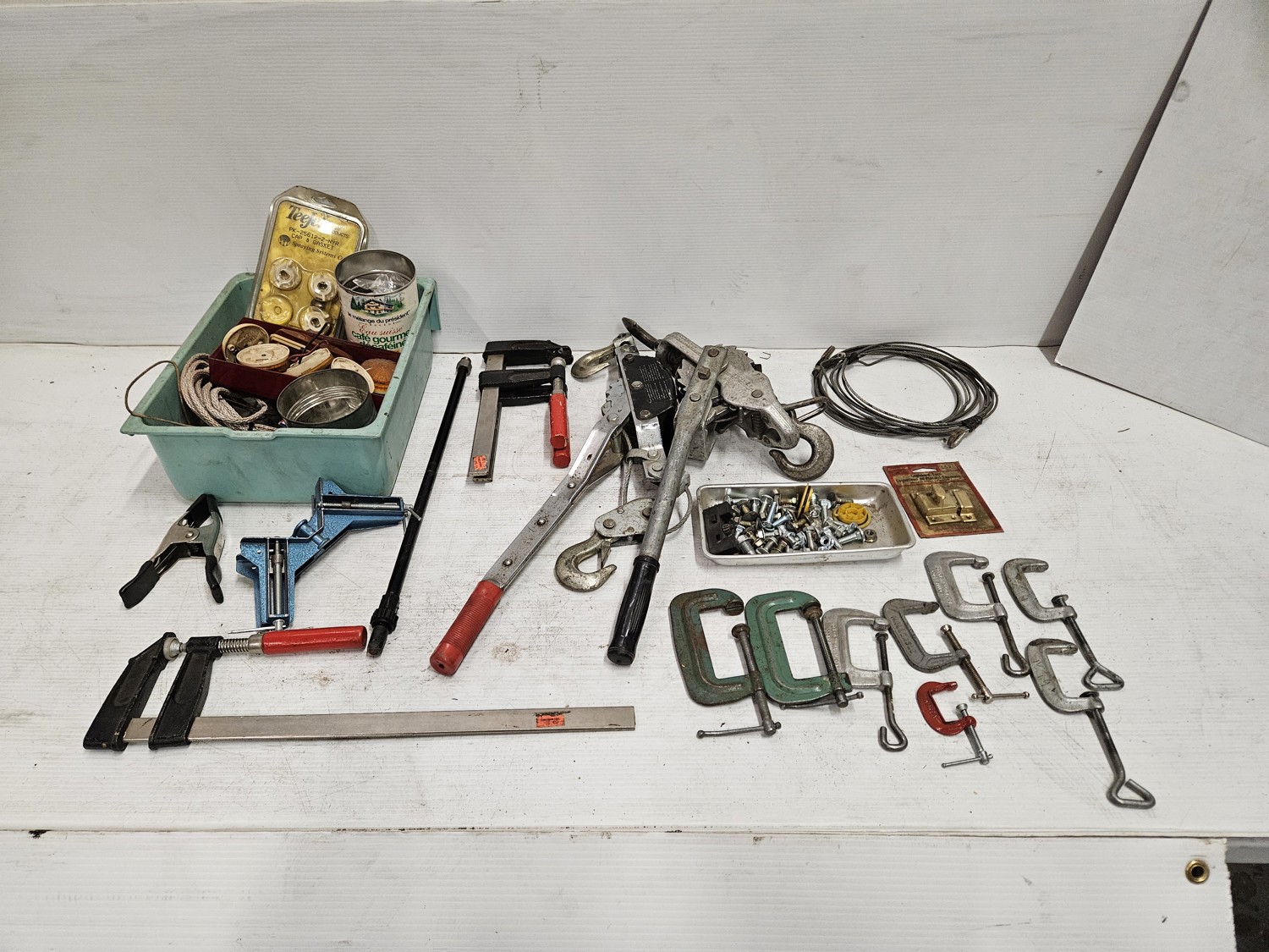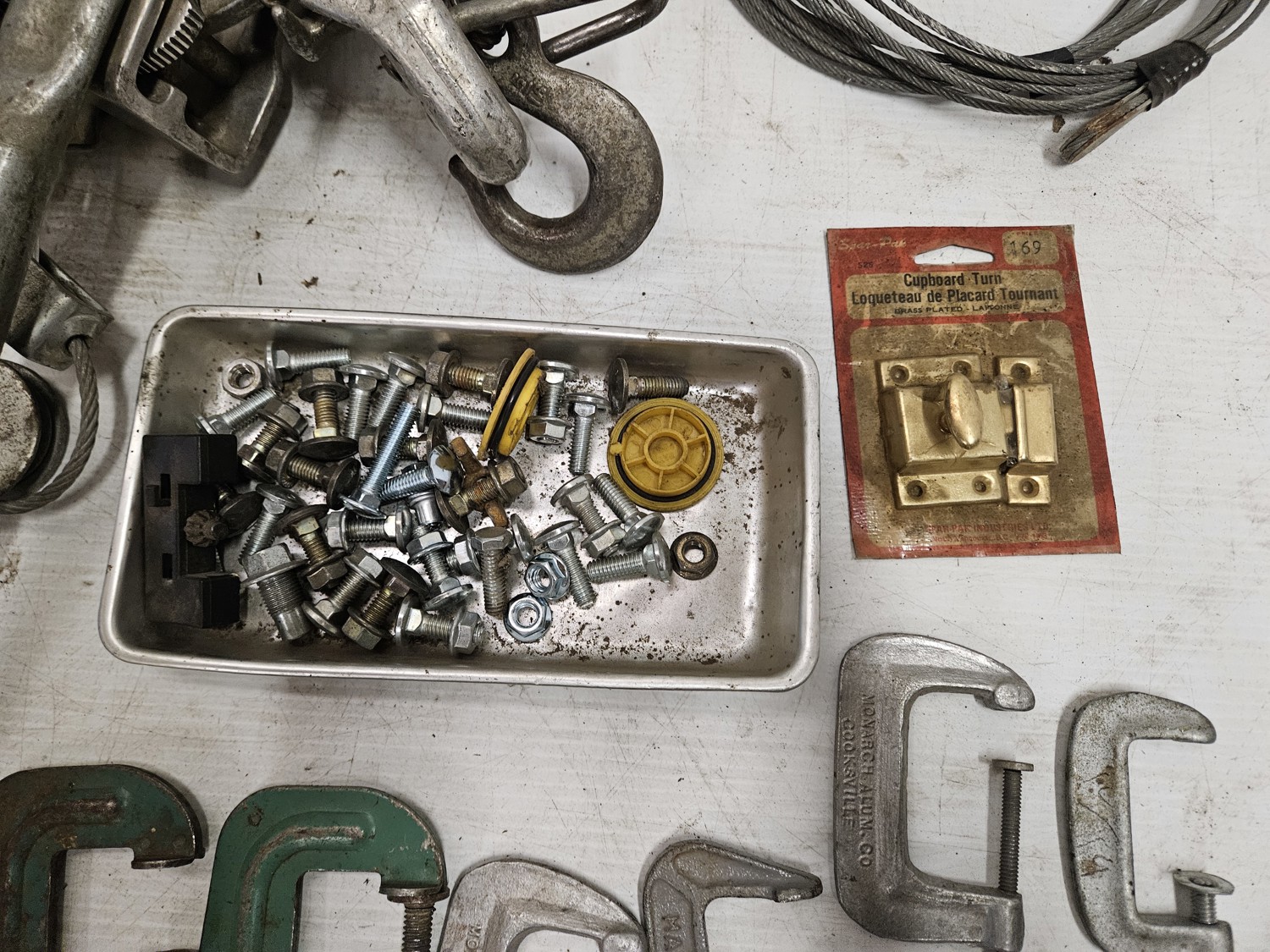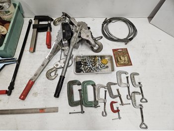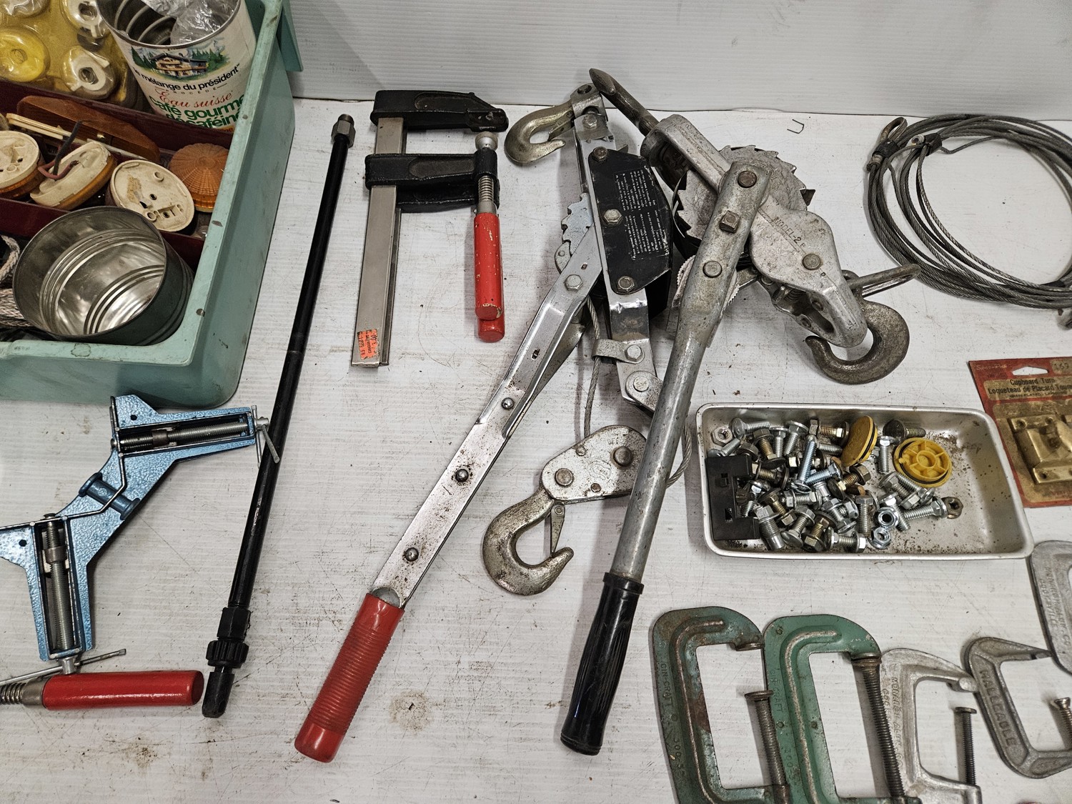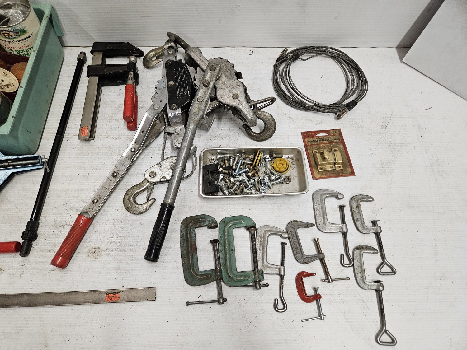 (2) come a-longs, c-clamps, cable, clamps, screws, nuts, bolts