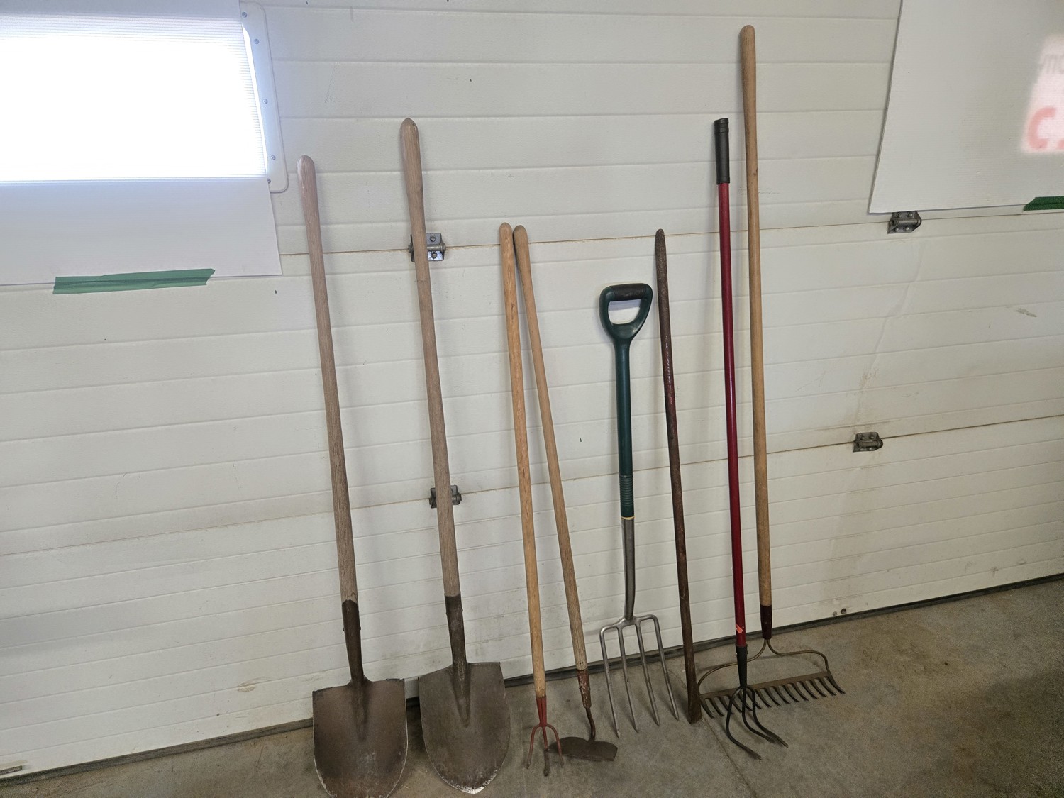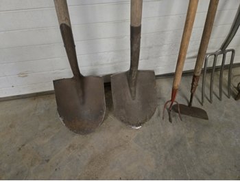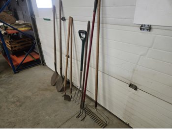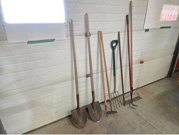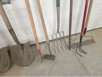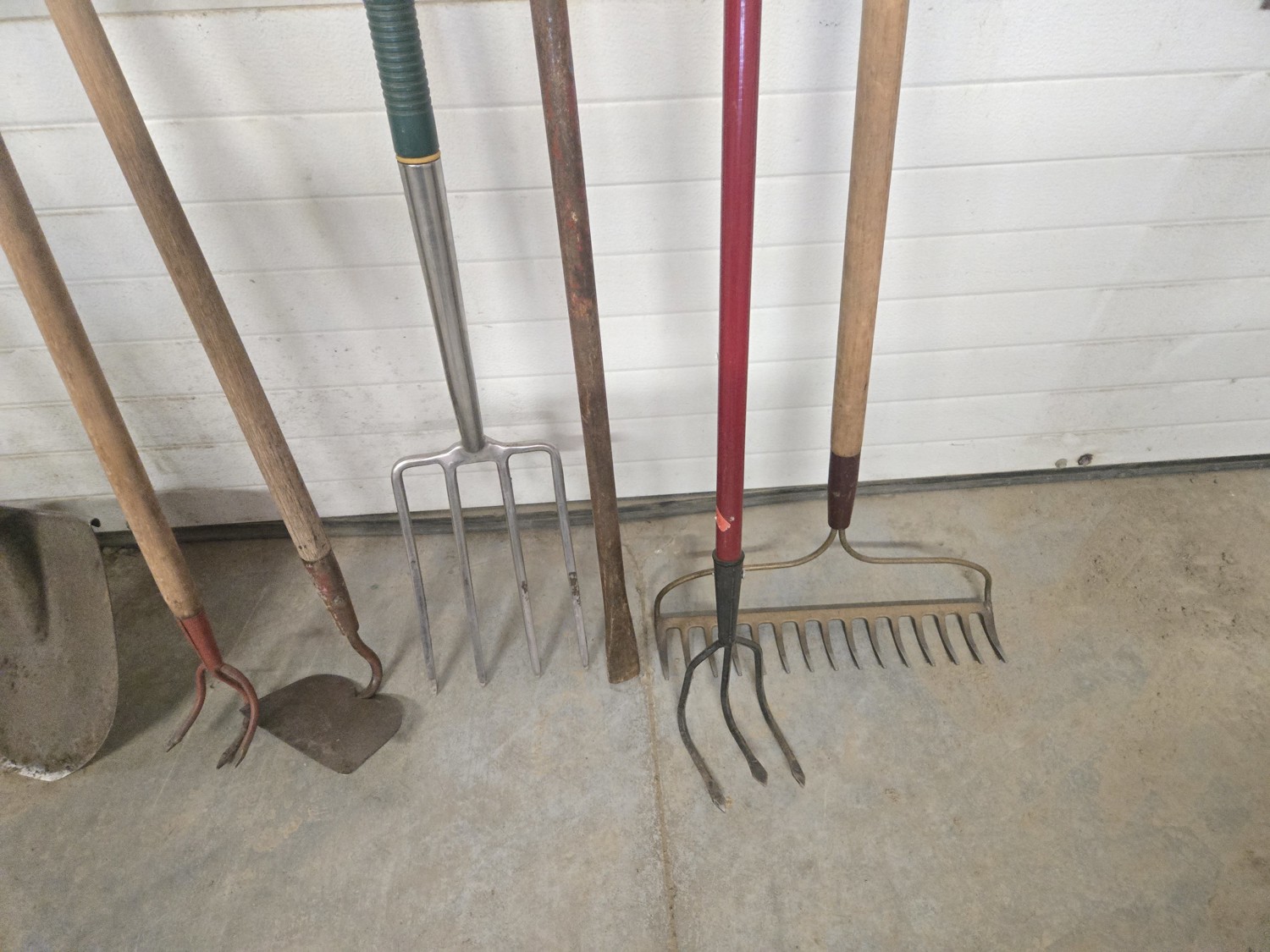 (2) spades, (2) hand weeders, (1) potato fork, (1) crow bar, (1) hoe, (1) rake