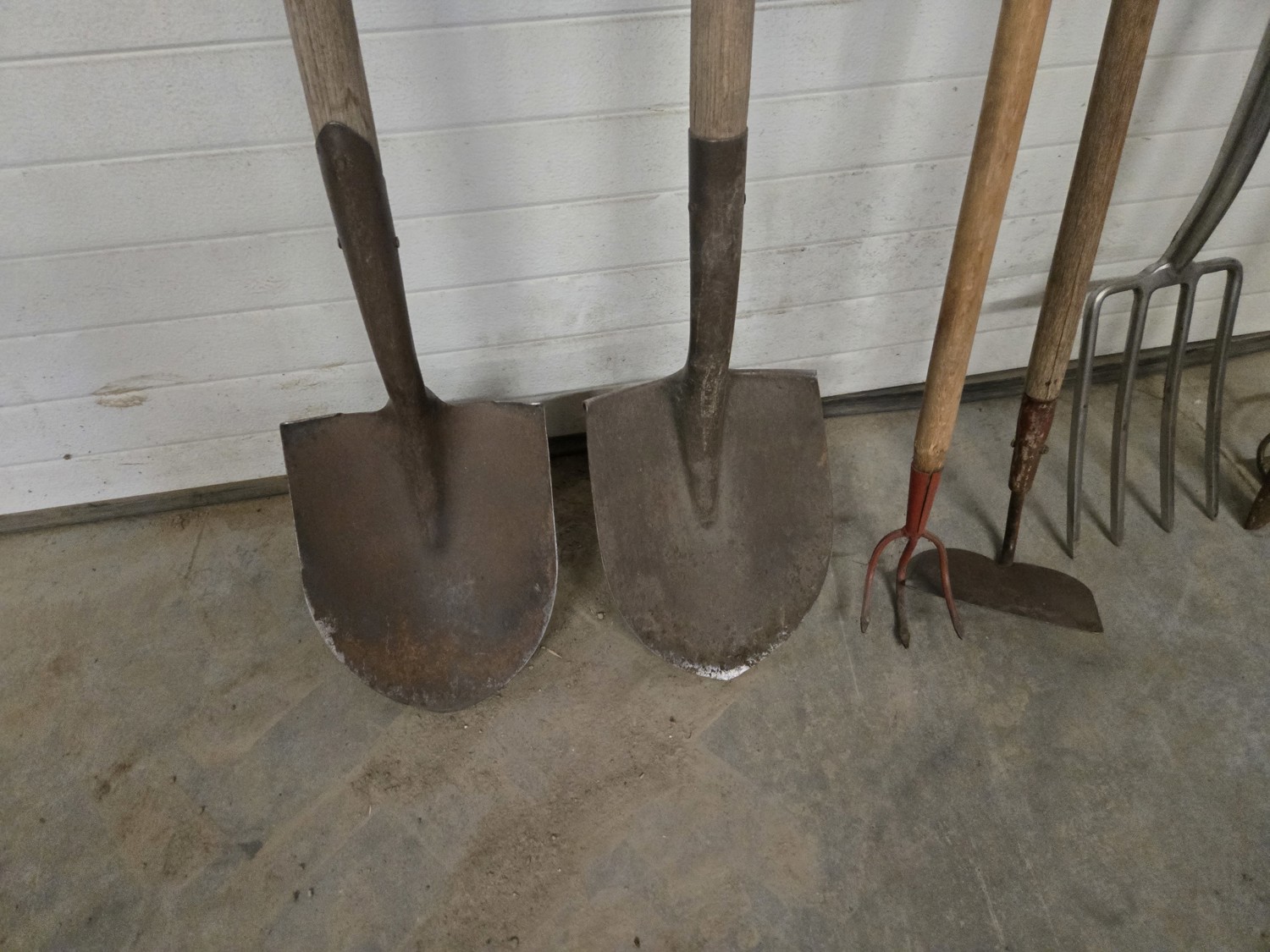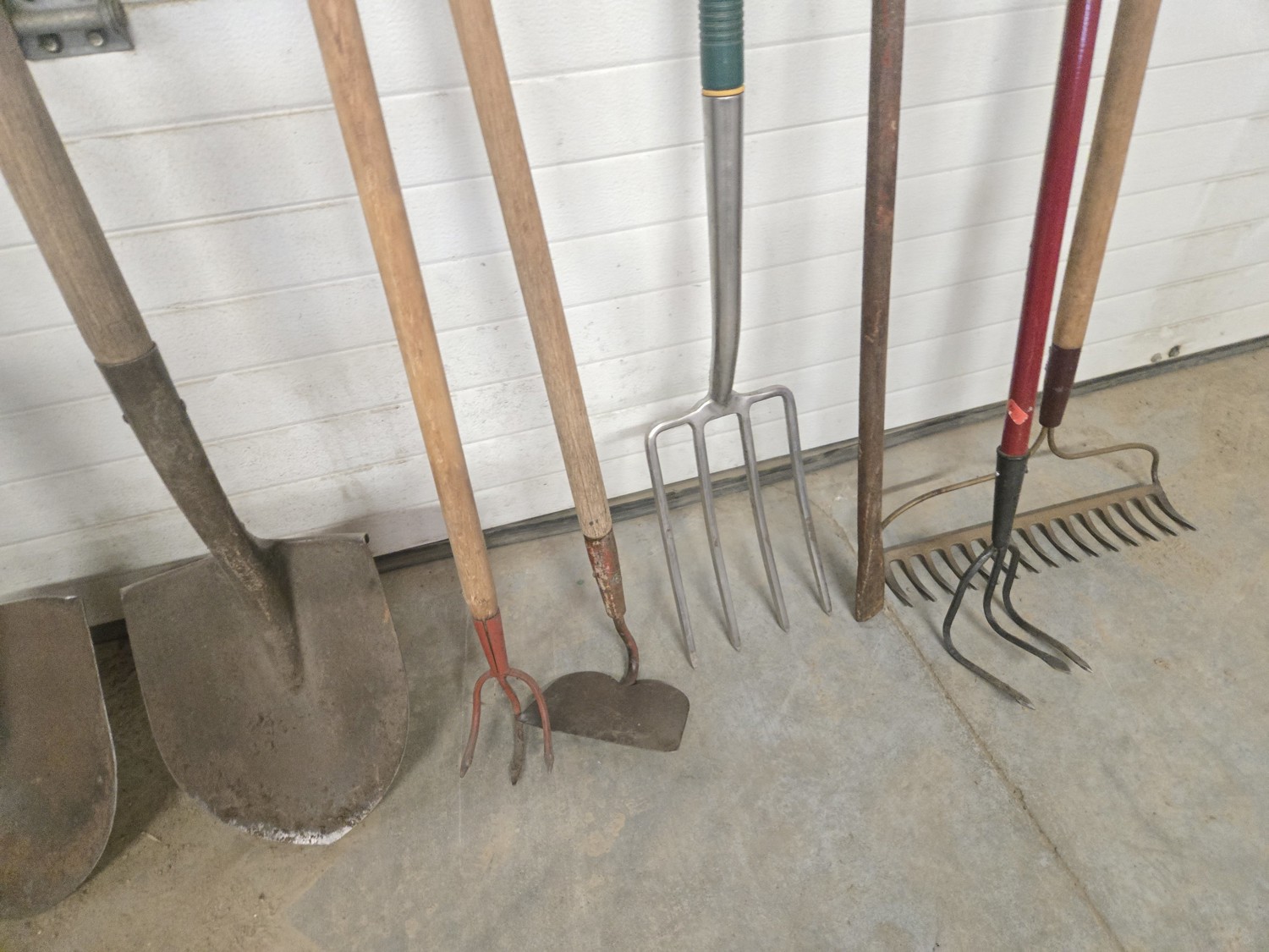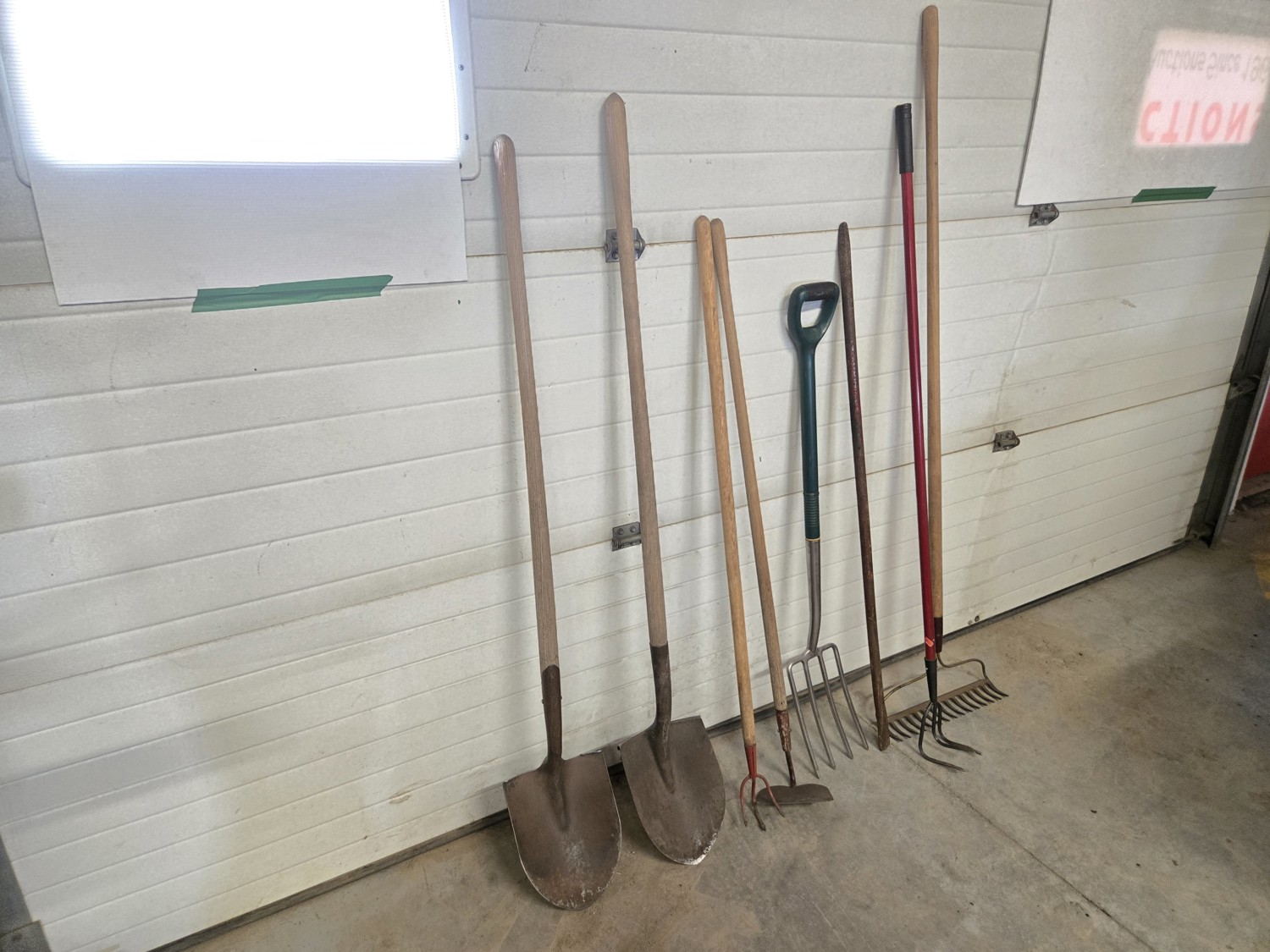 (2) spades, (2) hand weeders, (1) potato fork, (1) crow bar, (1) hoe, (1) rake