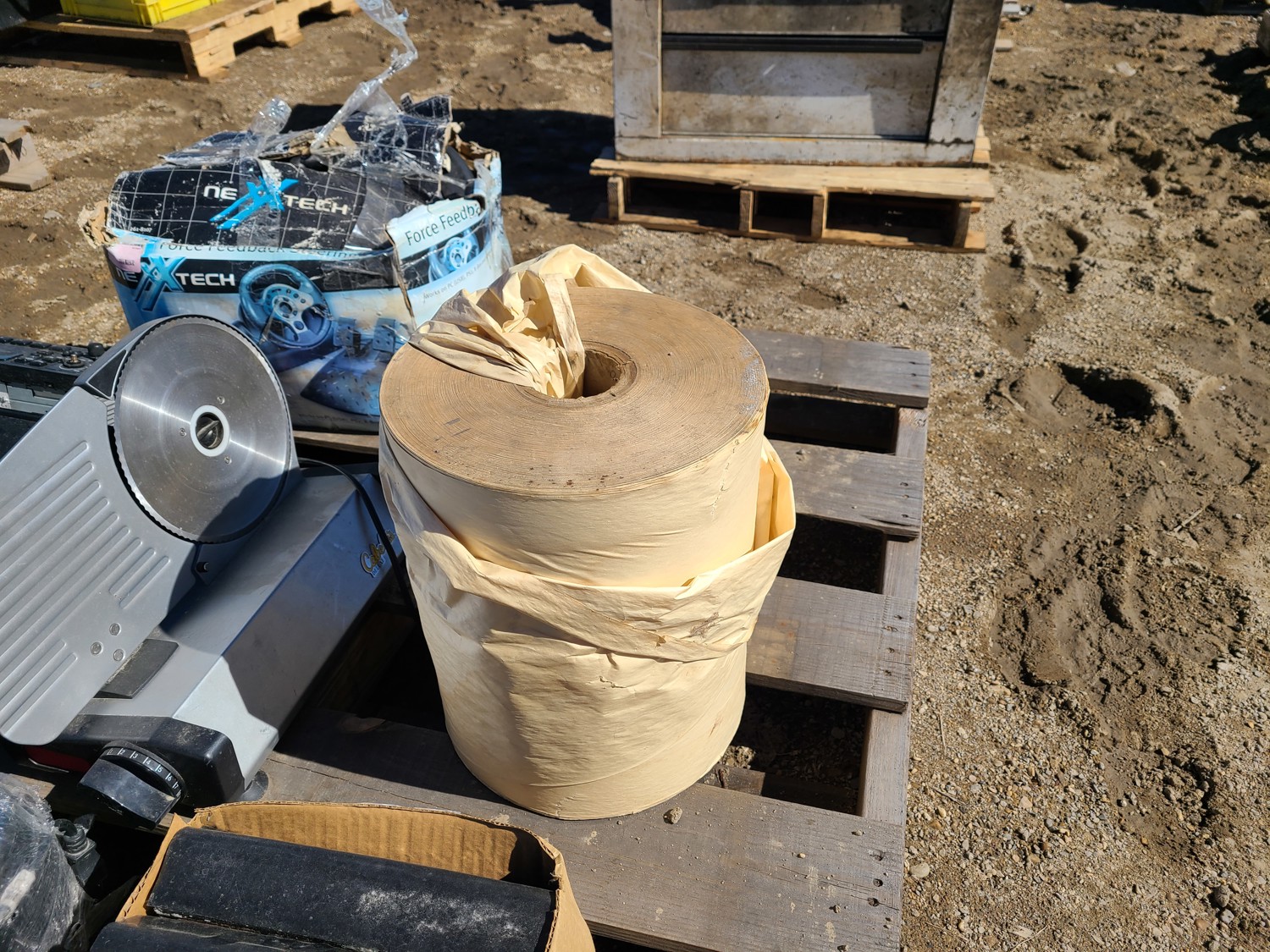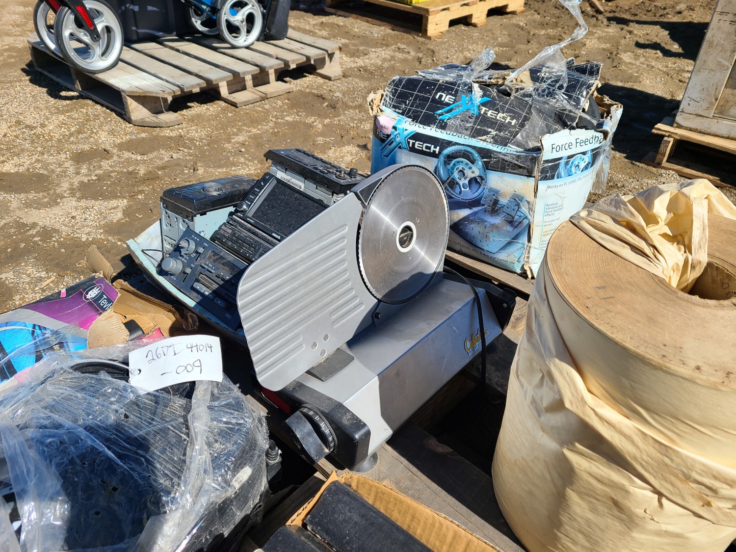 Qty of car stereos, steering wheel lock, gaming race wheel, meat cutter, wrap of paper, qty of service manuals, projector