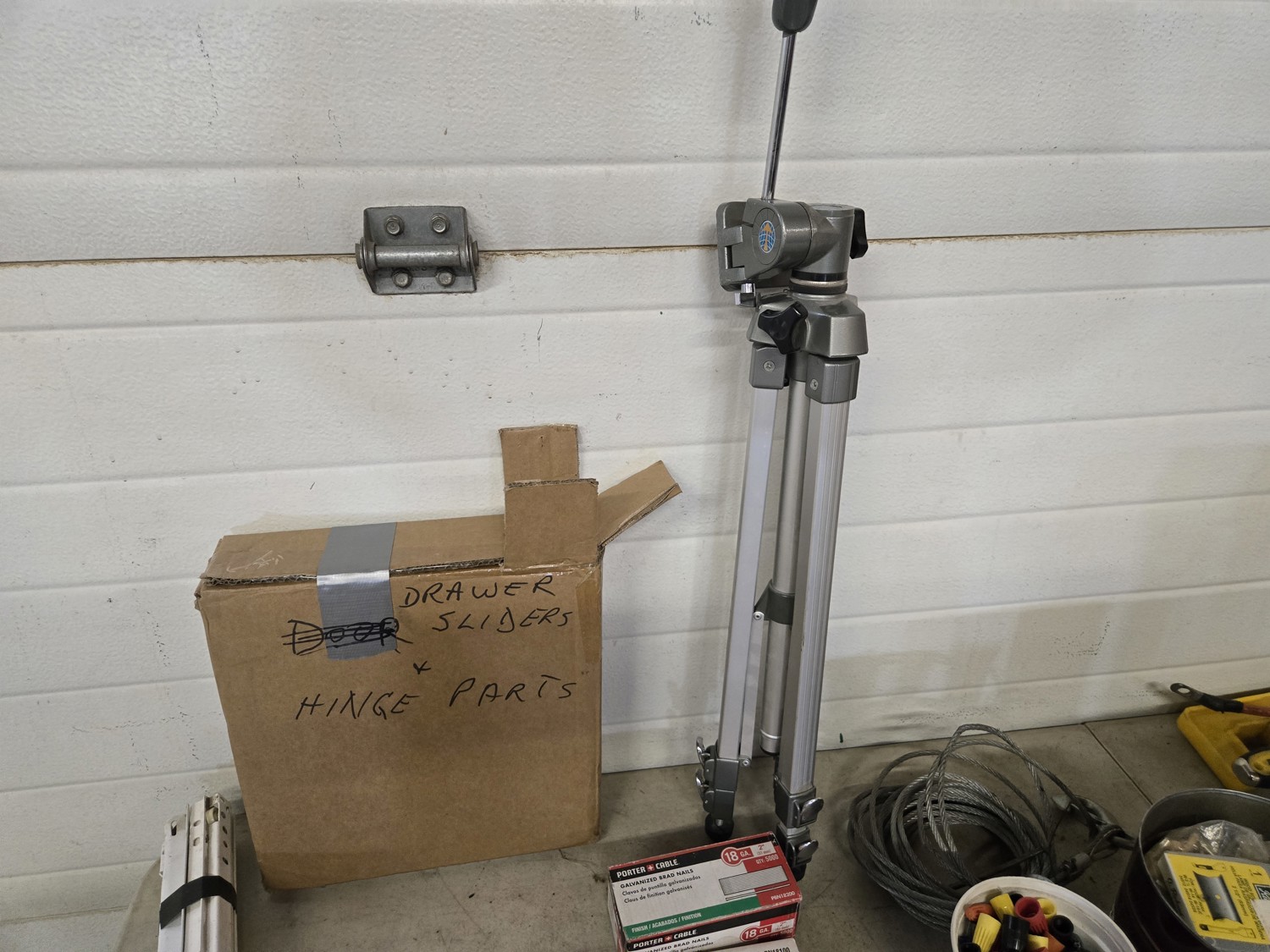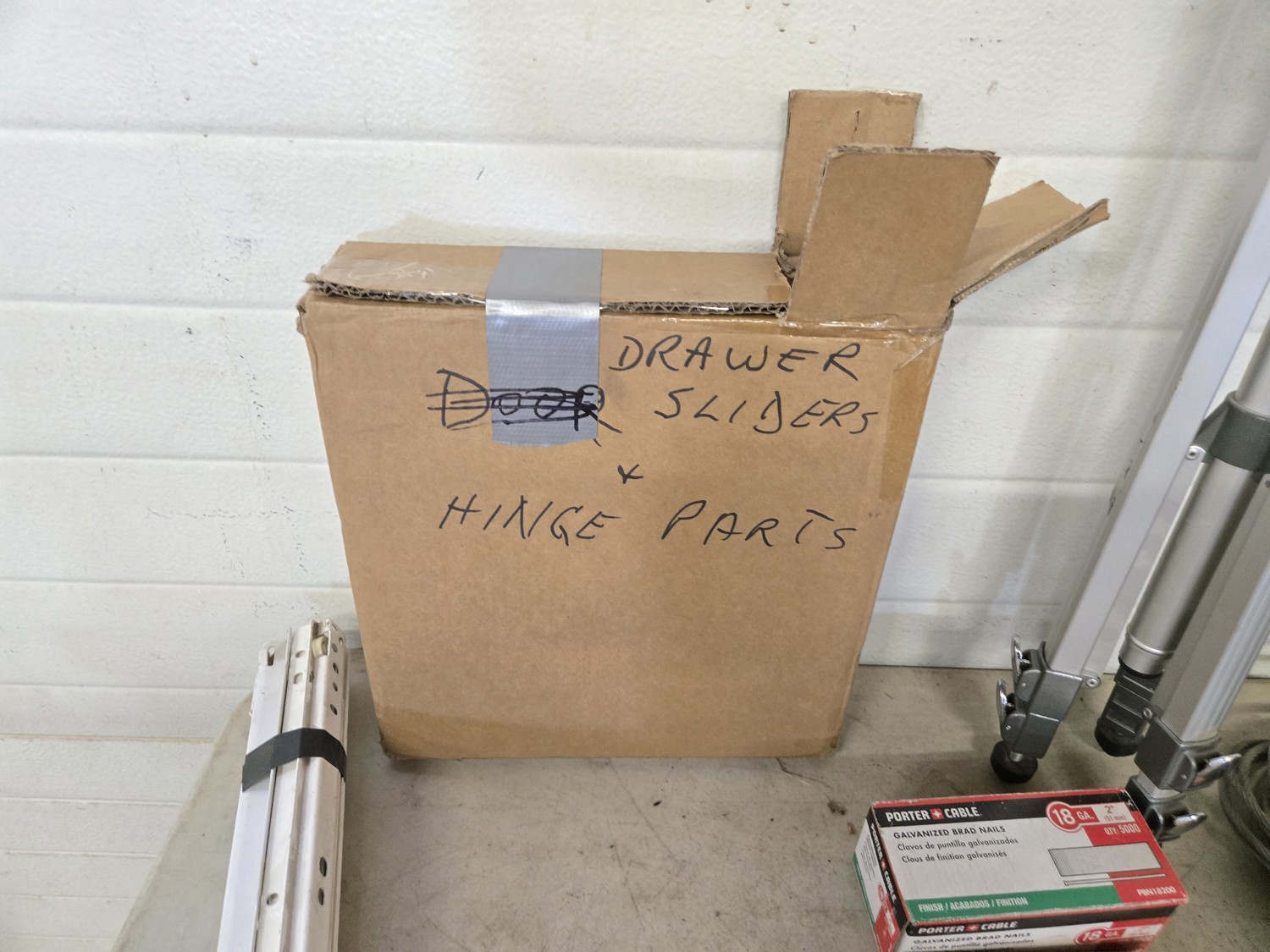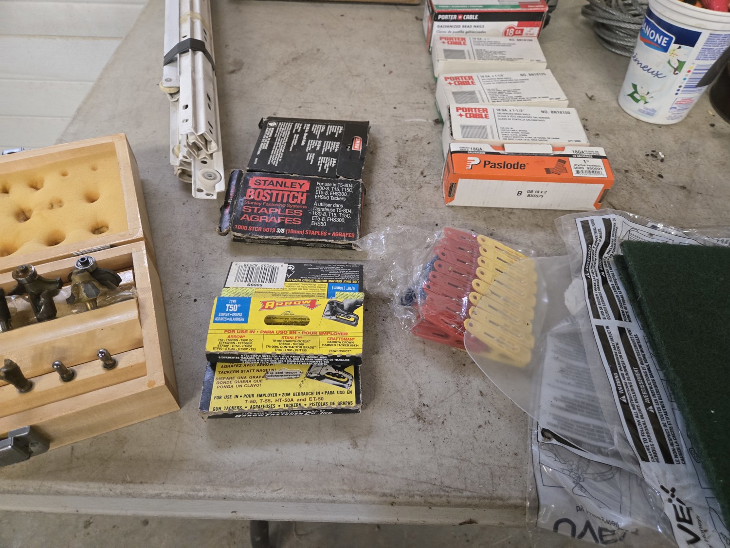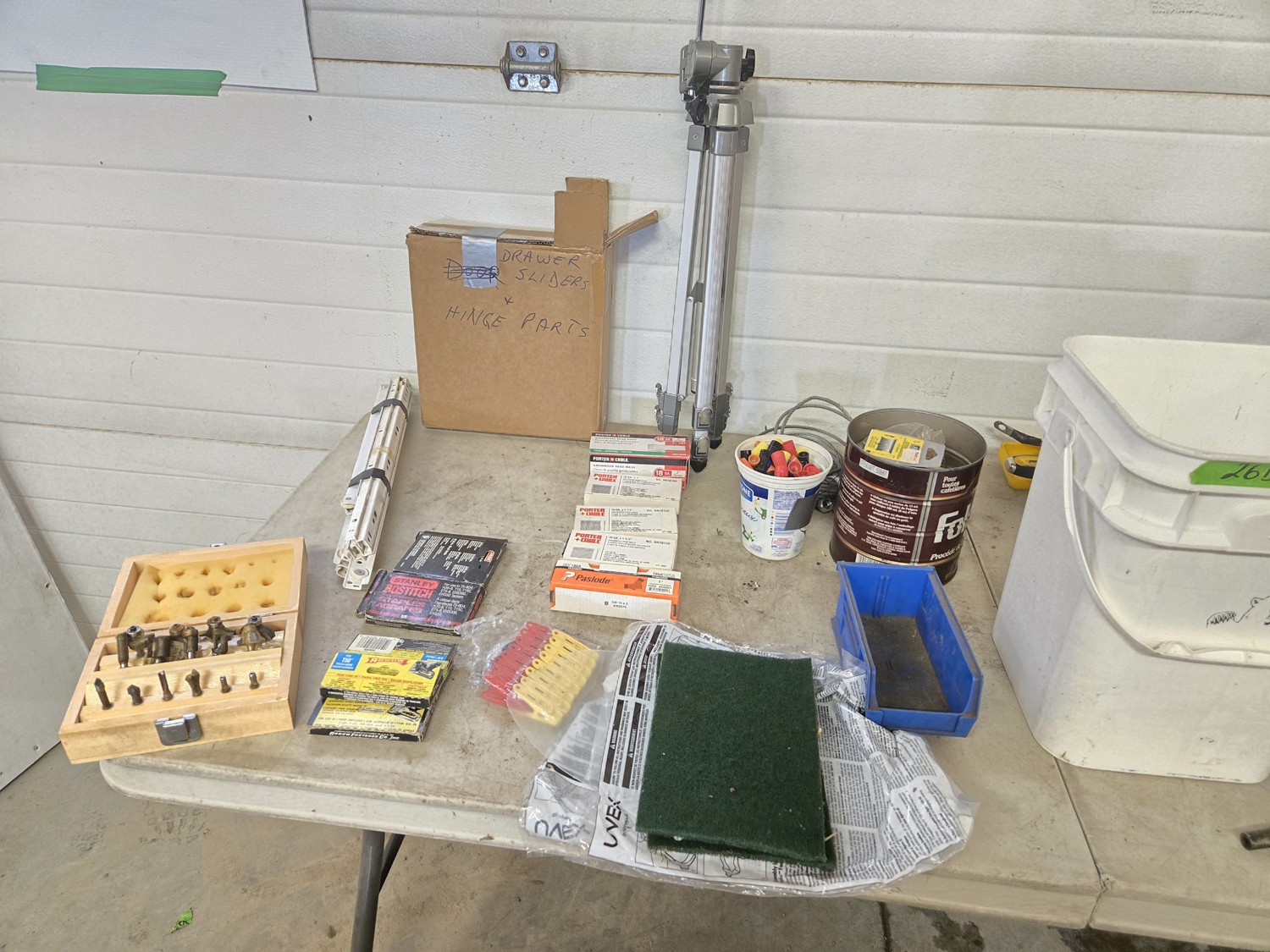 Router bit kit, marette's, qty of brad nails, & staples, cable, tripod, (2) replacement face shield's, cabinet parts, miscellaneous items