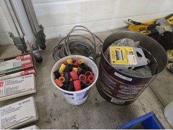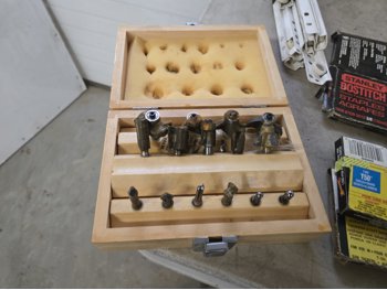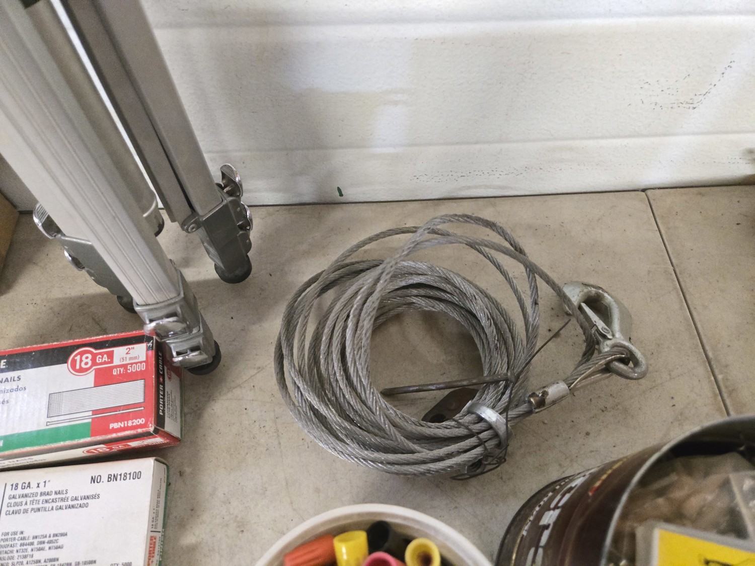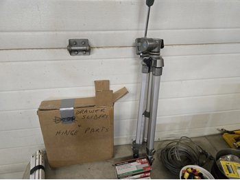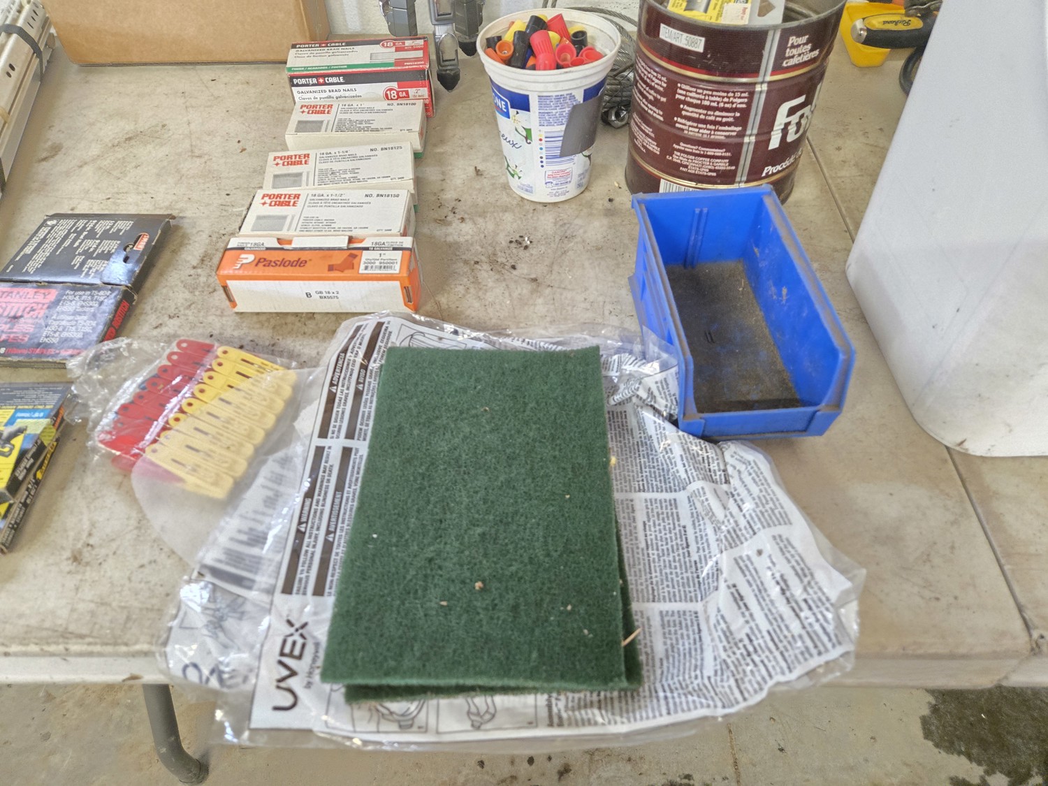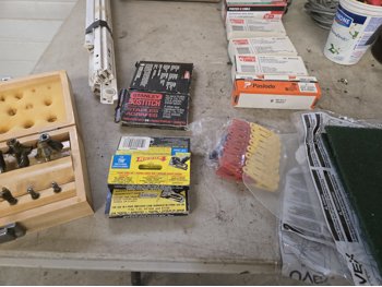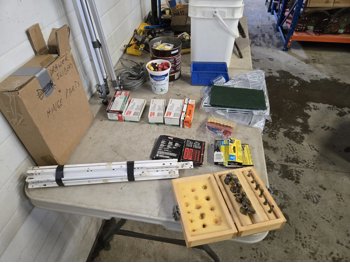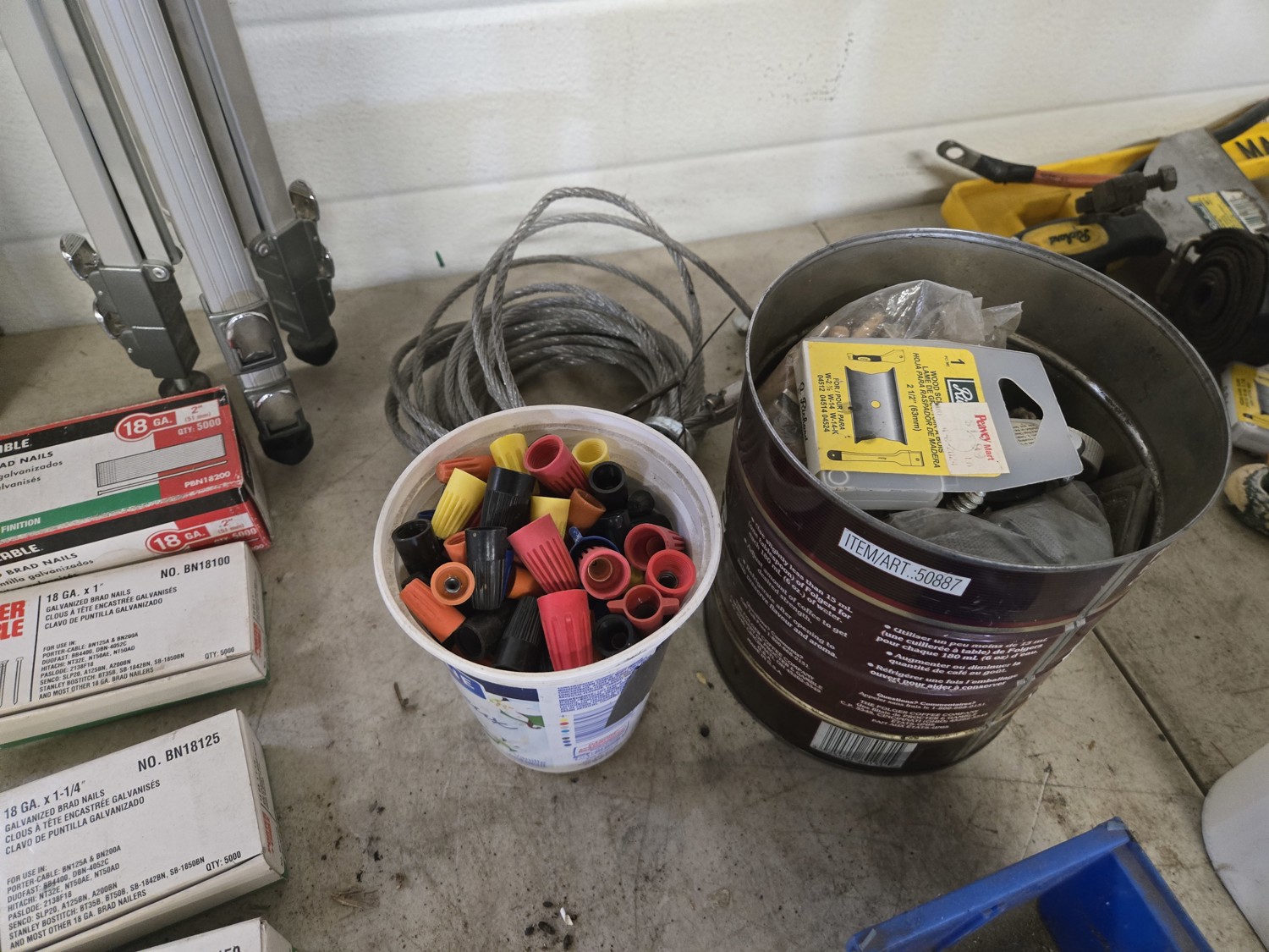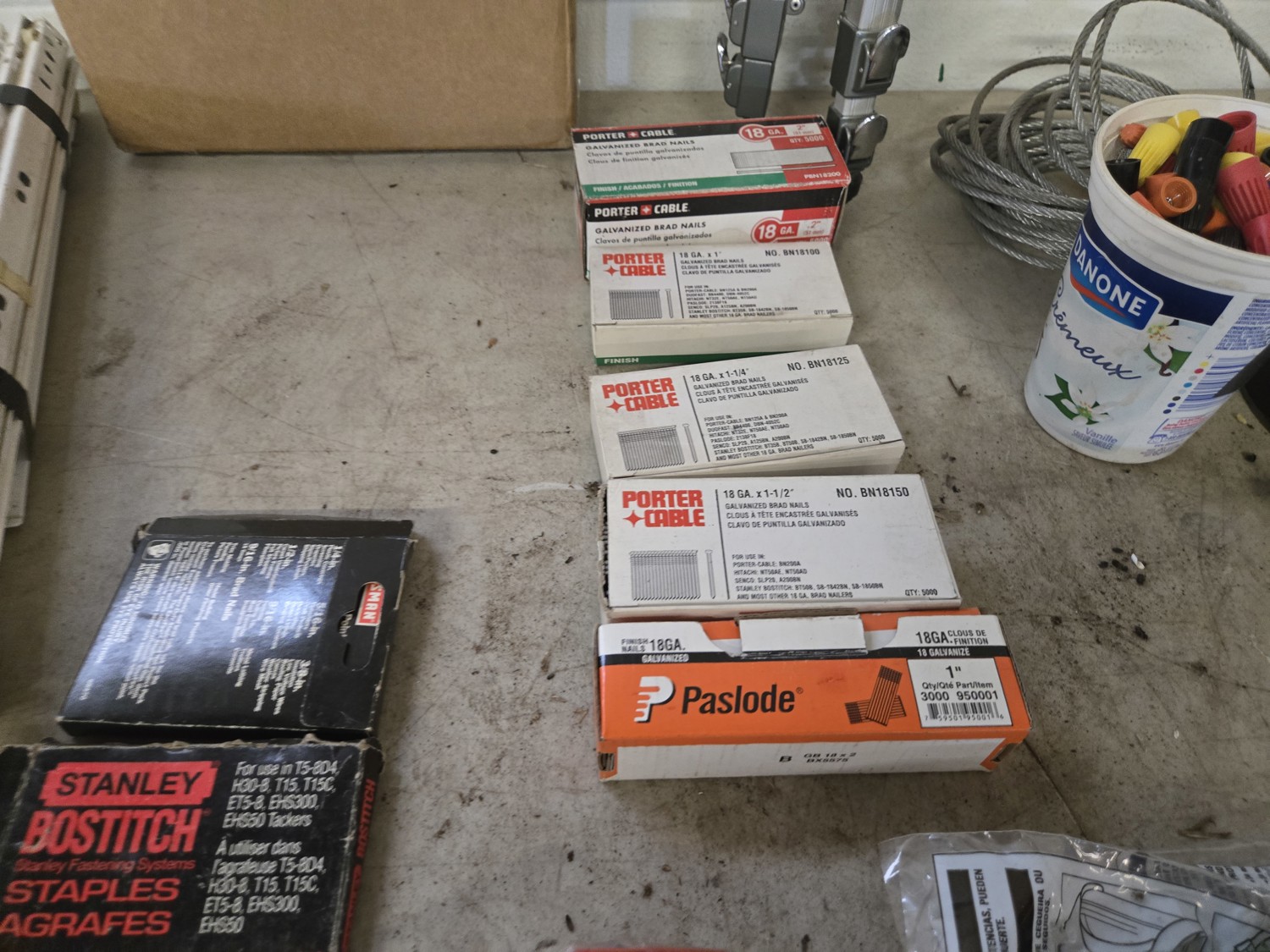 Router bit kit, marette's, qty of brad nails, & staples, cable, tripod, (2) replacement face shield's, cabinet parts, miscellaneous items