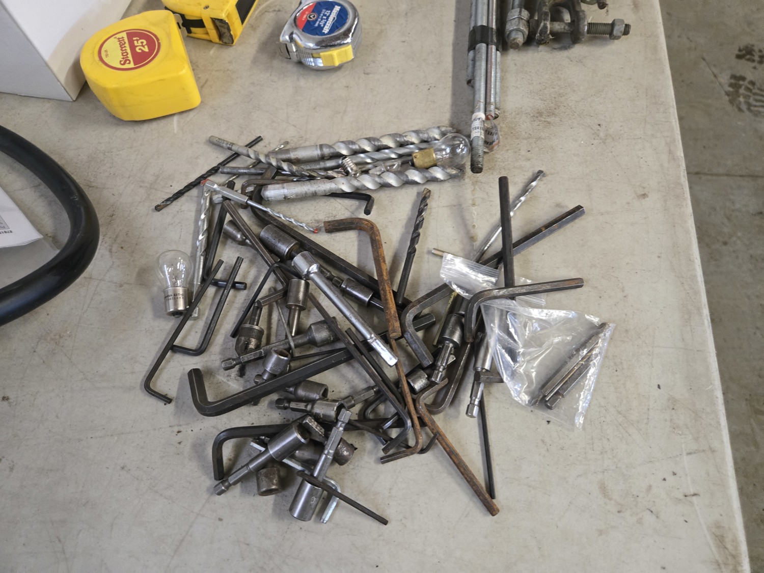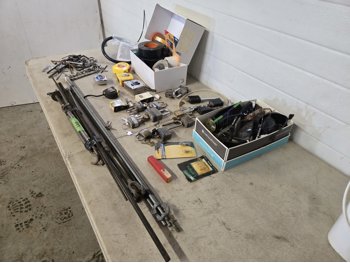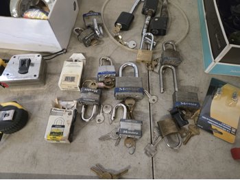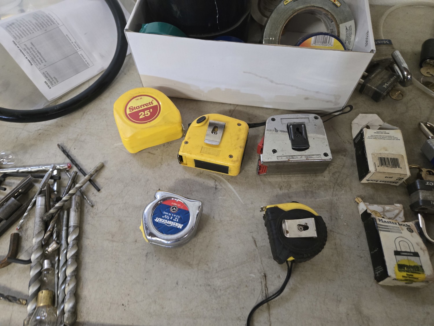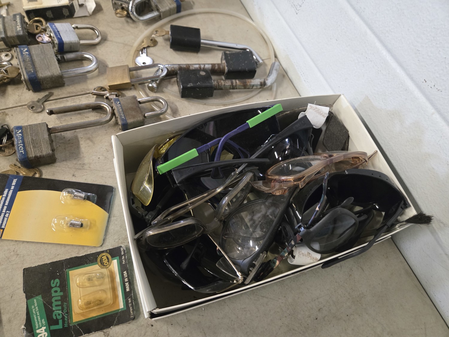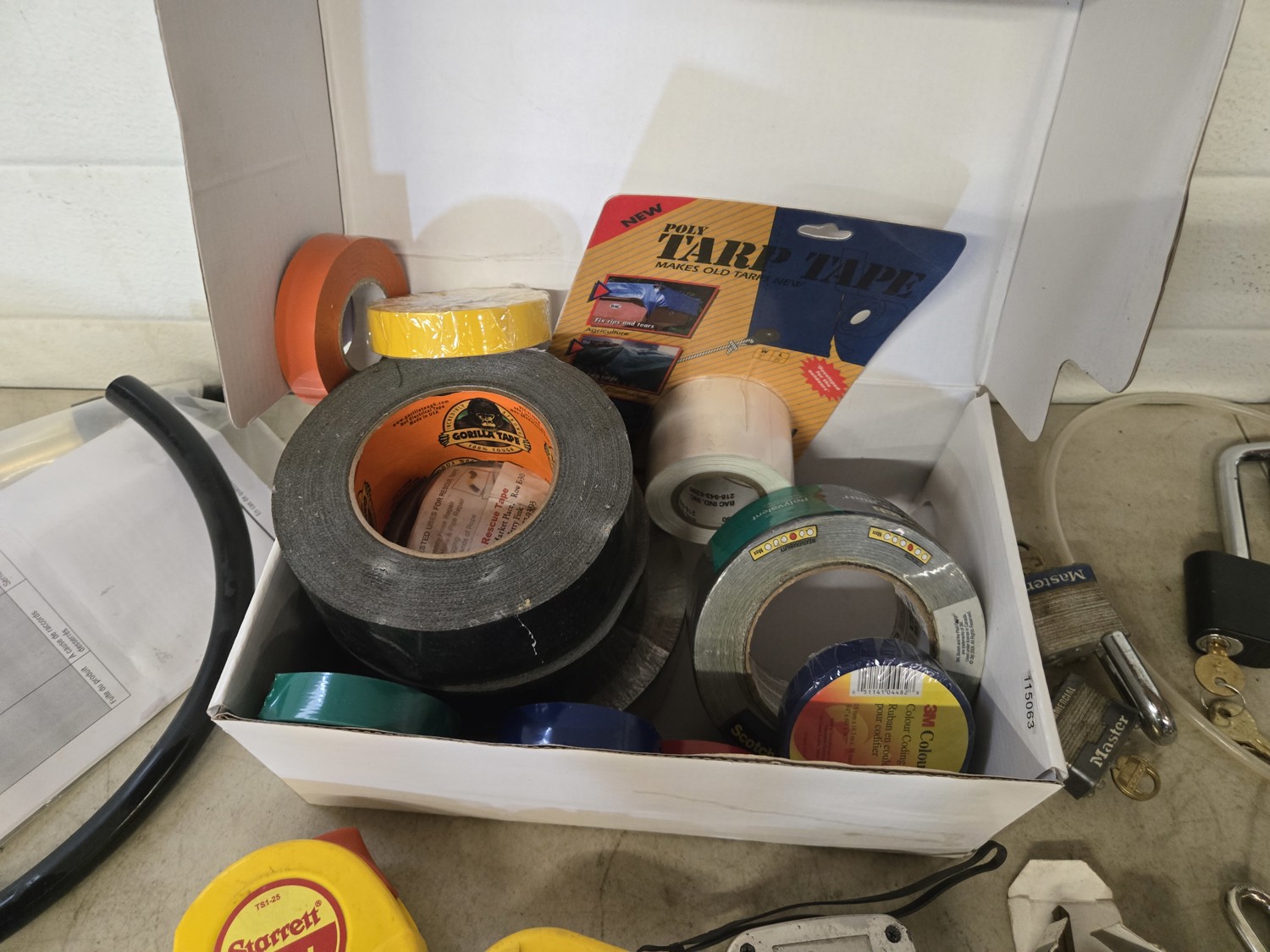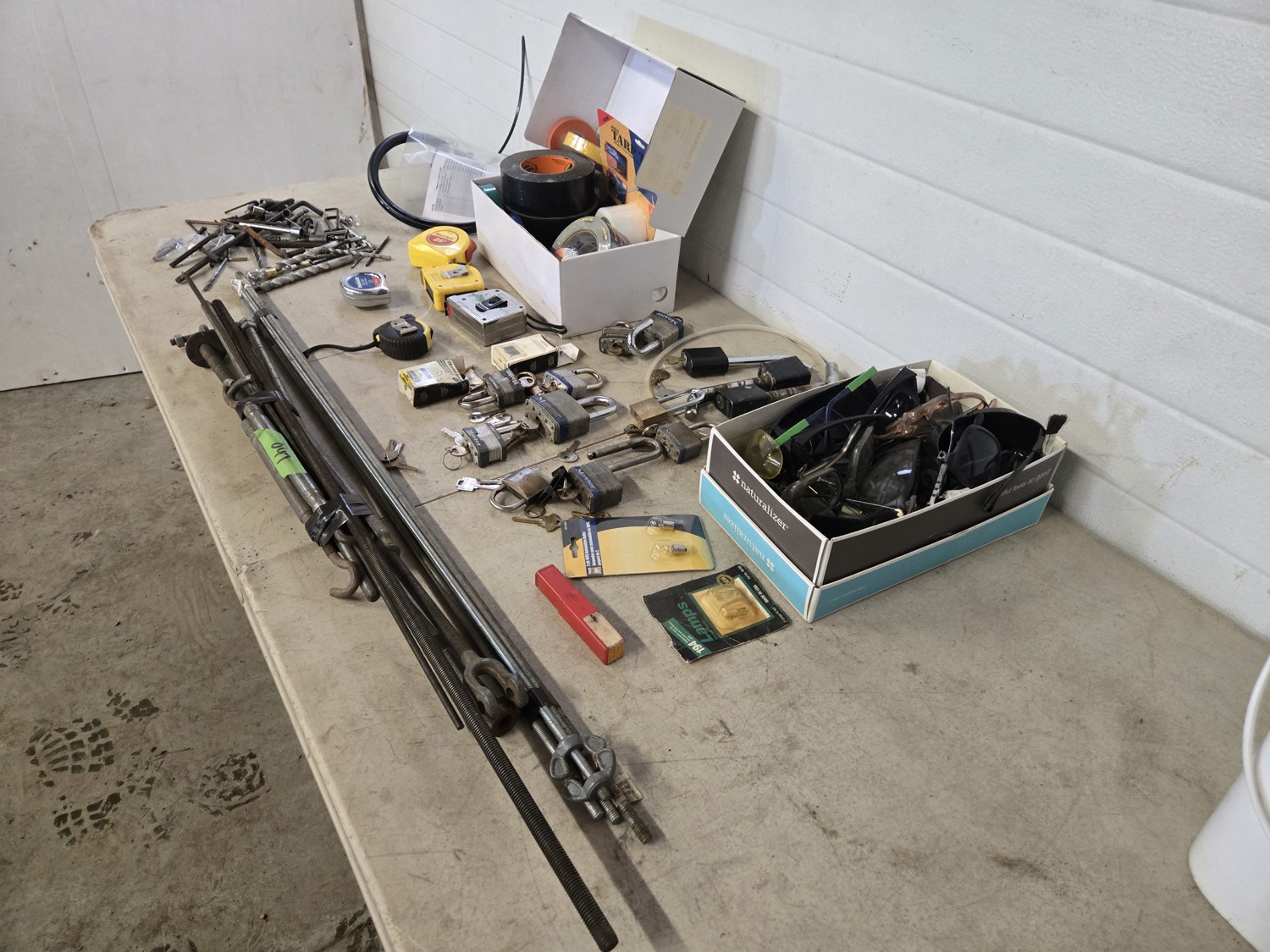 qty of safety glasses, qty of tape, (5) measuring tapes, qty of padlocks, receiver hitch locking pins, miscellaneous items