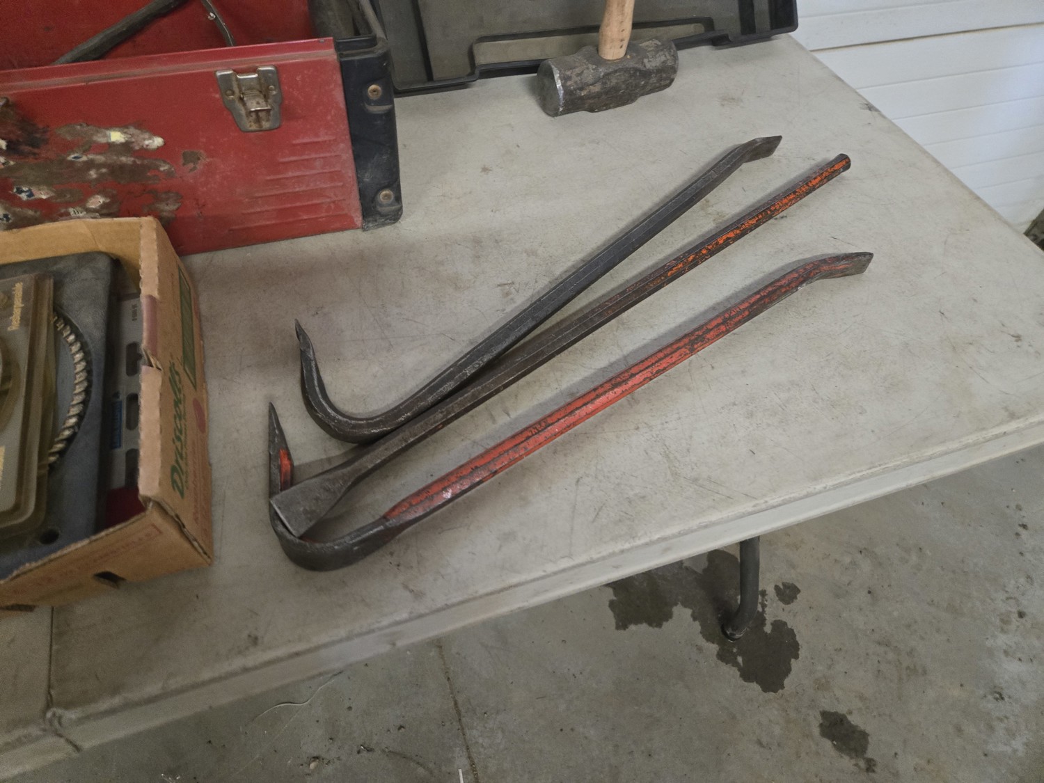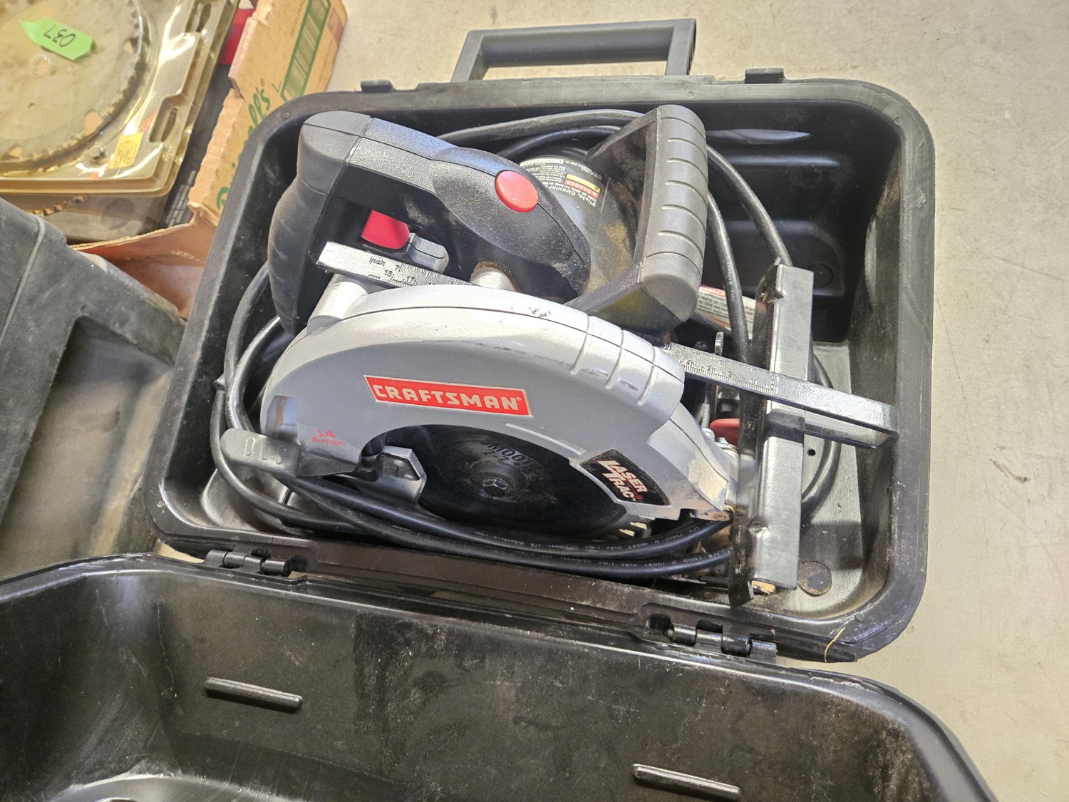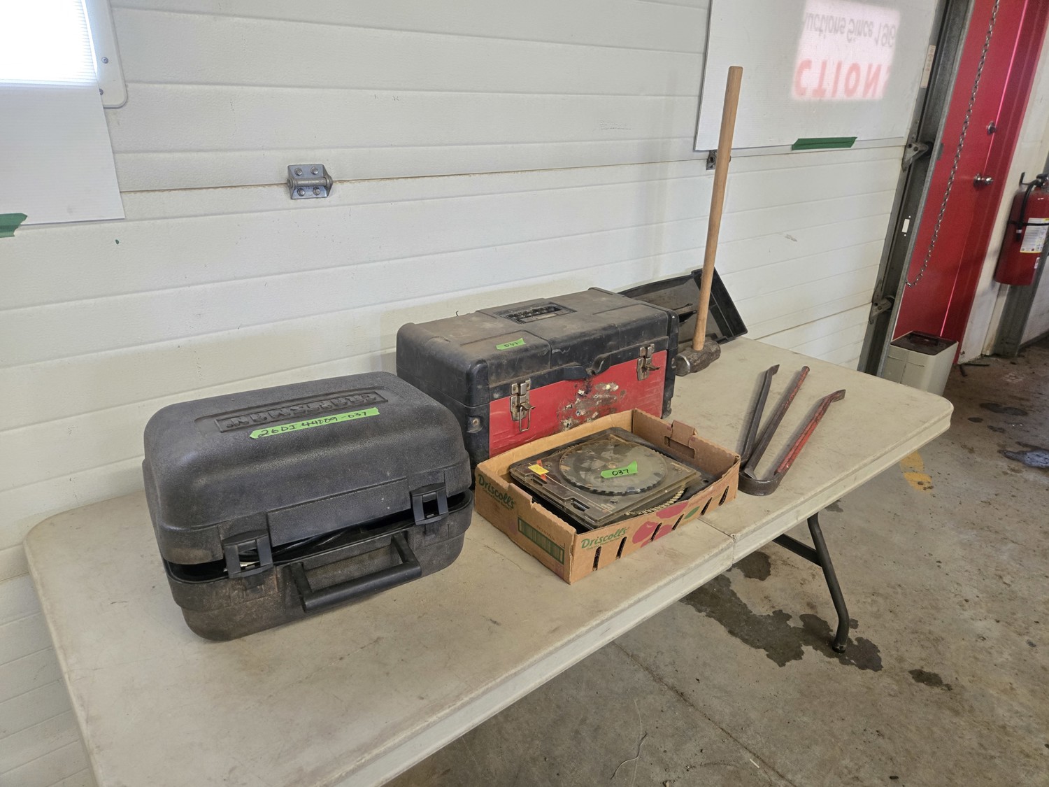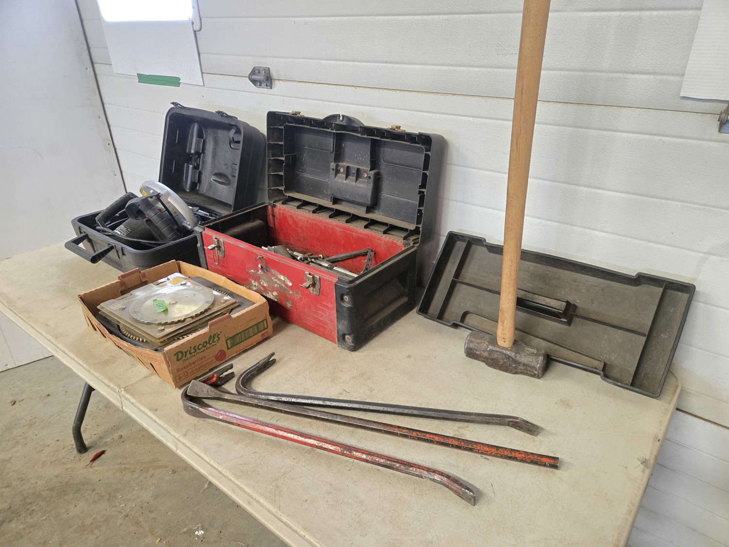 Tool box with miscellaneous hardware, Craftsman circular saw, (3) pry bars, qty of saw blades, sledge hammer