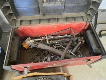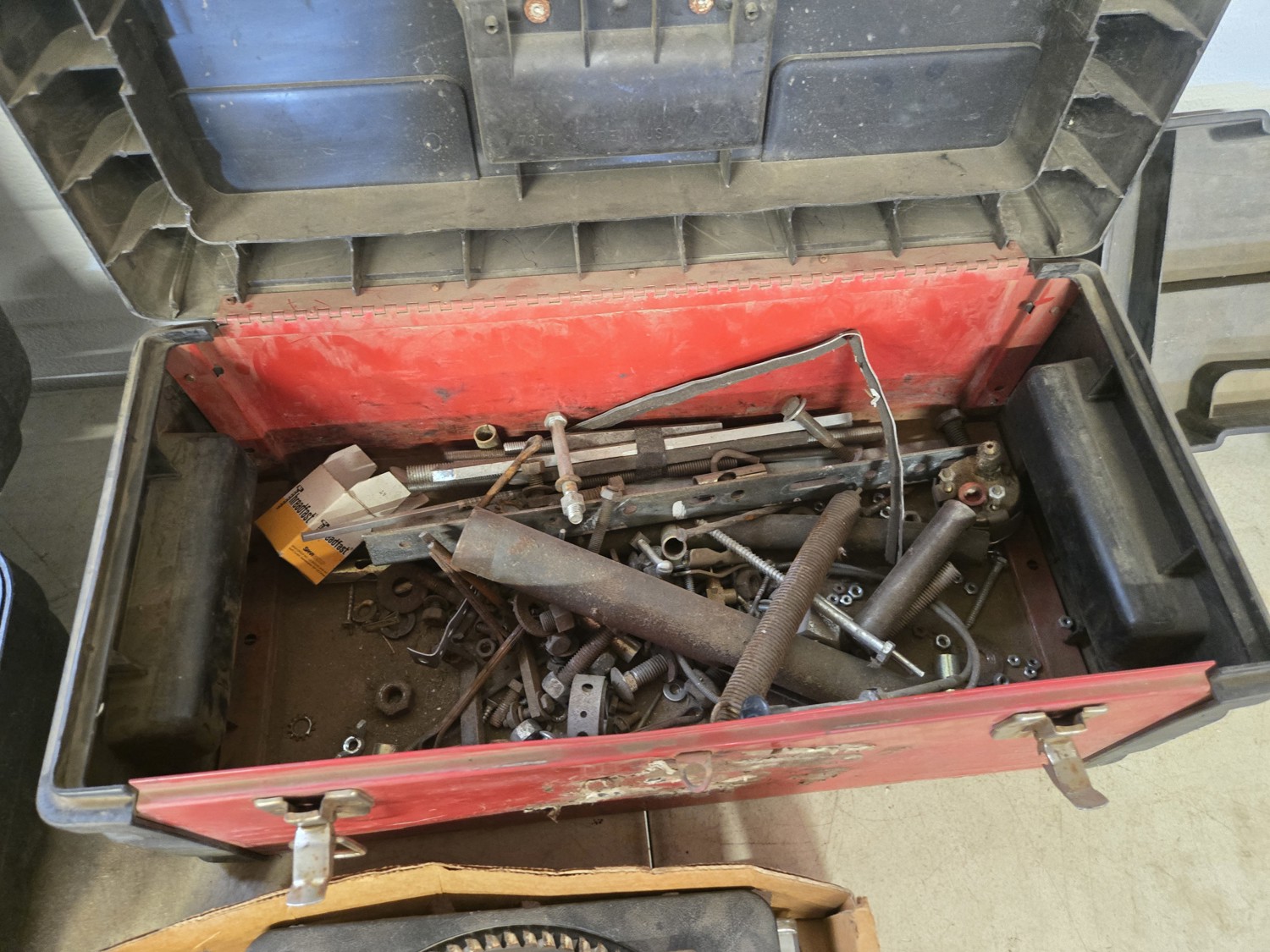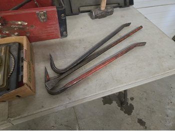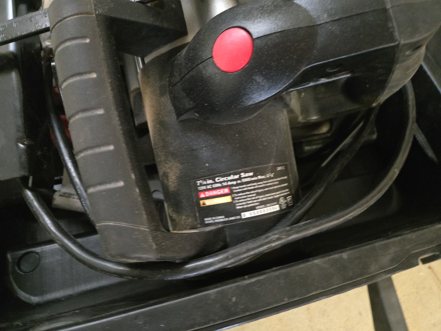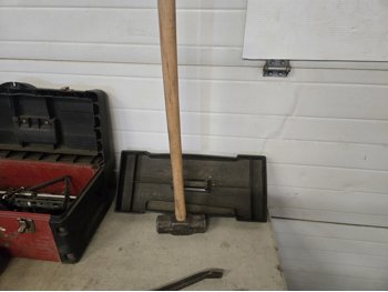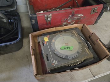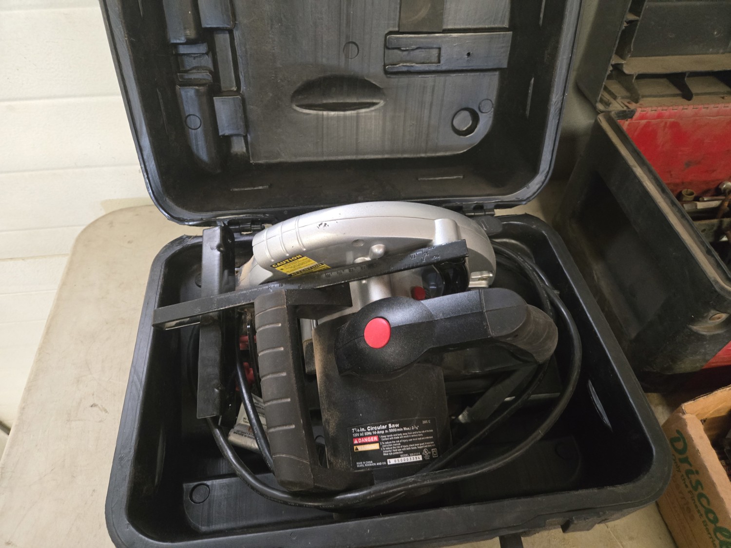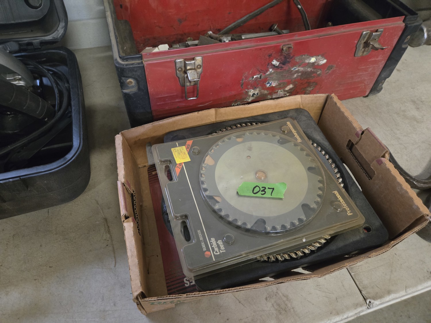 Tool box with miscellaneous hardware, Craftsman circular saw, (3) pry bars, qty of saw blades, sledge hammer