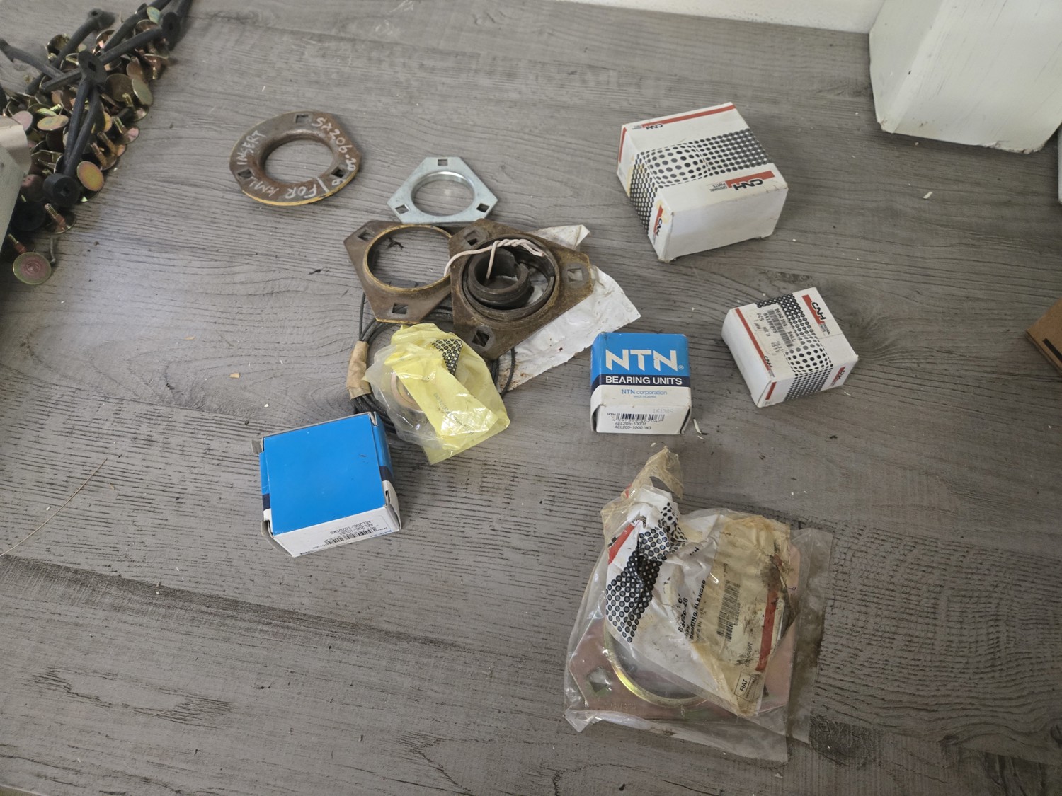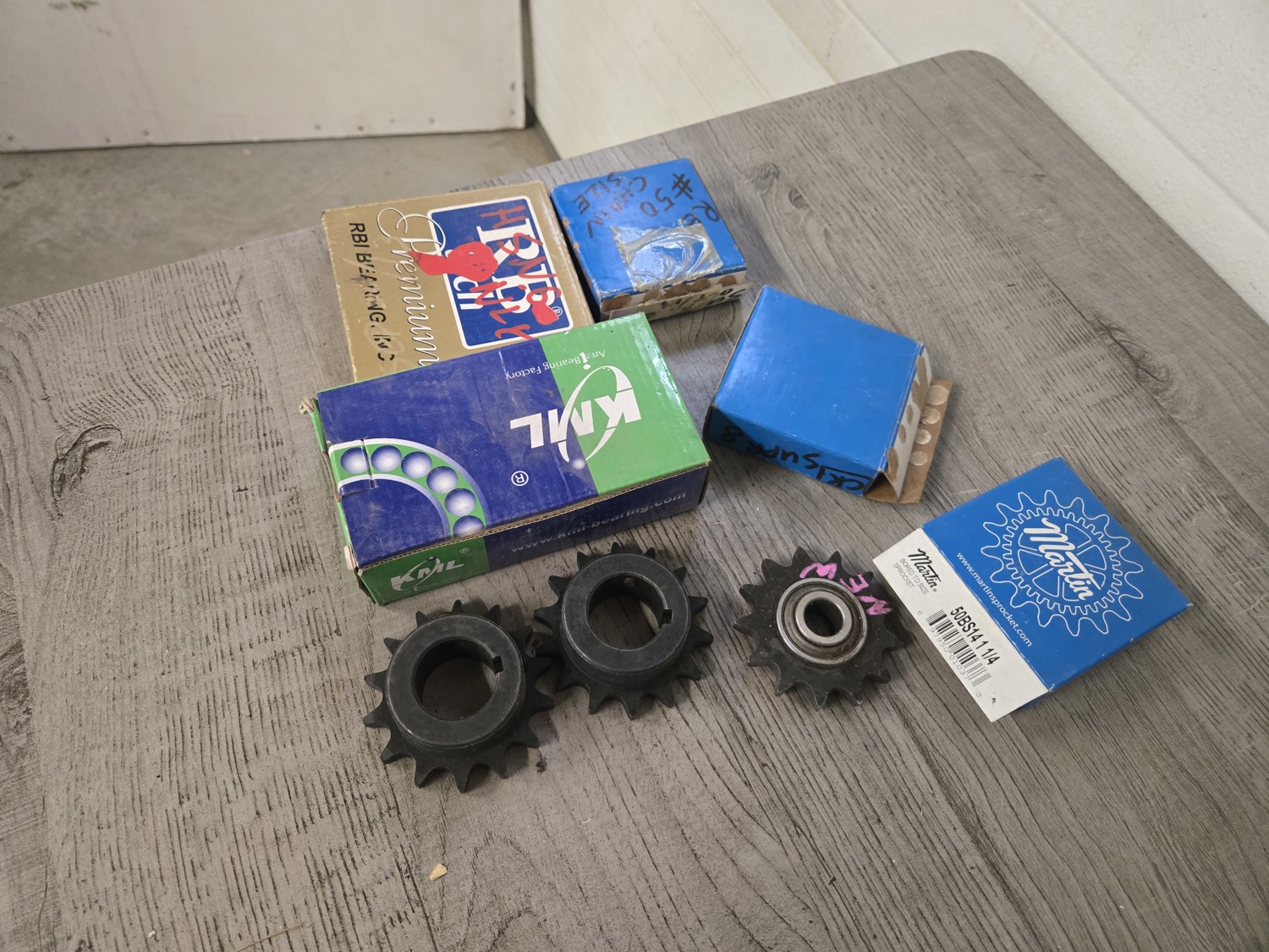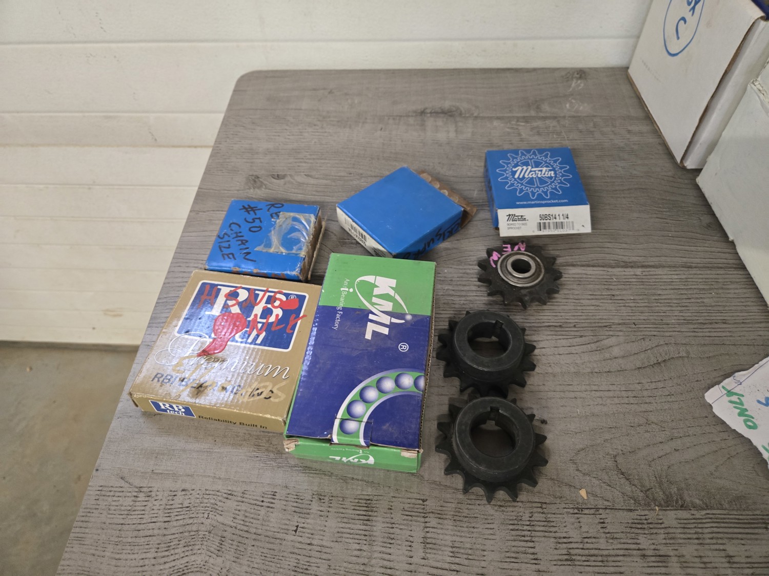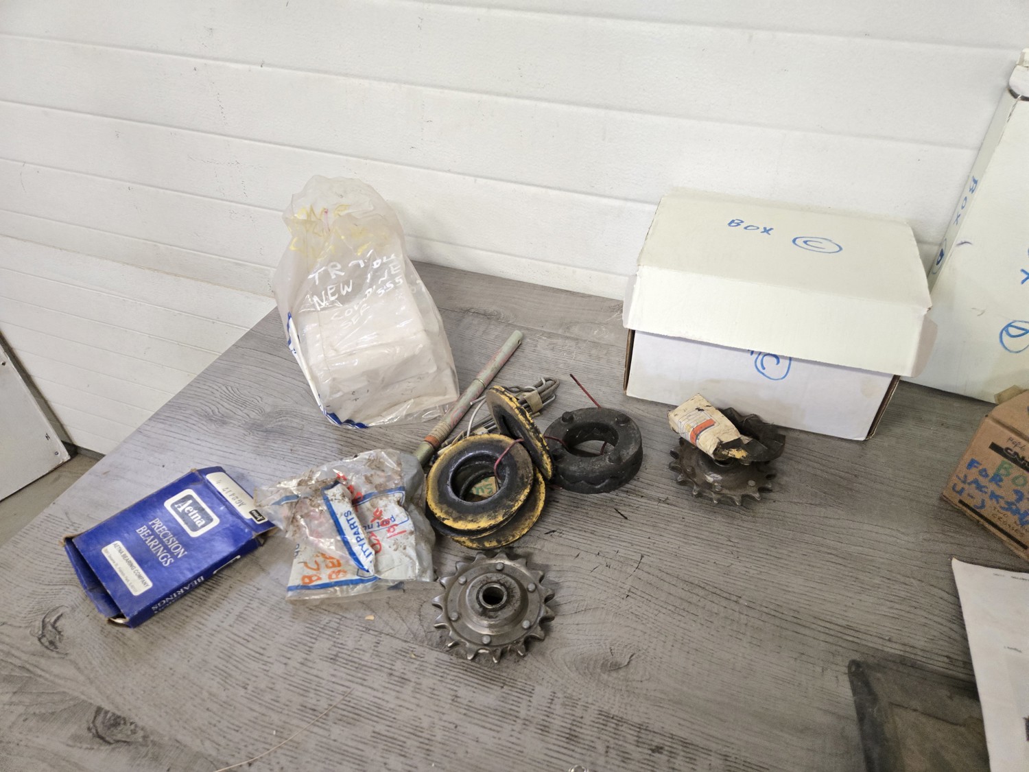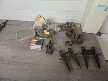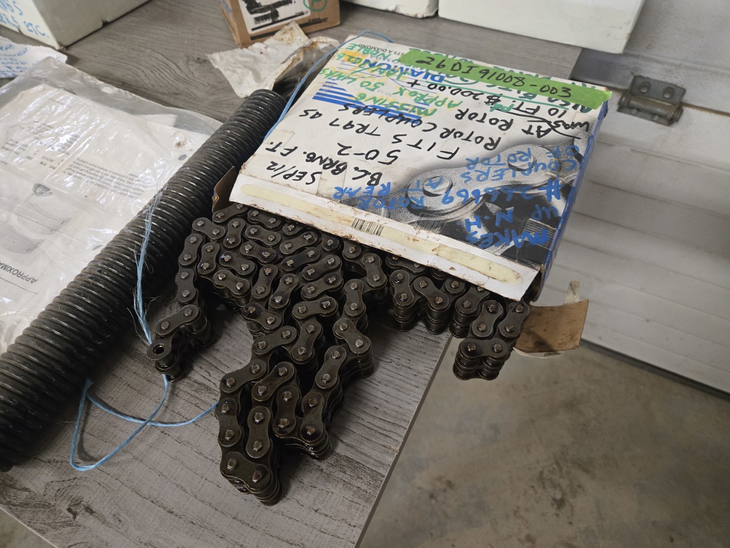 partial box of 50-2 roller chain, qty of bearings and sprockets, fold down beverage tray, spring for Victory pickup, new receiver dryer, fan switches, many other parts to fit TR97 combine, new and used, see pictures