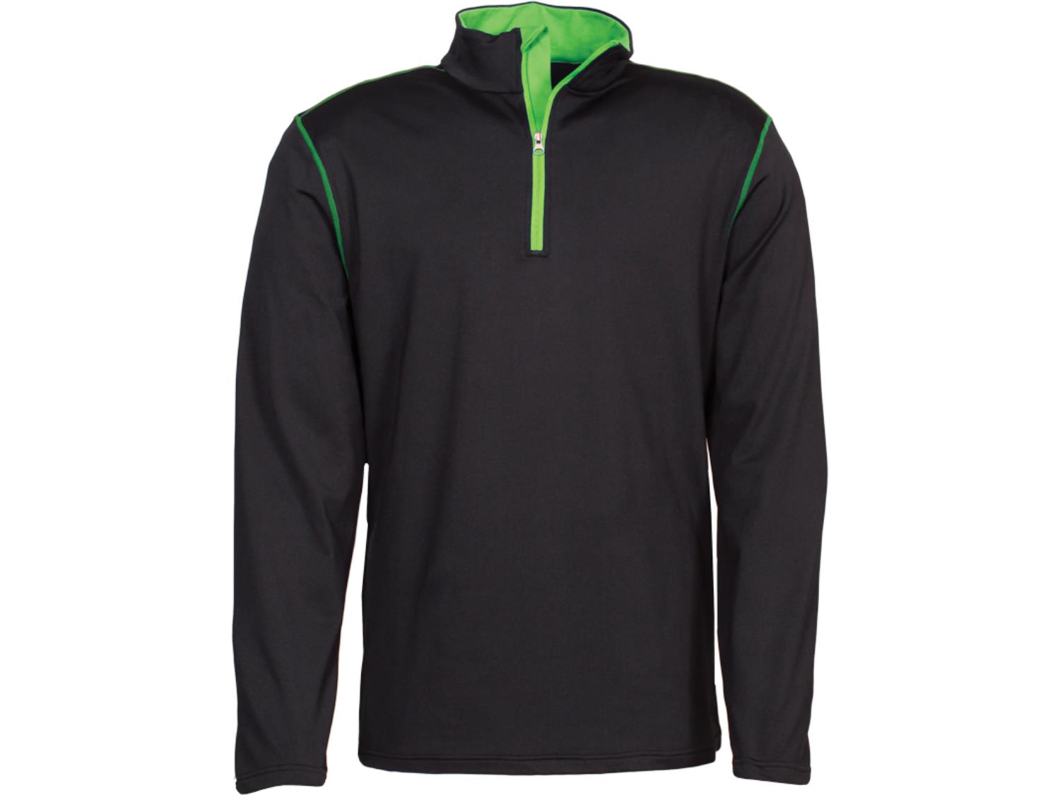 Style 810, 90% polyester, 10% spandex, breathable and moisture wicking, contrast stitching, 1/4 zipper, chin guard on main zipper, self-cuff and collar