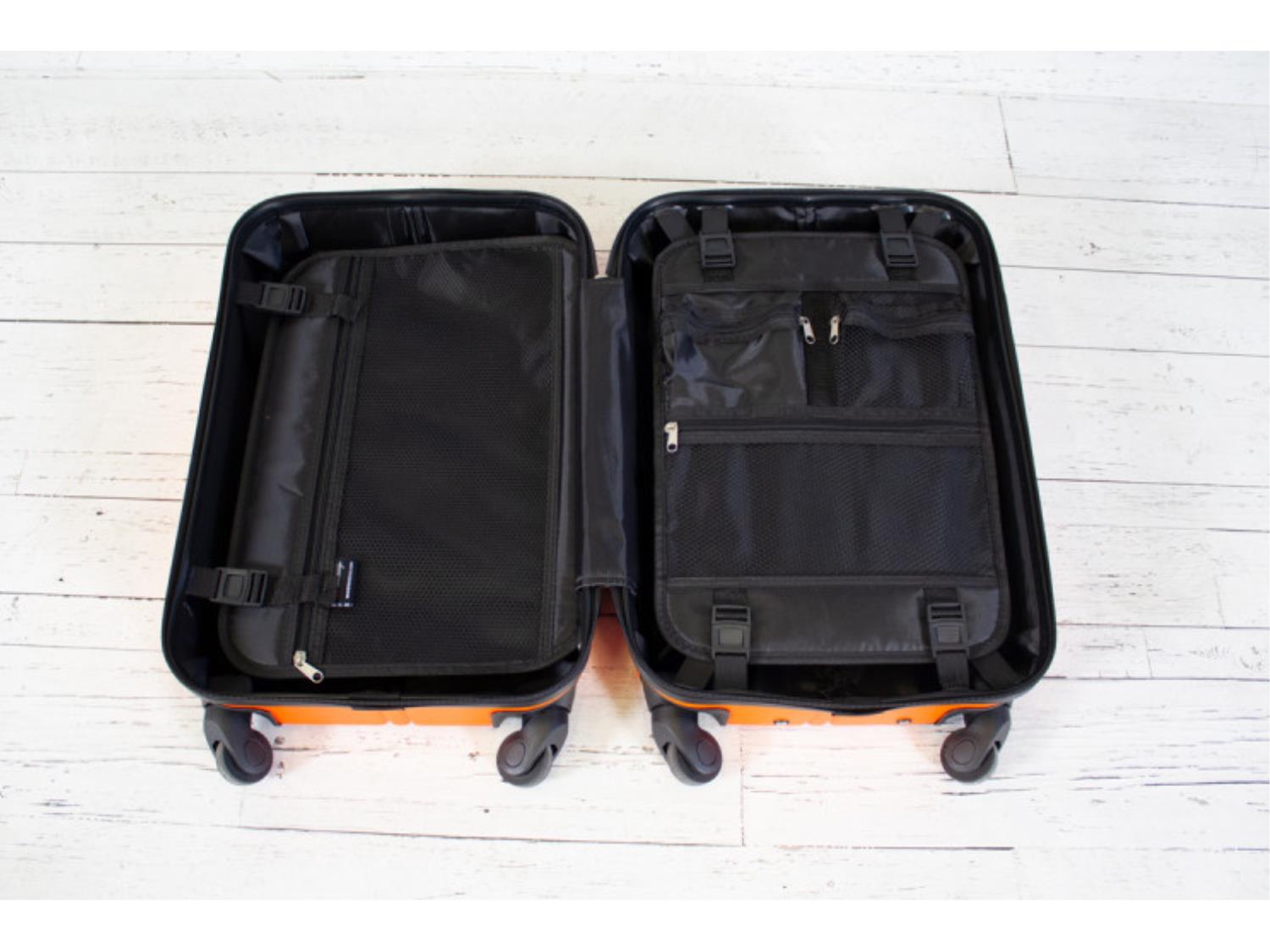 Textured ABS mould design, fully recessed aluminum pullout handle, removable toiletry divider with hanger (black), 1 flex divider, clothing travel straps, top and side ergonomic Gel grip handles, 4 wheel spinners, inset metal plate 2.25” W x 1.285” H, size 21” X 14” X 9 (Carry on size)
