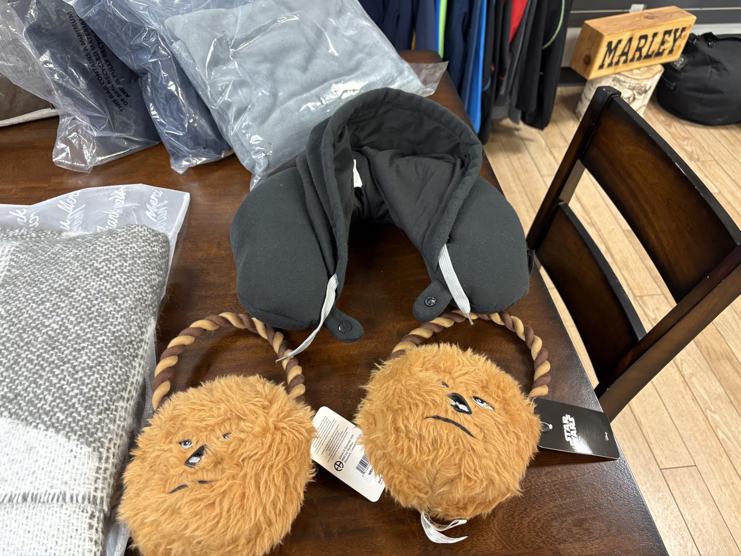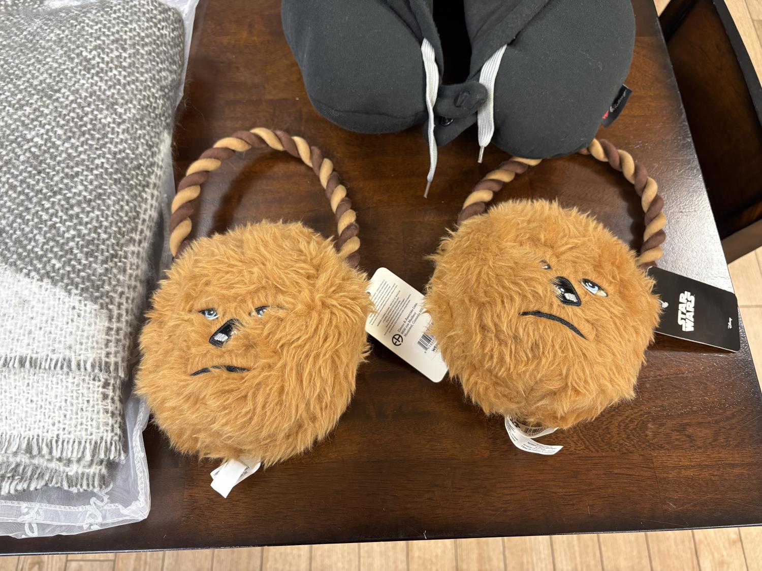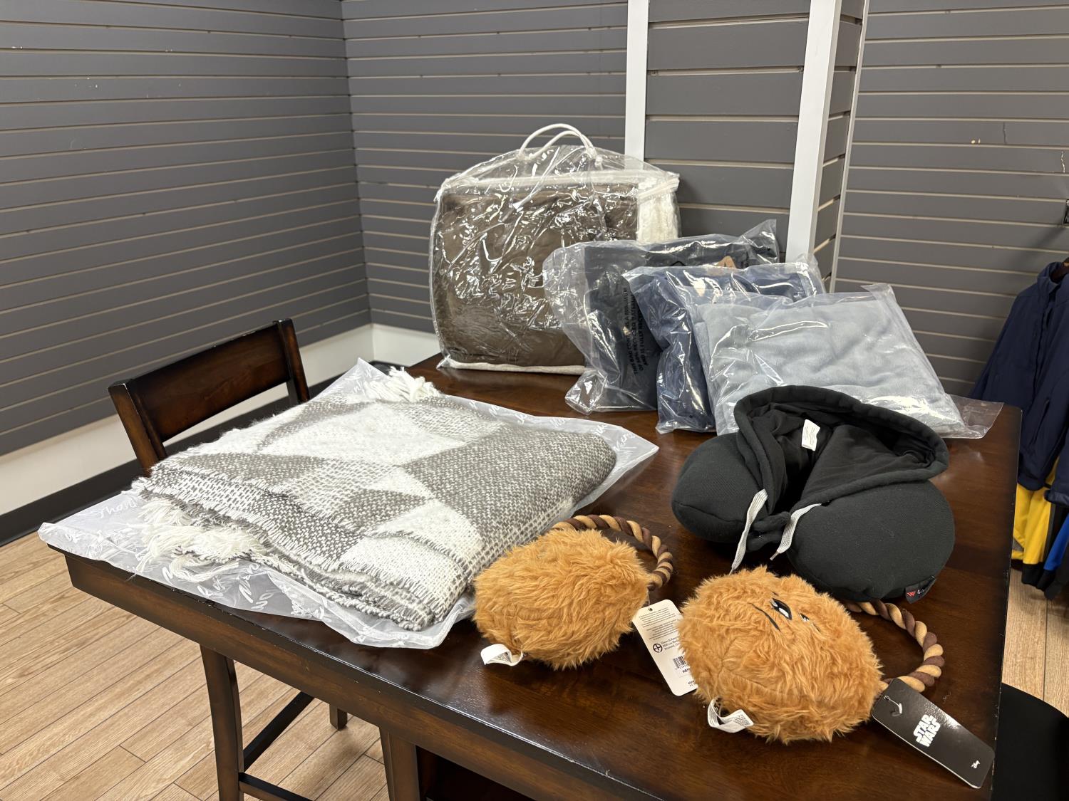 showroom items, grey/white blanket 50 inch x 70 inch, brown blanket 60 inch x 70 inch, navy blanket 43 inch x 55 inch, grey blanket 43 inch x 55 inch, black blanket 43 inch x 55 inch, neck pillow with hood, (2) star wars dog toys