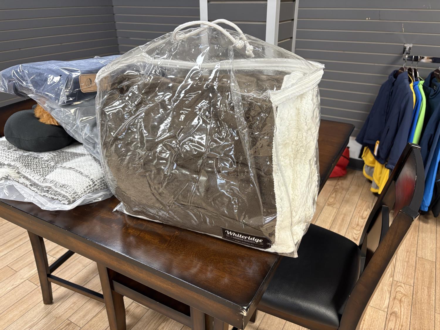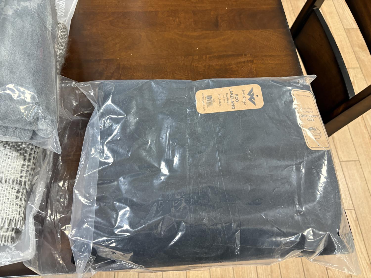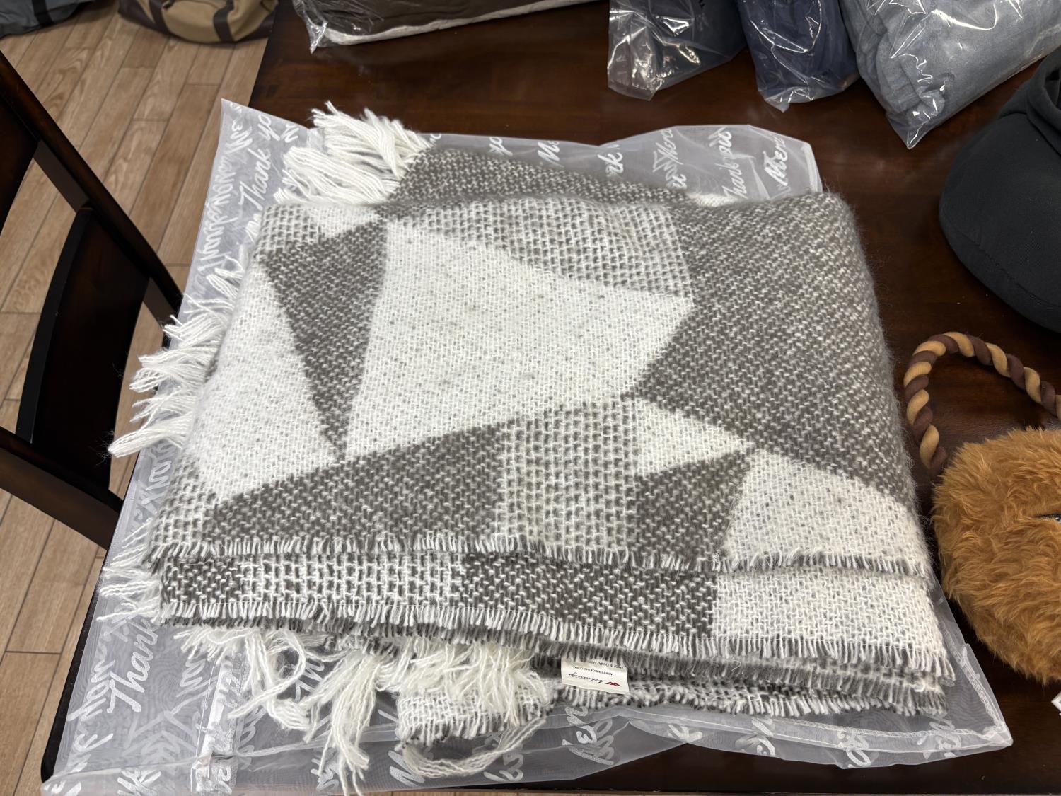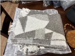 showroom items, grey/white blanket 50 inch x 70 inch, brown blanket 60 inch x 70 inch, navy blanket 43 inch x 55 inch, grey blanket 43 inch x 55 inch, black blanket 43 inch x 55 inch, neck pillow with hood, (2) star wars dog toys