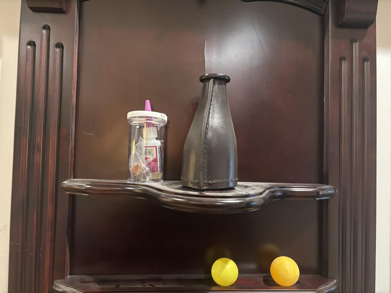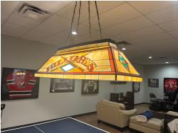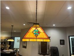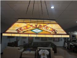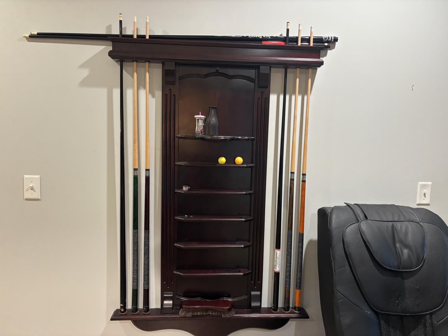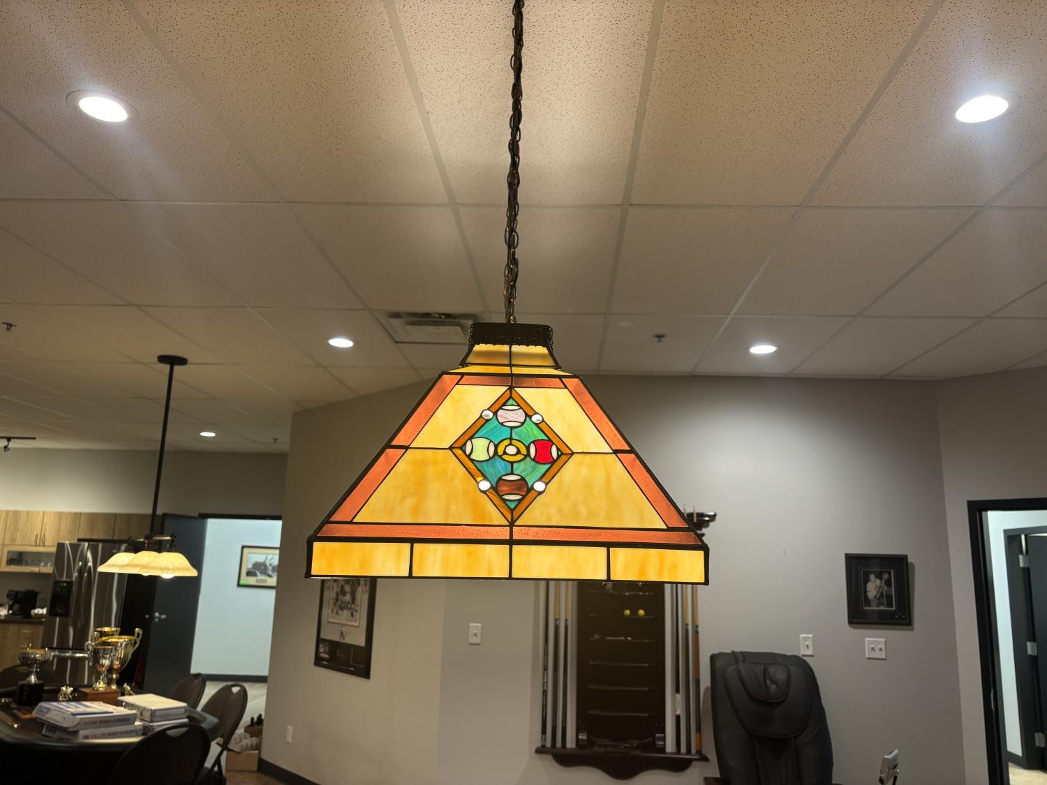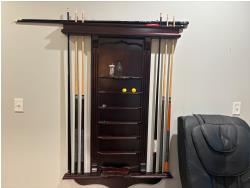 8 pool cues, full set of pool balls, 2 used chalk, triangle, mechanical bridge stick, cue repair kit, Kelly pool game, table brush, full pool hanging cabinet, stained glass "billiards" 4 bulb hanging fixture