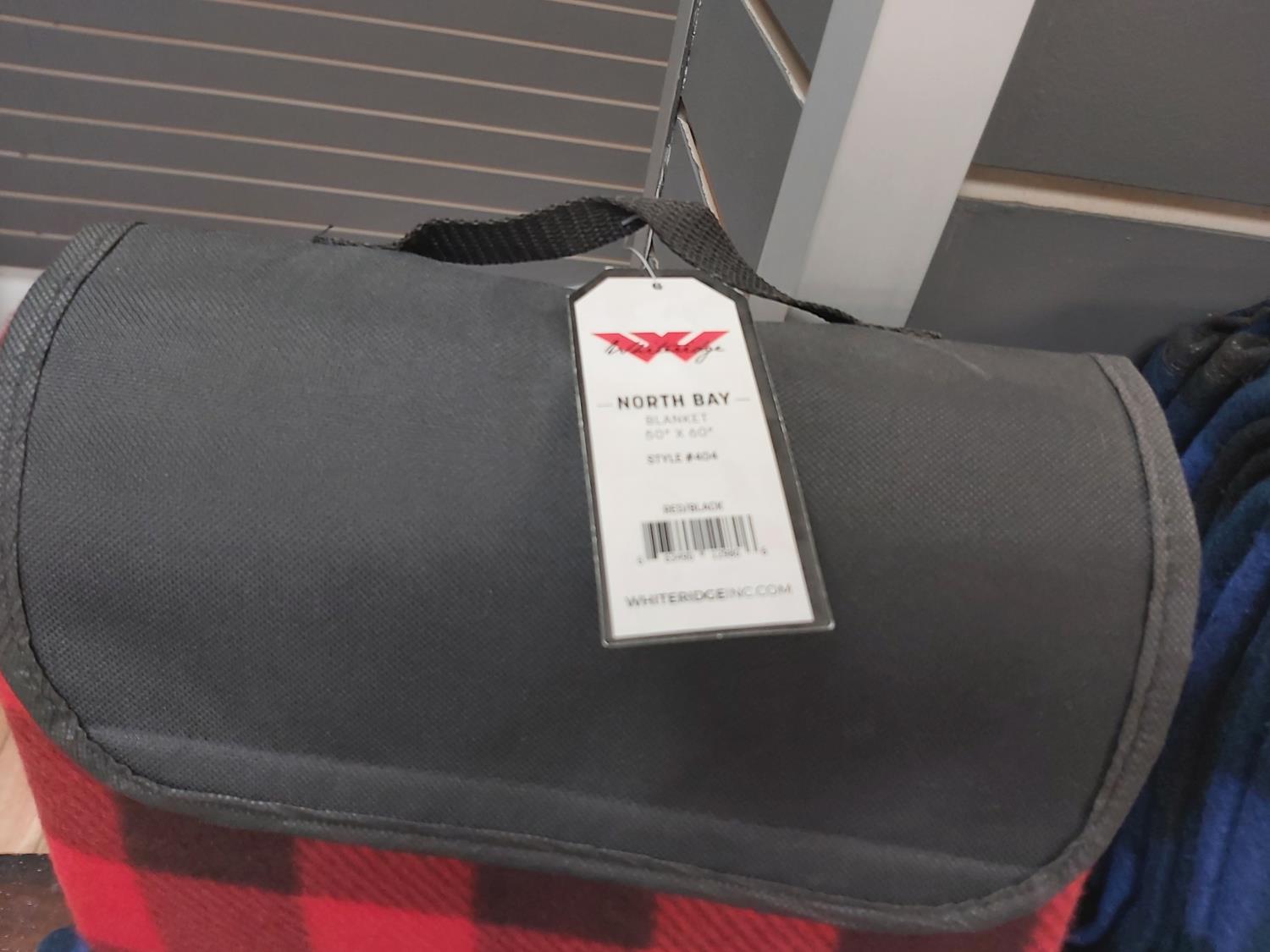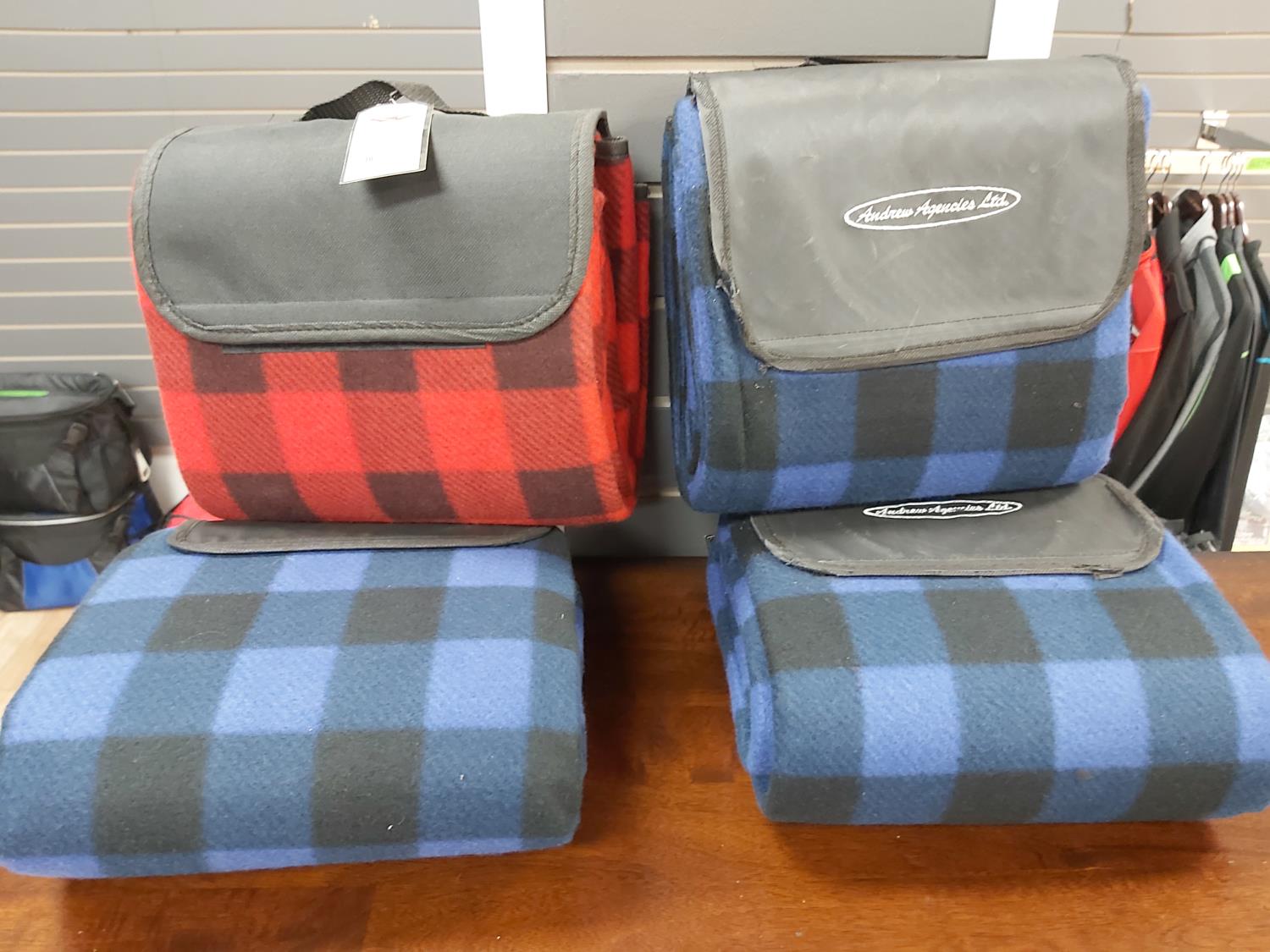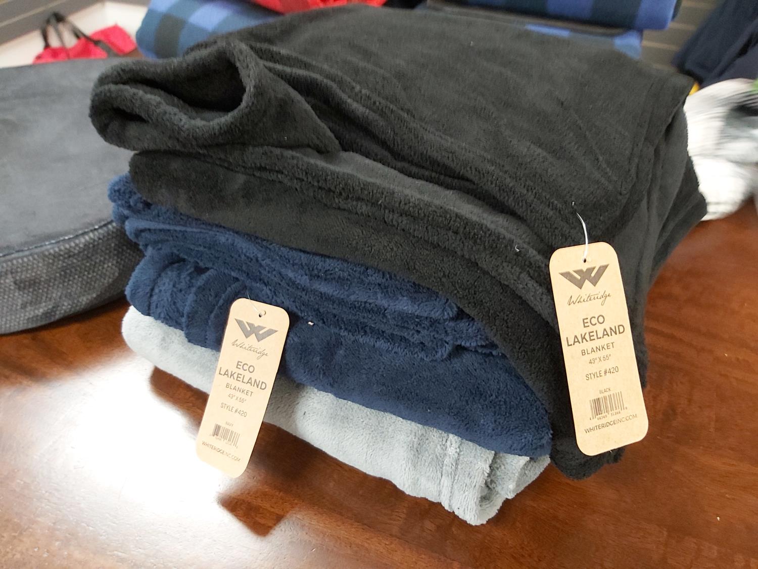 (3) 43 inch X 55 inch Eco blankets, (1) blue plaid lumberjack hat, (1) S/M booties, (4) Northbay blankets, (1) round cushion