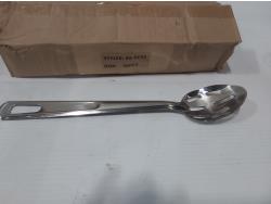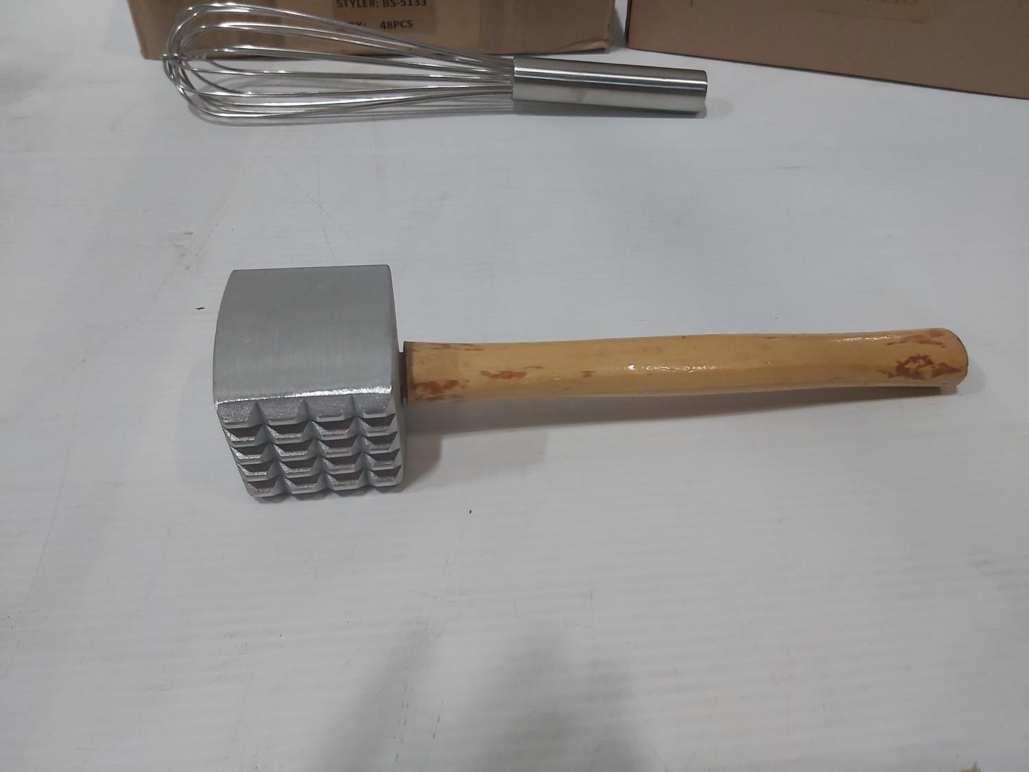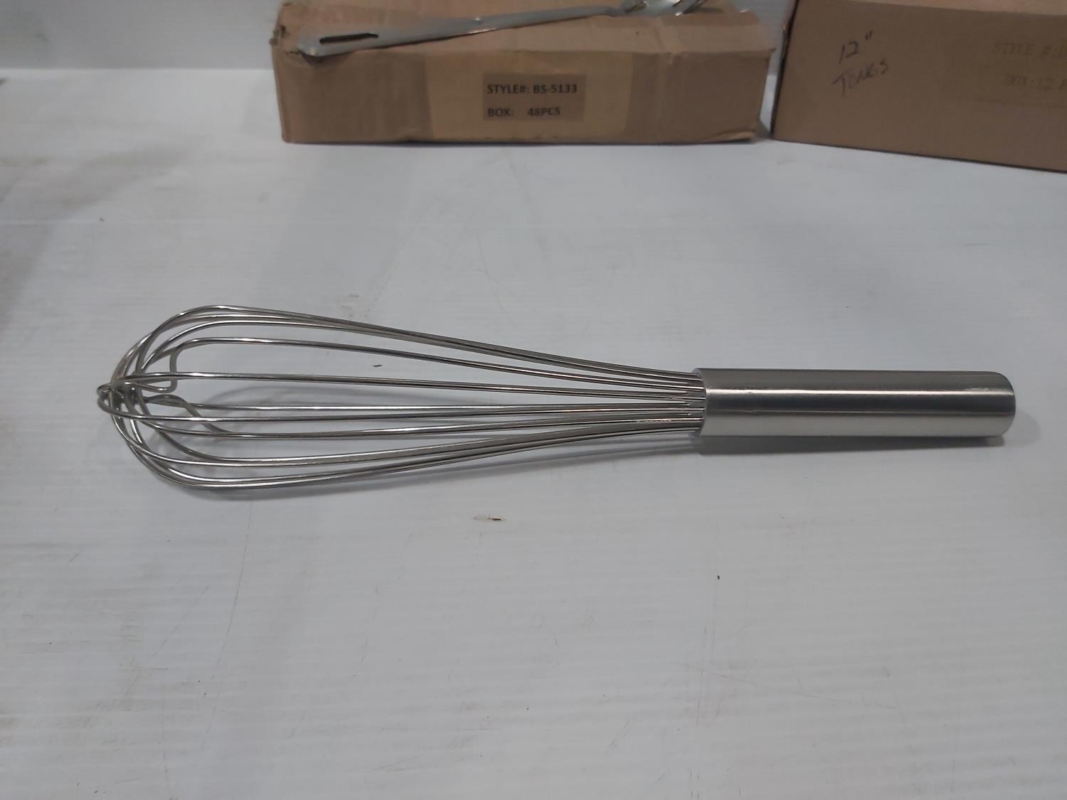 Stainless steel whisk, meat tenderizer, (12) 12 inch stainless steel tongs, (48) 12" stainless steel slotted serving spoons