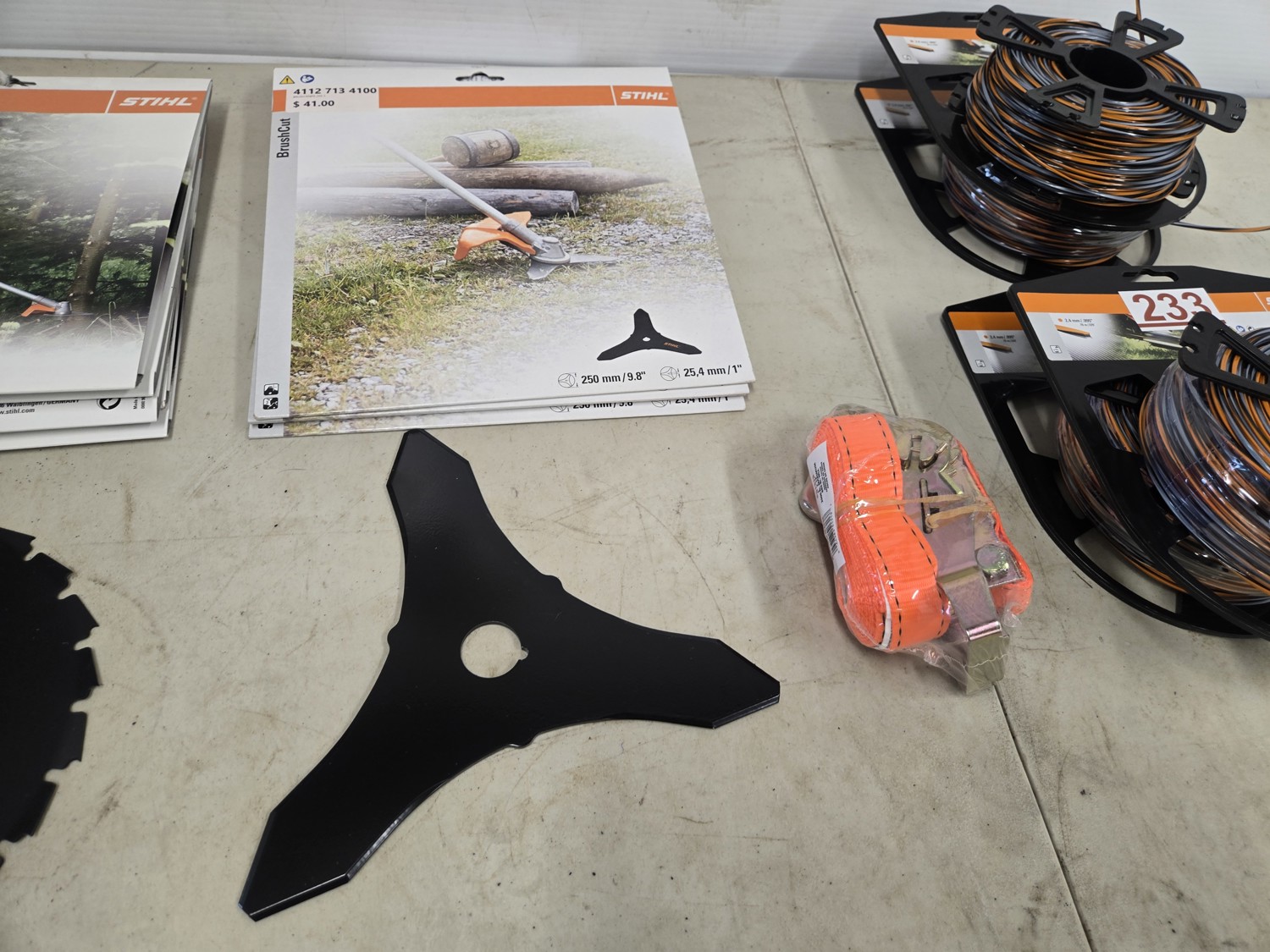 (4). 095 trimmer line, (4) 4112-713-4100 brush cut blades, (5) 4112-713-4203 wood saw blades all with 1 inch arbor