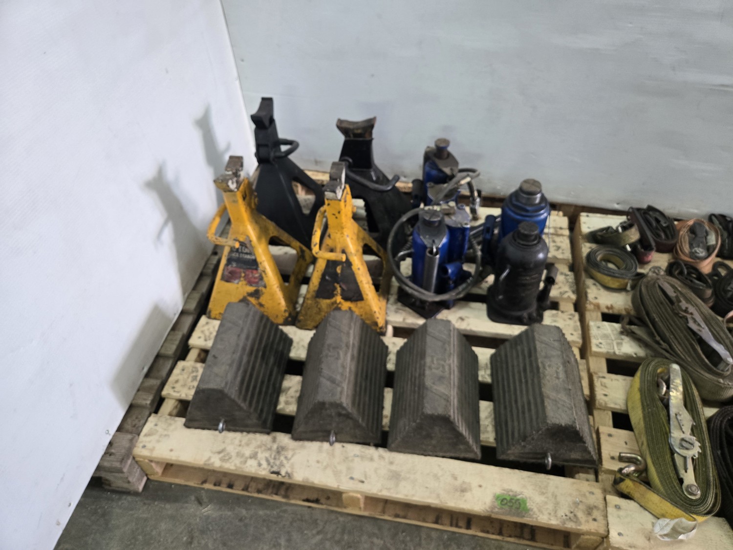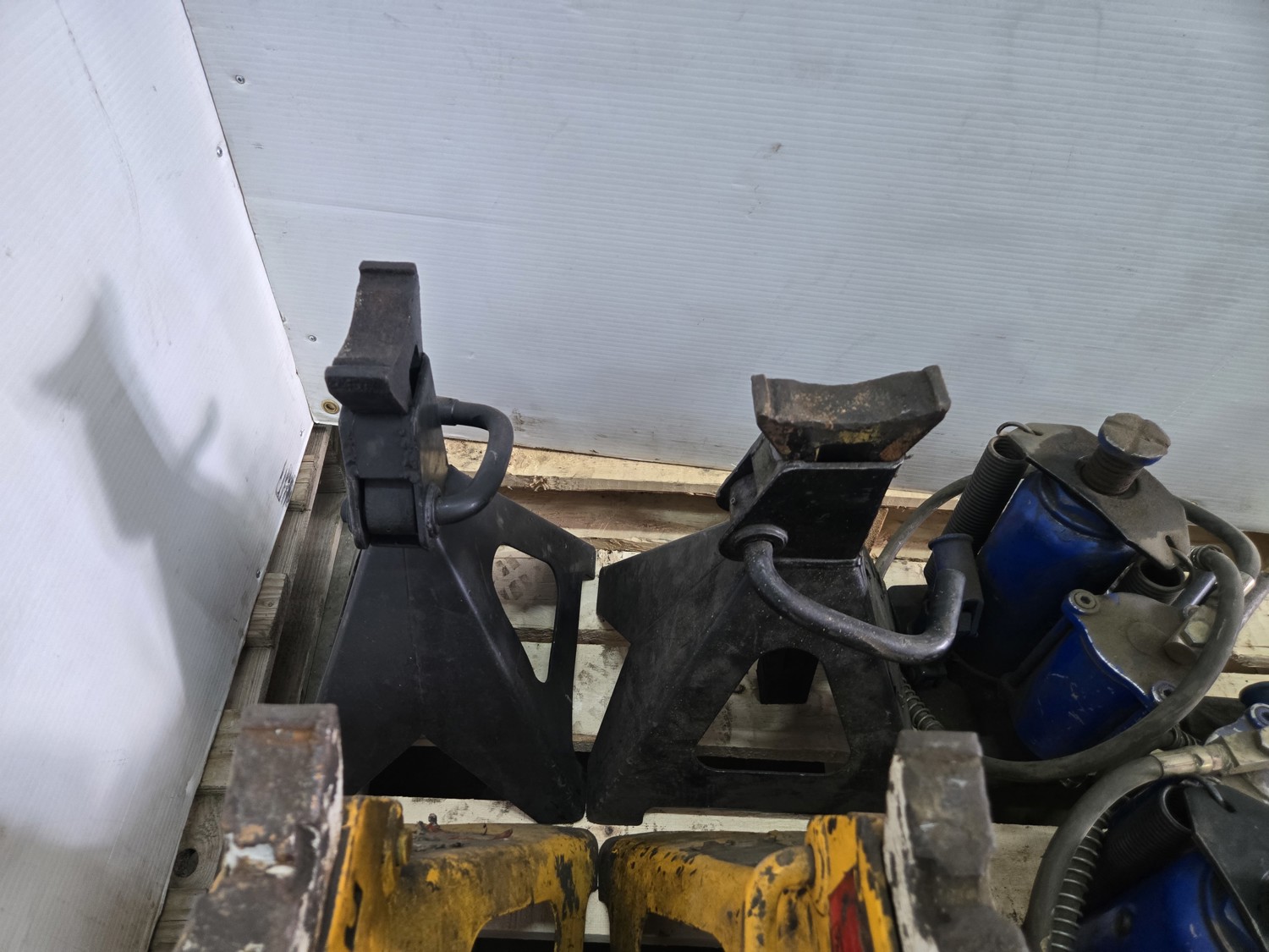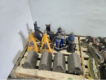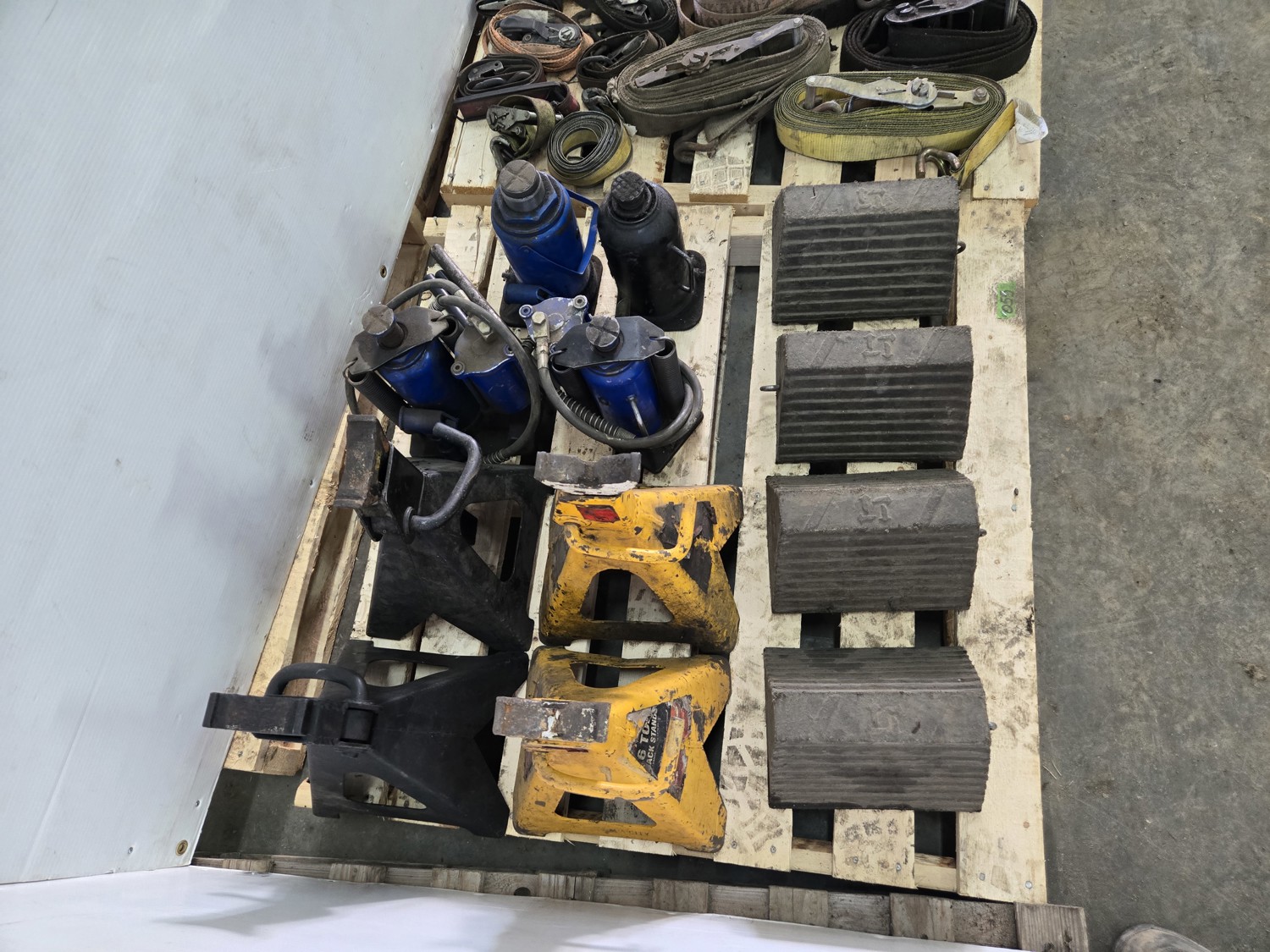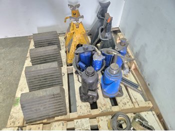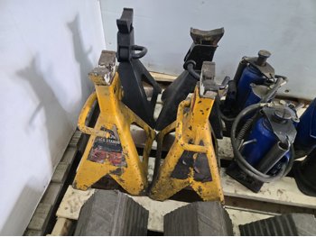 (4) Jack Stands, (4) Wheel Chocks. (2) 20 Ton Air Operated & (2) Bottle Jacks