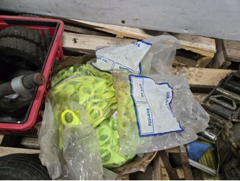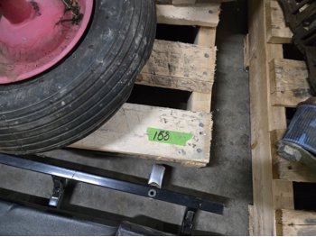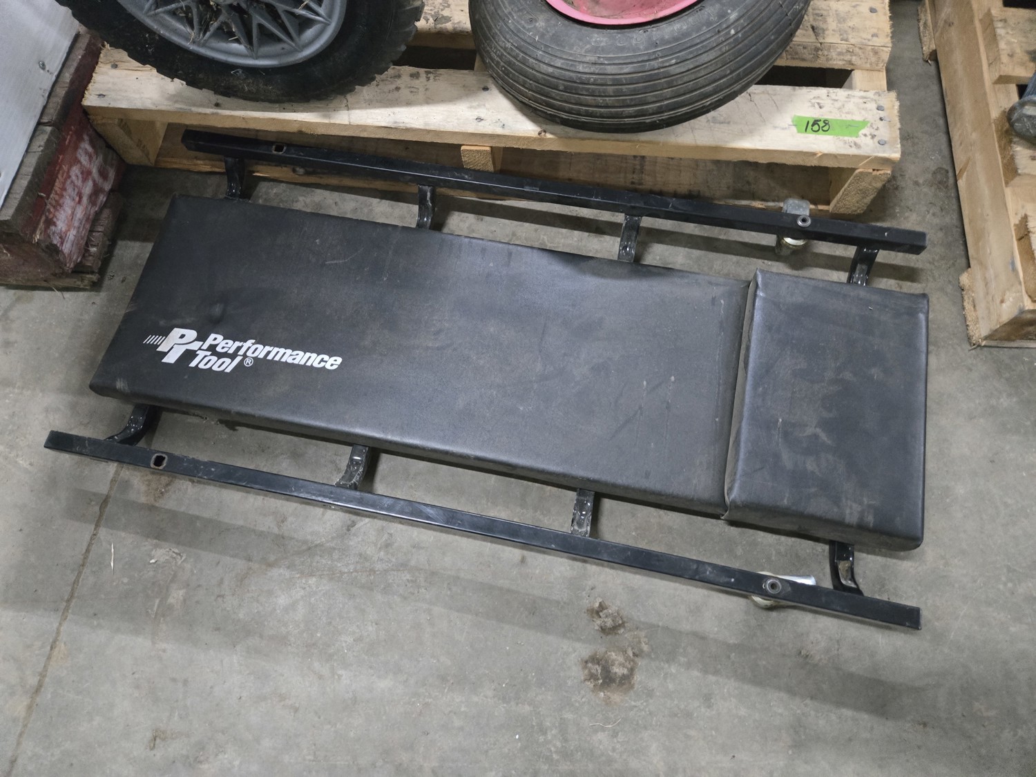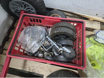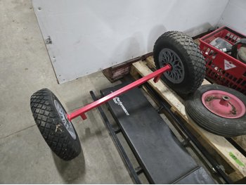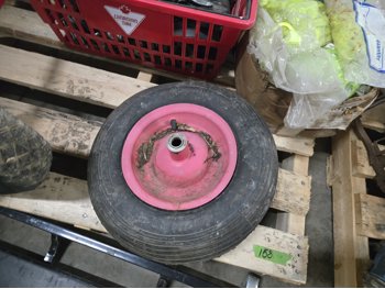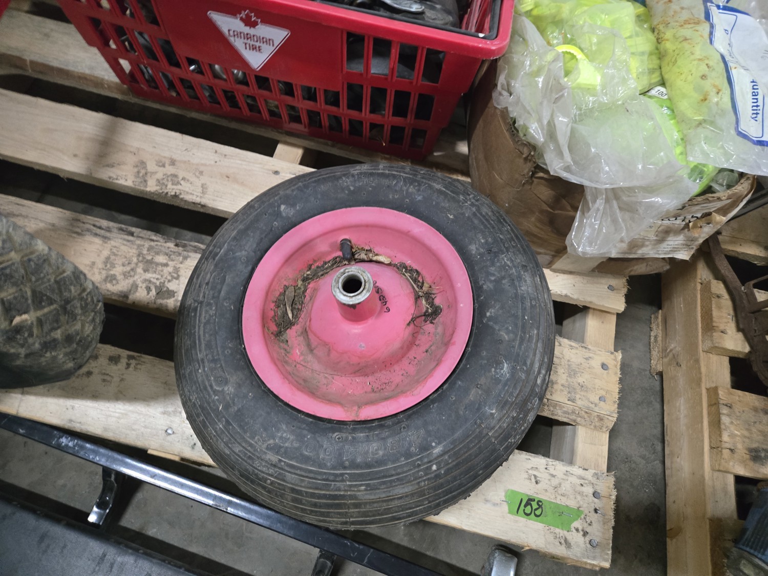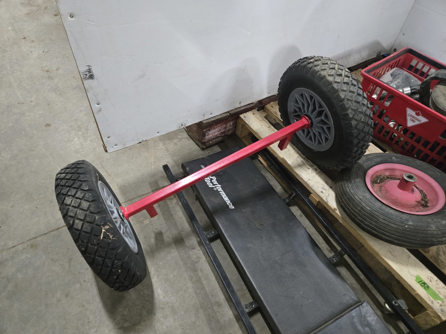 Mechanic's creeper, wheelbarrow wheel, 26 inch utility axle with wheels, qty of various size dolly wheels, qty of lug nut indicators