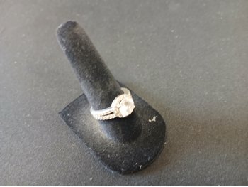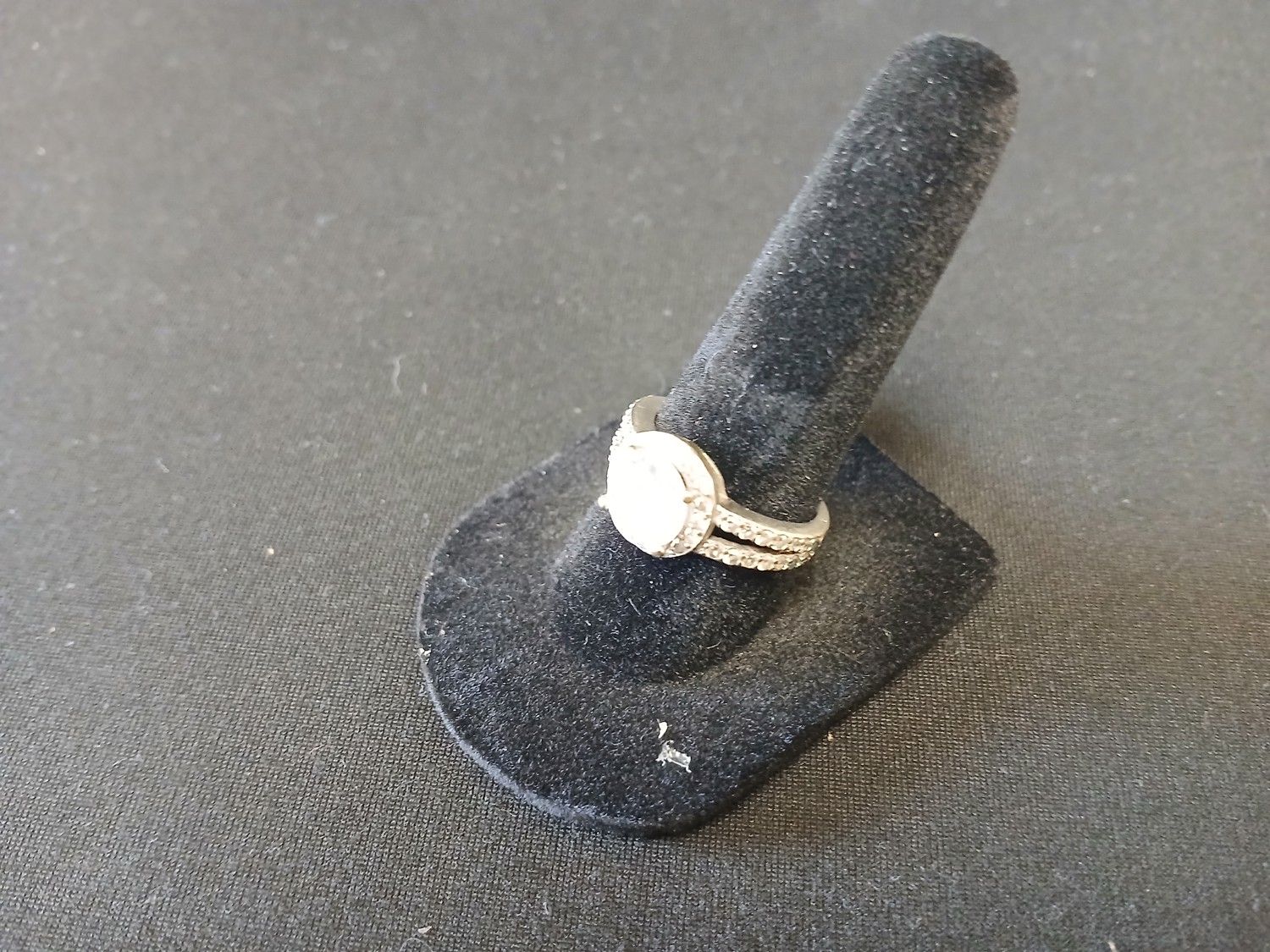 Multiple simulated diamonds accenting a brilliant cut stone. Size unknown.
