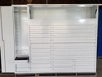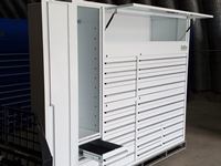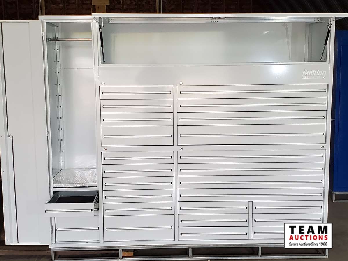 (3) drawers in locker w/ 18 gauge steel, (9) drawers 22" L x 19" W x 3" D, (7) drawers 45"L x 19"W x 3"D, (6) drawers 22"L x 19"W x 3"D, (2) drawers 13"L x 19"W x 3"D, (1) drawer 13"L x 19"W x 6"D, (1) locker 52"H x 24"D with (1) adjustable shelf, (1) overhead shelf 68"L x 14"W X 24"D, 6 casters