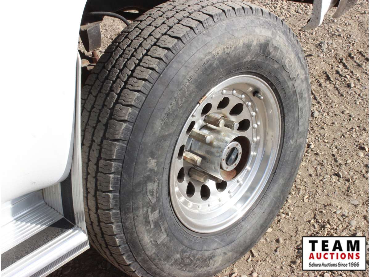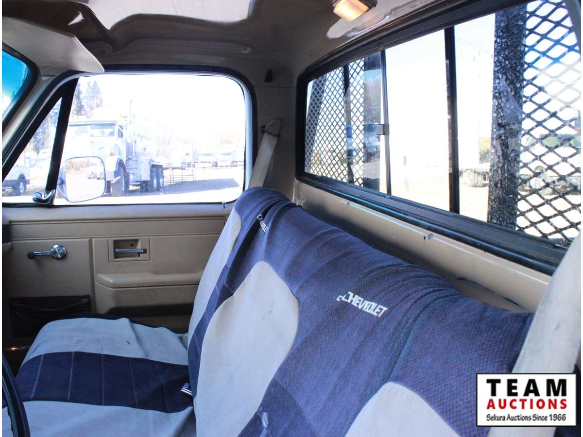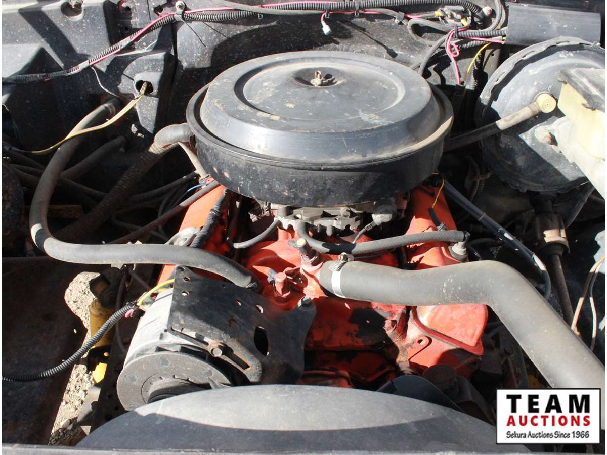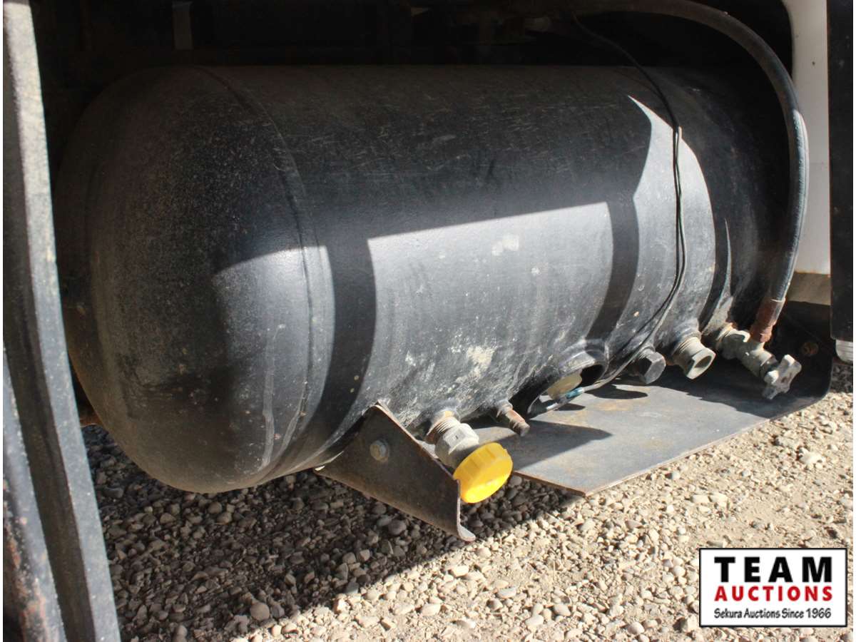 350 V8 engine, 4 speed standard transmission, runs only on propane, outside locking hubs, flat deck with folding sides, newer deck boards, rear air bags, shows 20,025 kms