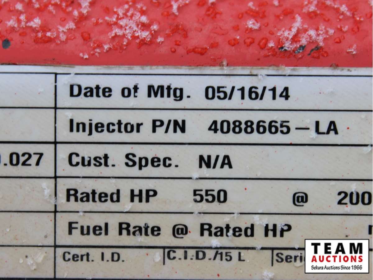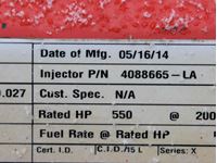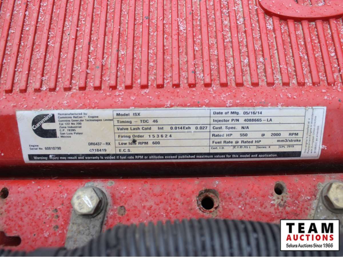 2014 Cummins ISX 15, 550hp engine, aluminum moose bumper, dual aluminum fuel tanks, dual line hydraulic wet kit, 62" highrise sleeper, 244 wheel base, 11R24.5 rubber, 1,484,180 kms and 9,155 hrs showing