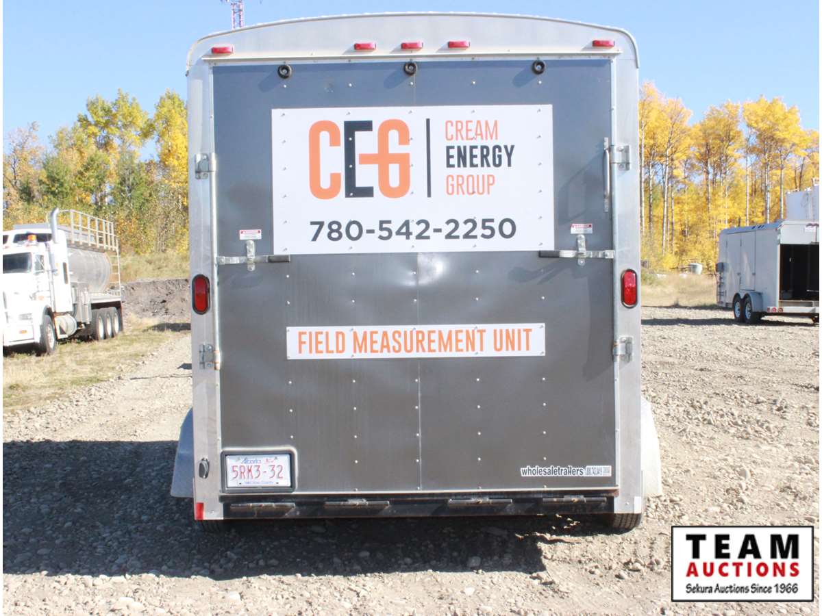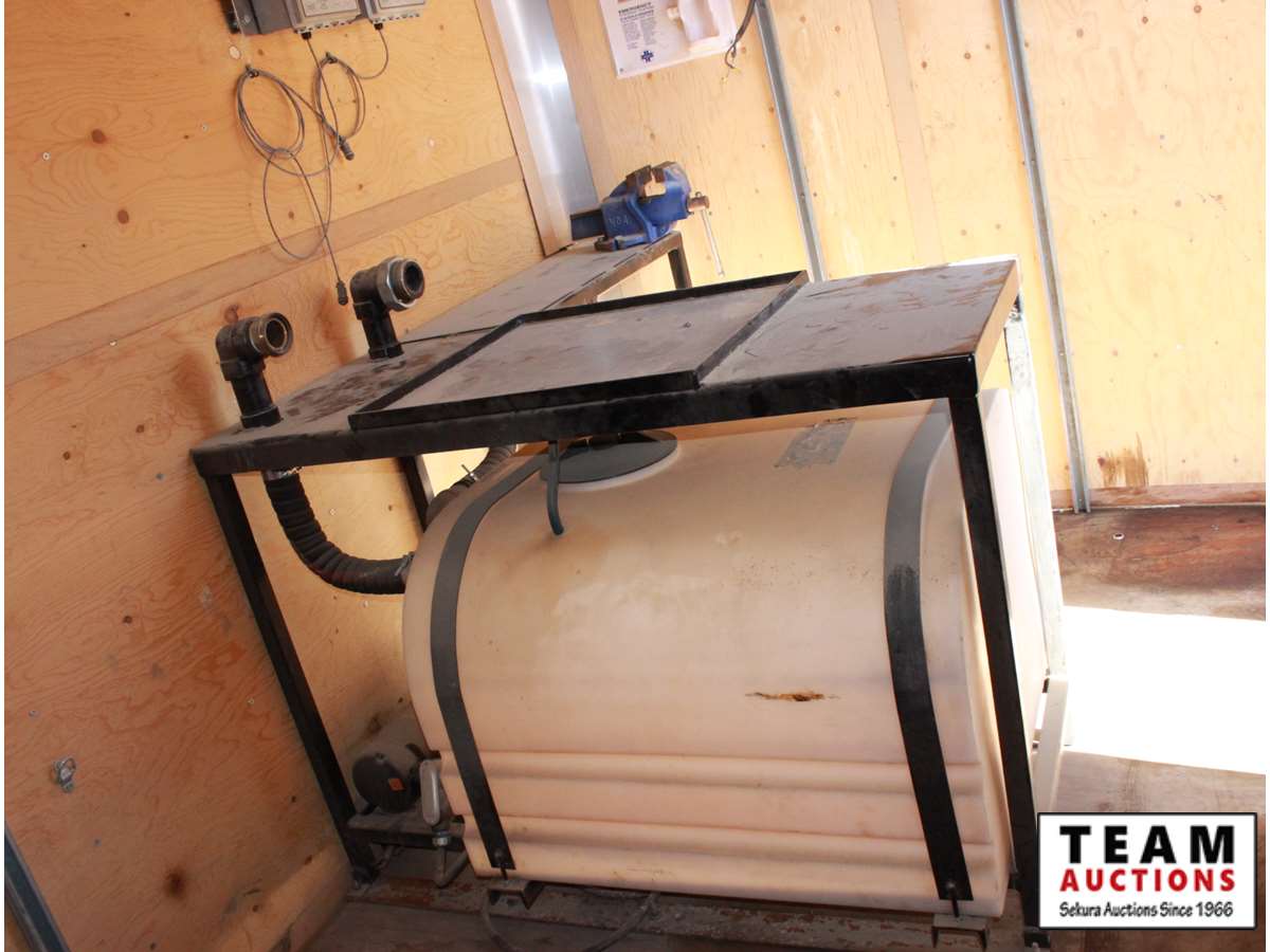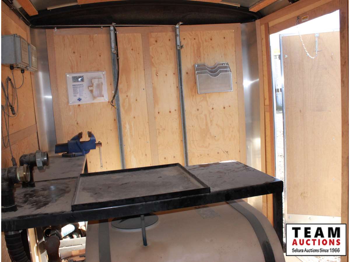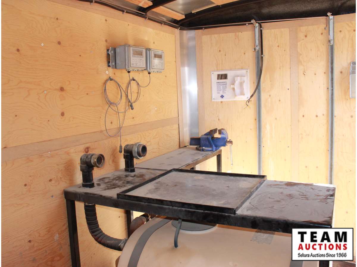 7' wide, 2 5/16' ball hitch, 3500 lb axles, curb side man door, rear fold down door, spare 205/75R15 rubber, propane heater, bench with vise, poly tank with 2" electric pump, (2) Flo Pro 9100 Flow Totalizer ratemeters