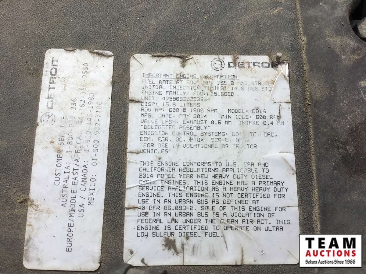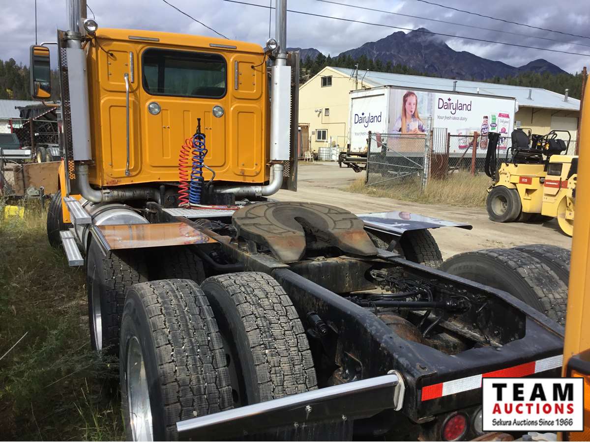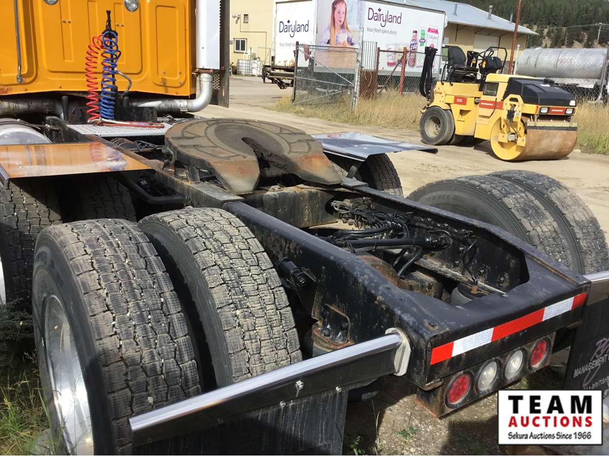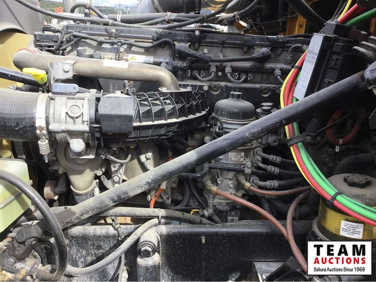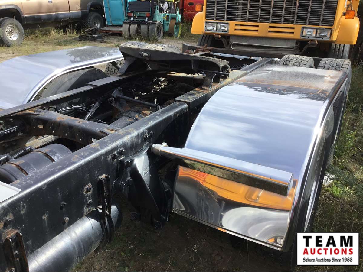 Detroit DD-16 engine (not deleted), Fuller 18 speed Auto Shift transmission, air ride suspension, 1,200 lb front axle, 46,000 rears, 4 way lockers, 208" wheel base, 11R22.5 rubber, aluminum rims, 736,200 miles, 20,450 engine hours, Alberta registered, no current CVIP