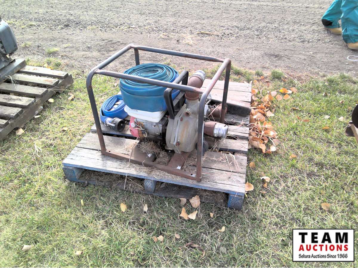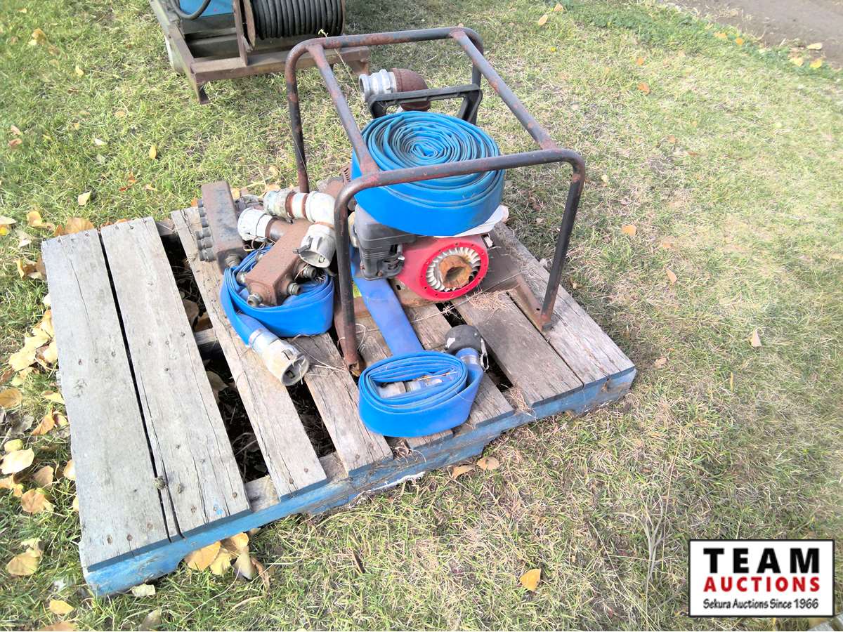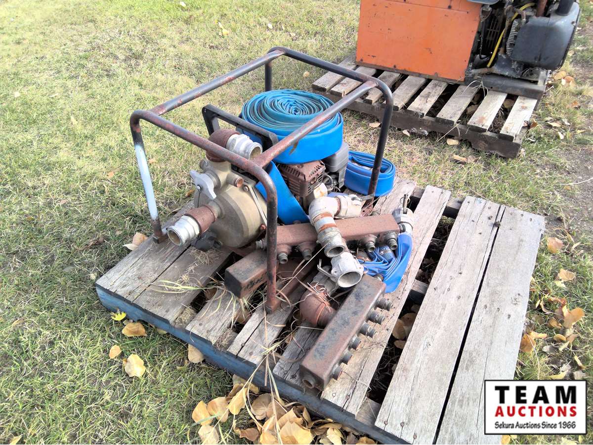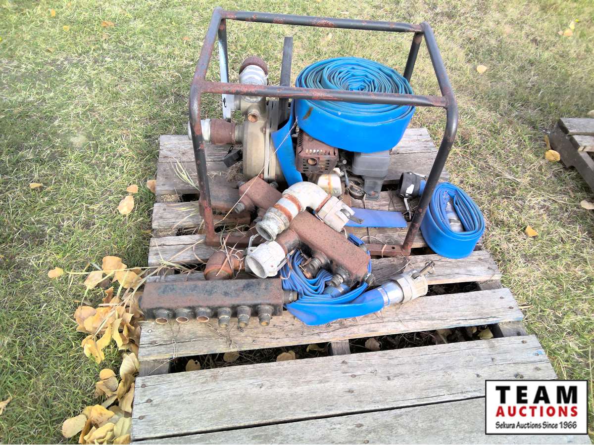 large irrigation pump, (2) small gas pumps, qty of lay flat hose, irrigation pipe