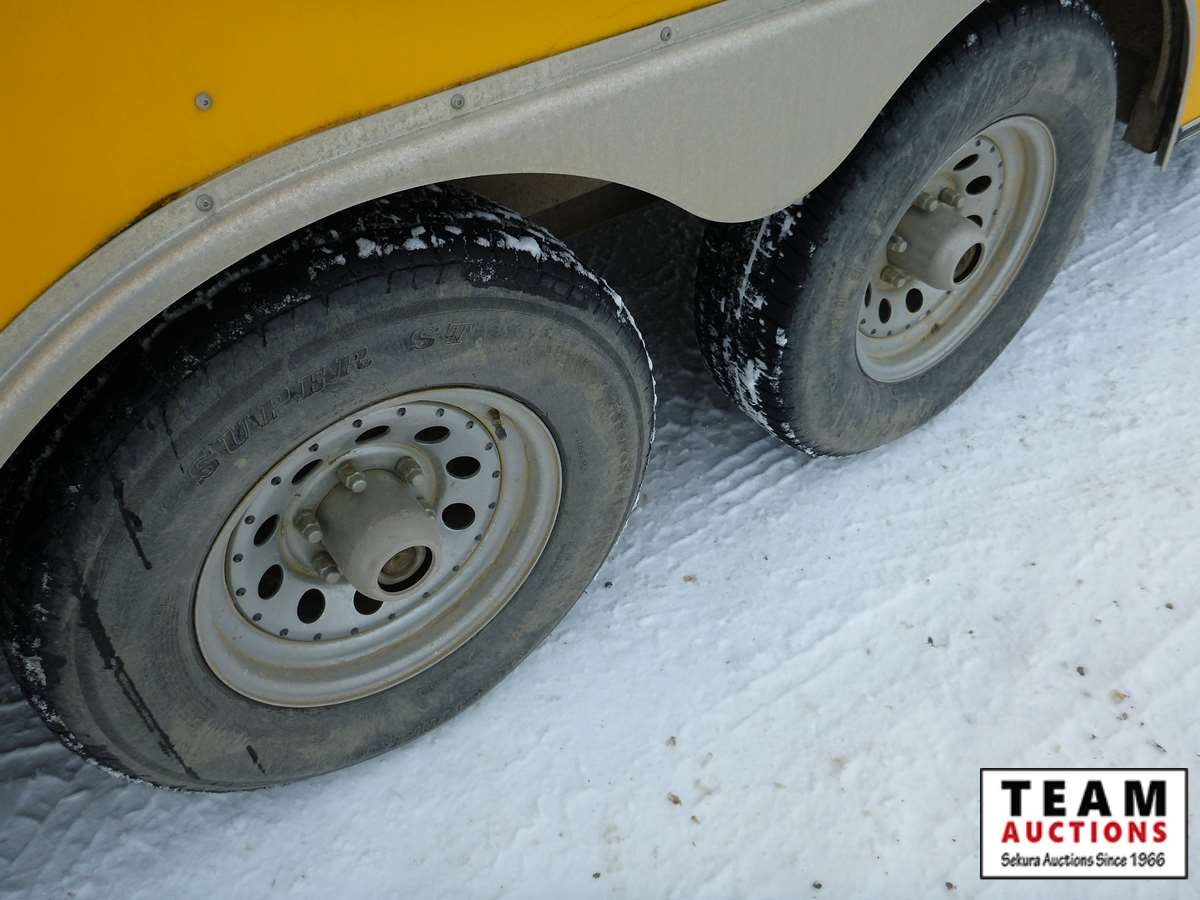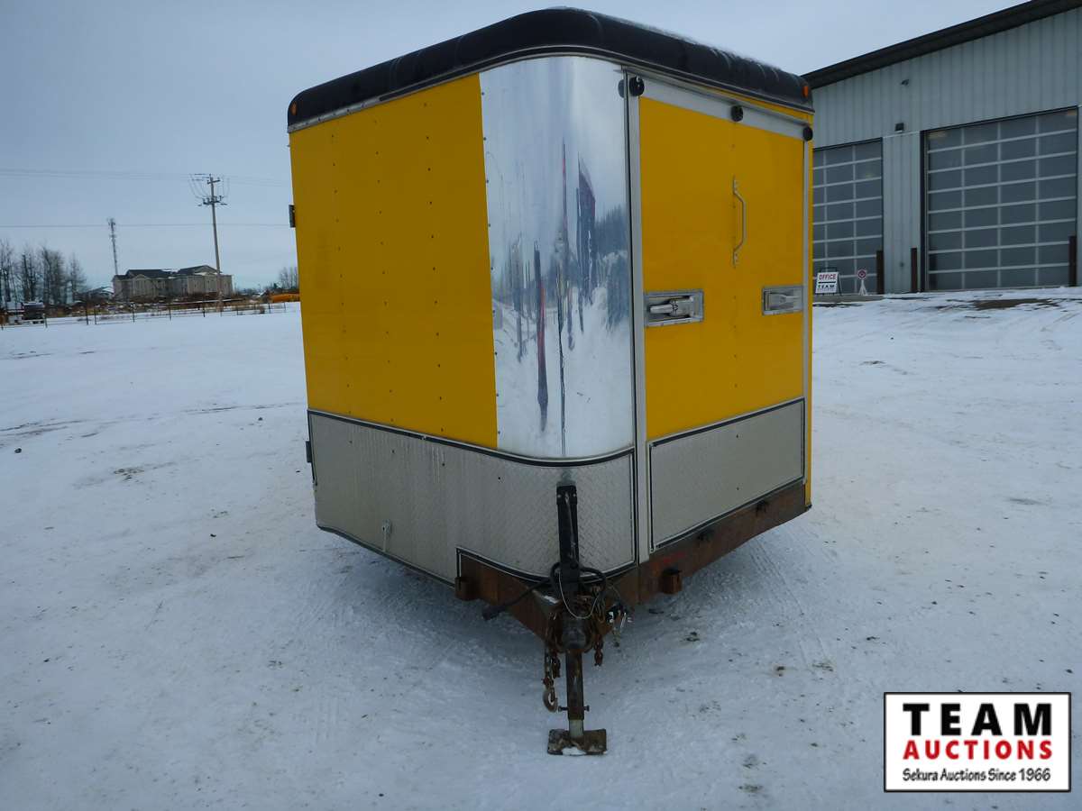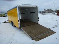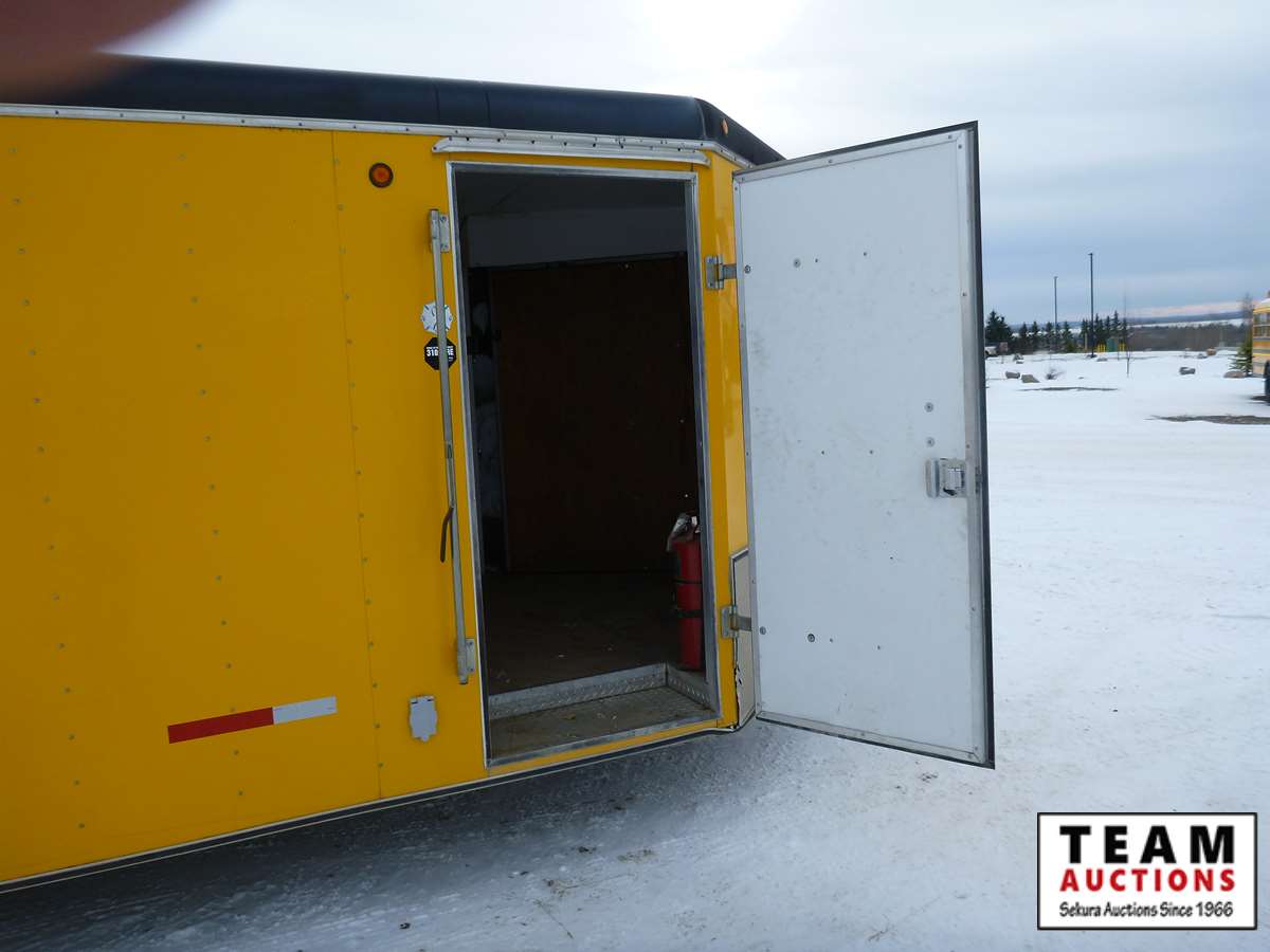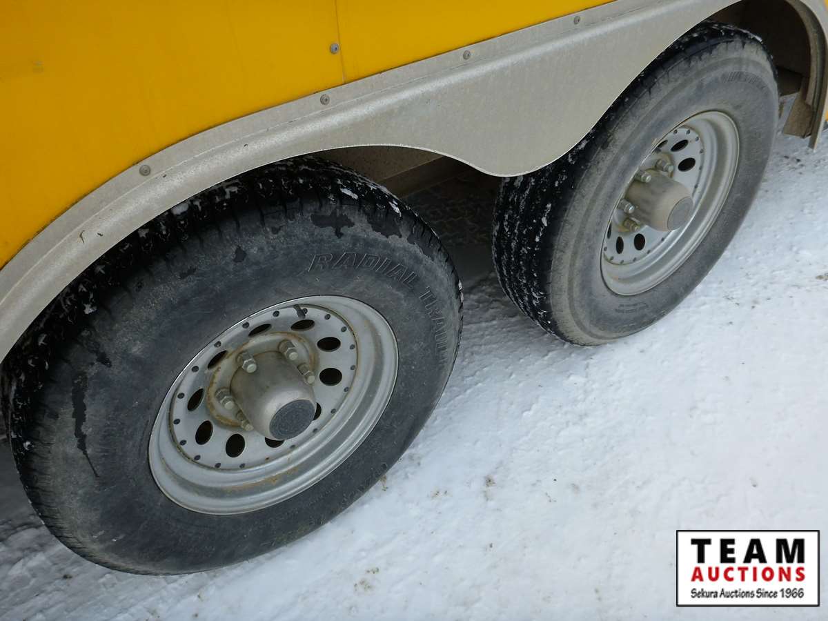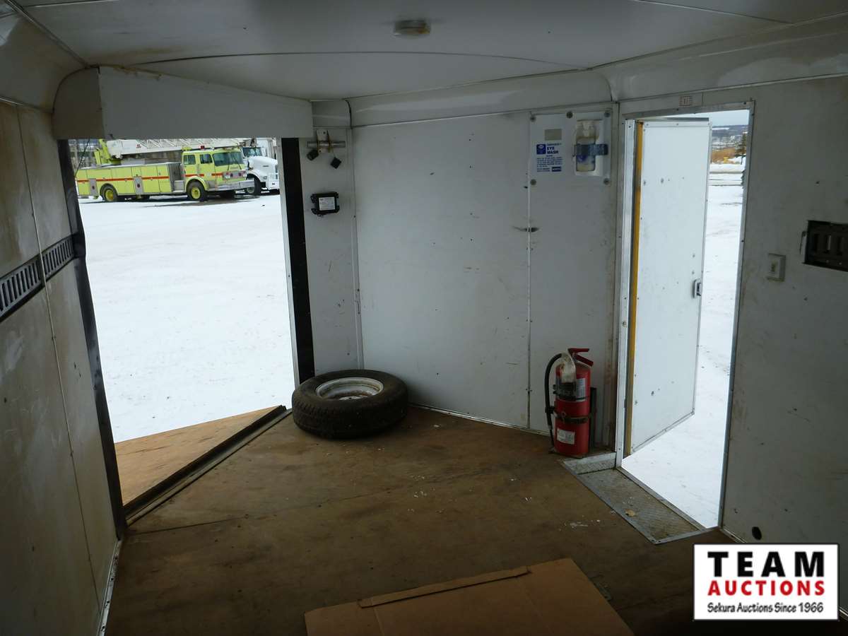 rear fold down door, side entry door, front fold down door, GVW 9800 lbs, 6 bolt axle, 8' 6" width, interior height 6' 8", 225/75R15 rubber, Alberta Registered