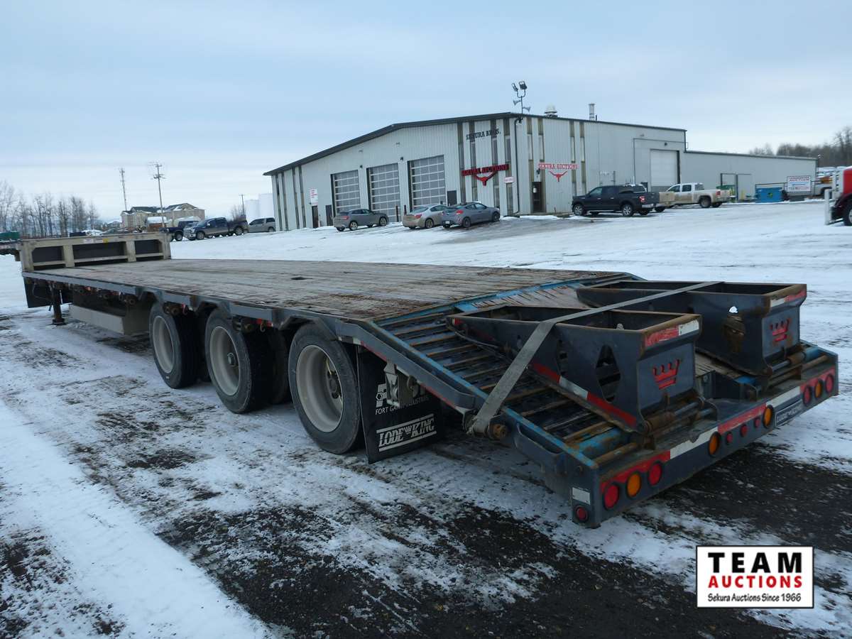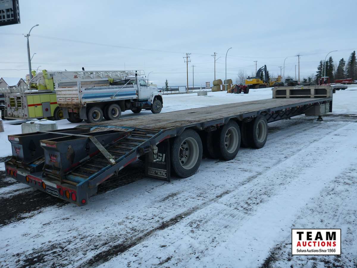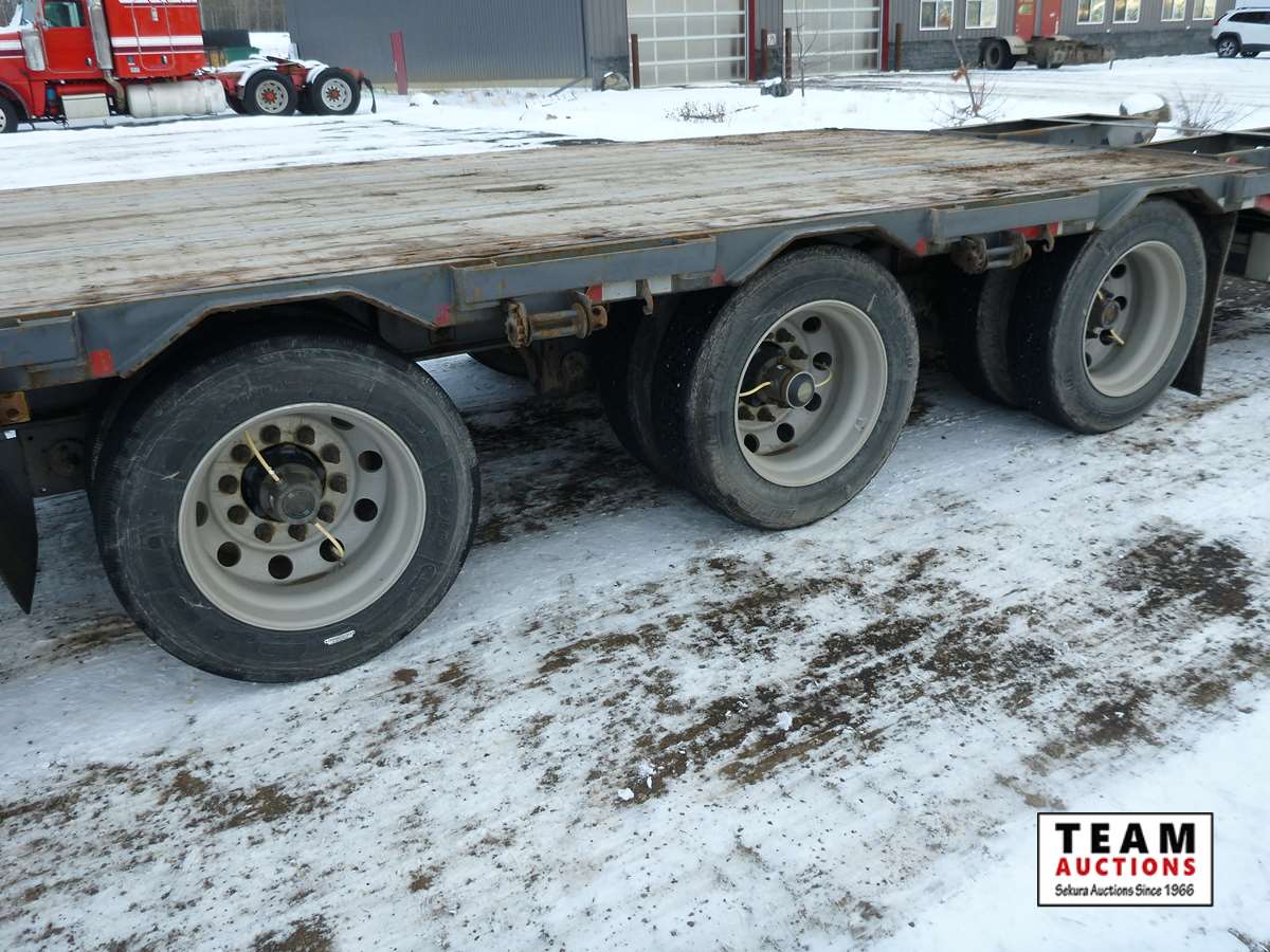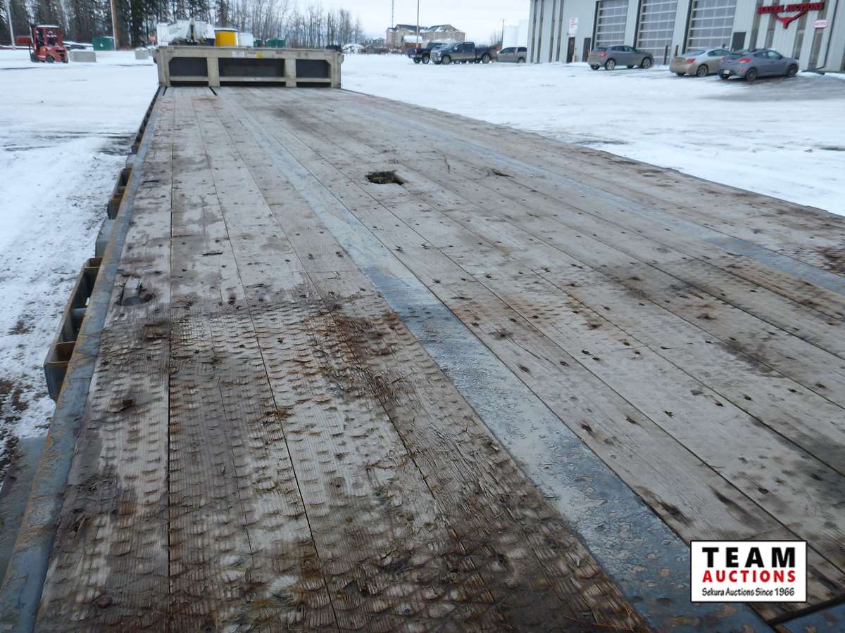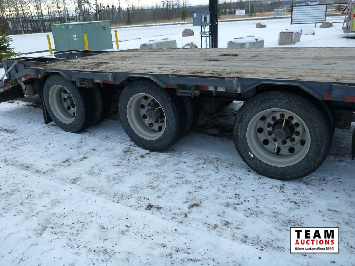 8 1/2' wide, Henderson air ride suspension, rear beaver tail with custom built grouser bars for traction, rear spring loaded ramps for ground loading, rear strobe and side aluminum pull out wide load lights, aluminum tool box, aluminum dunnage rack, floor pull out tie down chains, stake and rub rails, 3-Bar side mounted winch's, extra front mud flap package, (2) aluminum load bunks, rear axle load guage, 255/70R22.5 tires with aluminum rims and auto inflation system, Alberta CVIP just done, Alberta registered