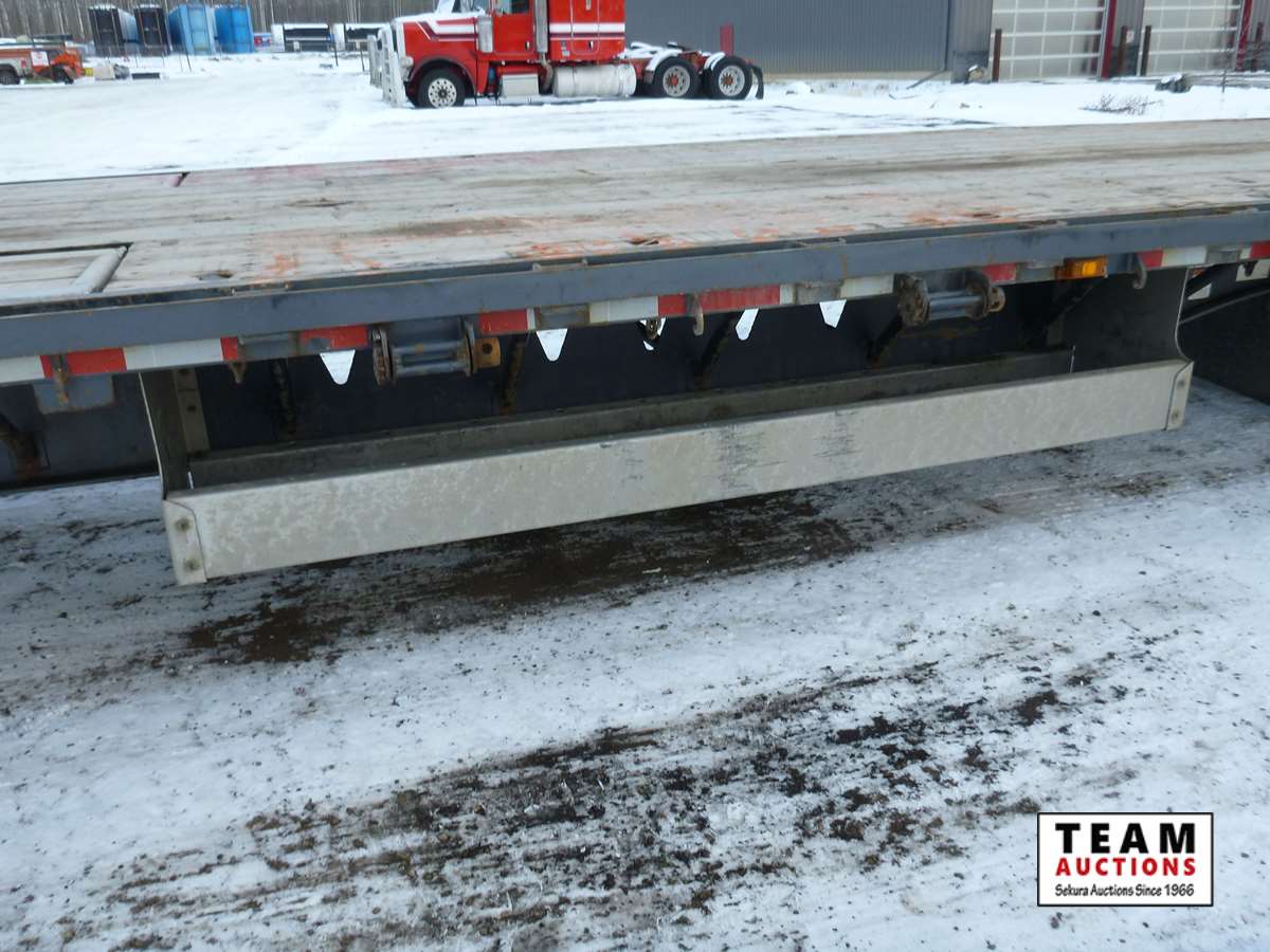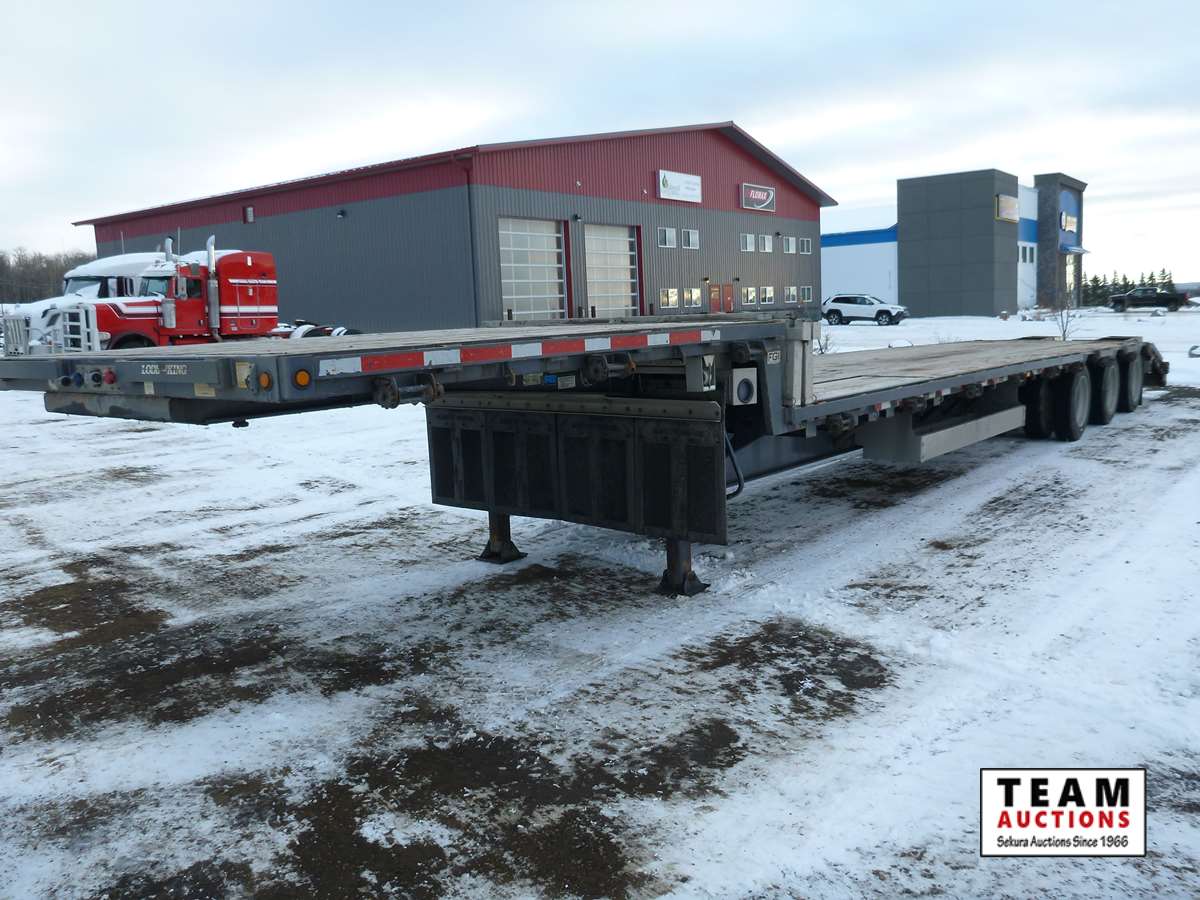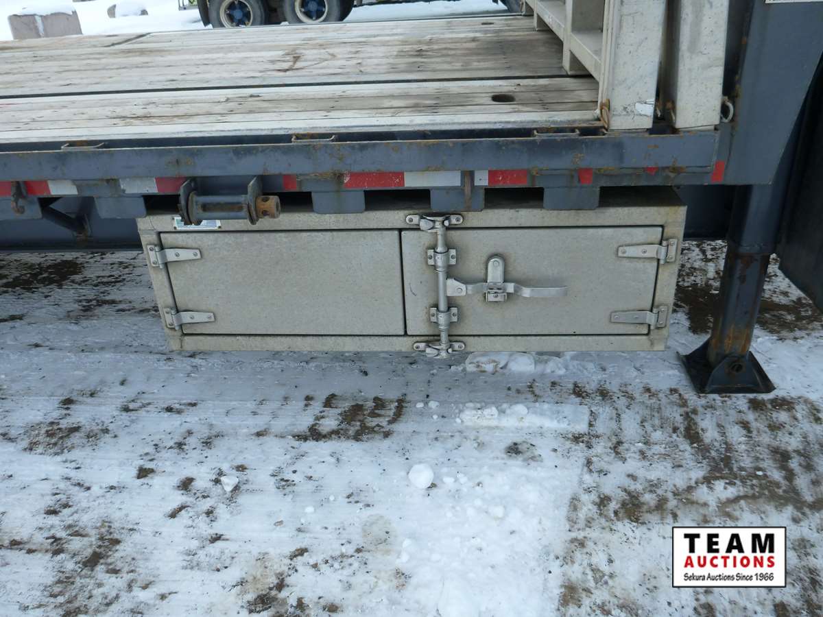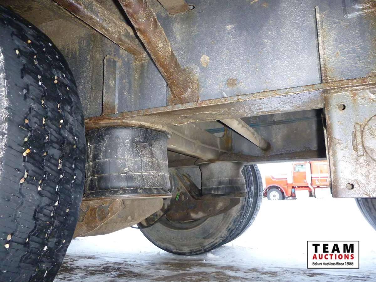 8 1/2' wide, Henderson air ride suspension, rear beaver tail with custom built grouser bars for traction, rear spring loaded ramps for ground loading, rear strobe and side aluminum pull out wide load lights, aluminum tool box, aluminum dunnage rack, floor pull out tie down chains, stake and rub rails, 3-Bar side mounted winch's, extra front mud flap package, (2) aluminum load bunks, rear axle load guage, 255/70R22.5 tires with aluminum rims and auto inflation system, Alberta CVIP just done, Alberta registered