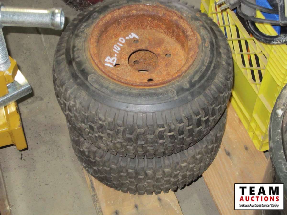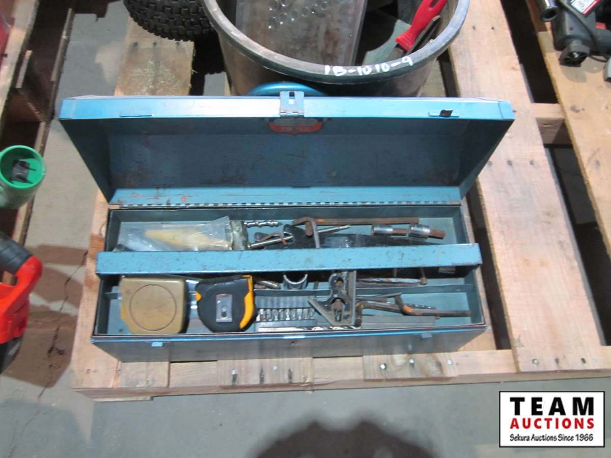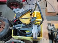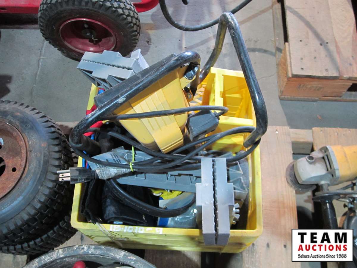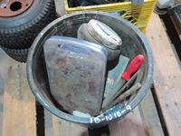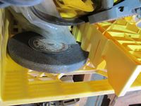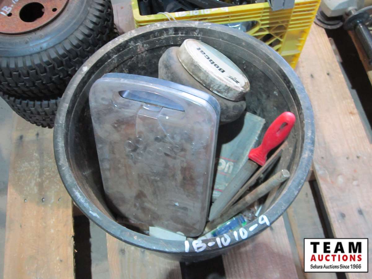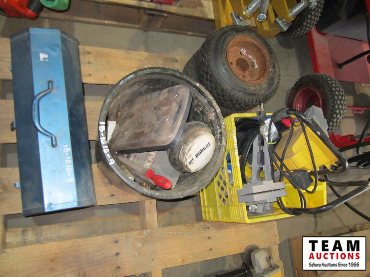blue tool box w/misc tools & hardware, black bucket w/misc tools & hardware, yellow crate w/worklight, tools, grinding disc, misc, (2) lawnmower rims w/tires, 13x5.00-6