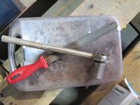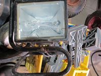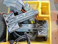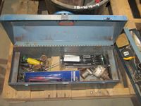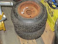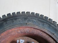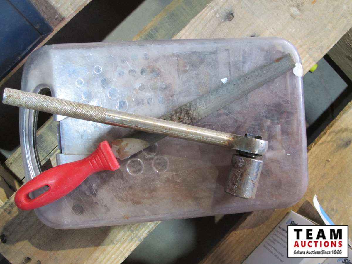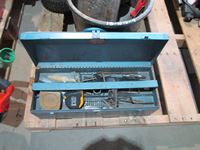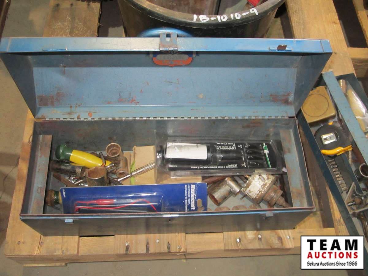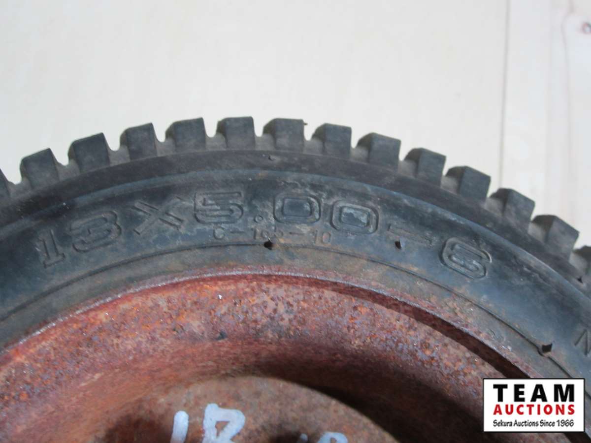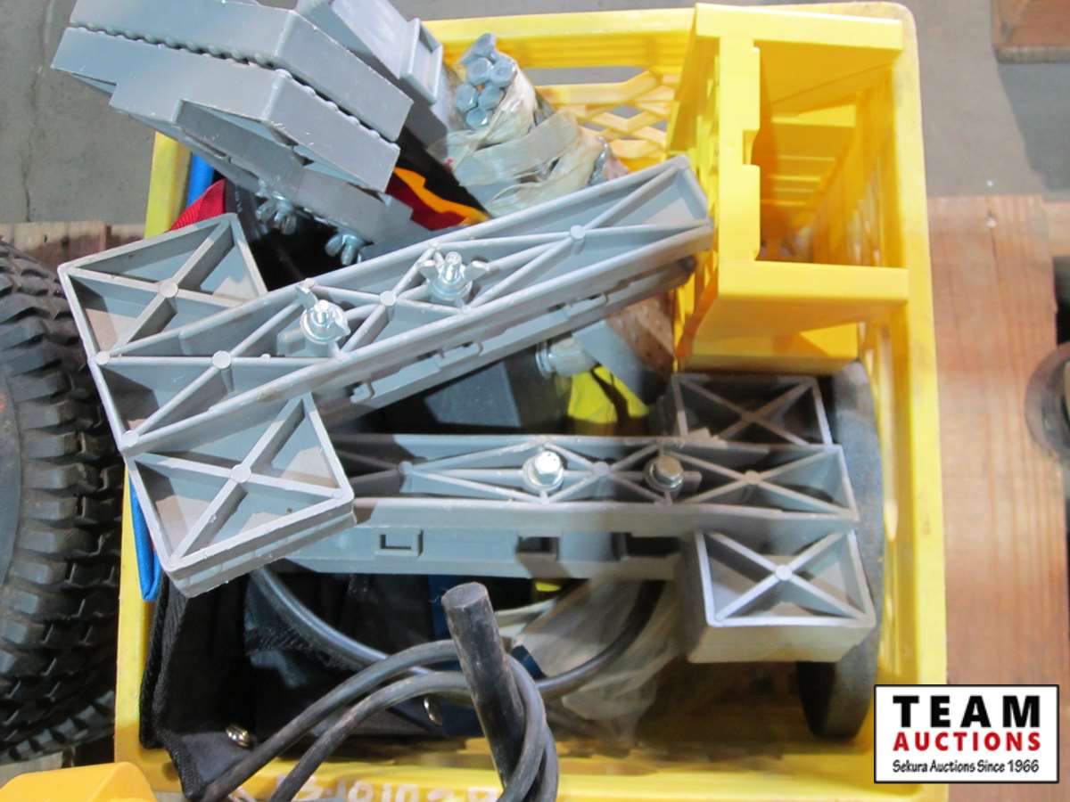 blue tool box w/misc tools & hardware, black bucket w/misc tools & hardware, yellow crate w/worklight, tools, grinding disc, misc, (2) lawnmower rims w/tires, 13x5.00-6