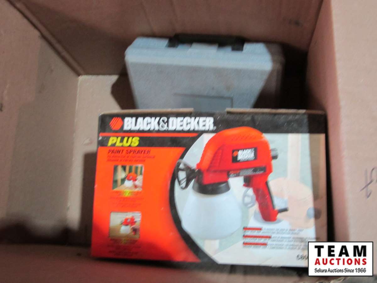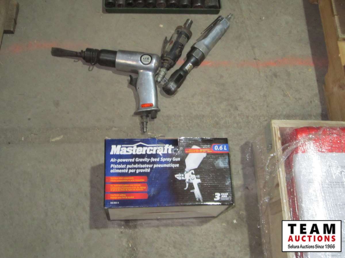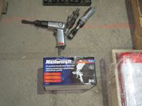 air chisel, 3/8" air ratchet, 1/4" mini air die grinder, 1/2" impact sockets, Black & Decker sprayer, Master Craft sprayer