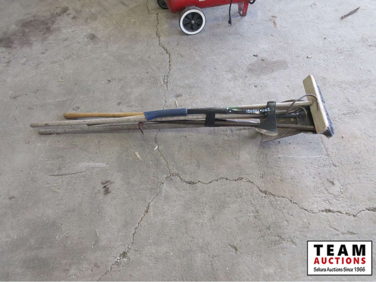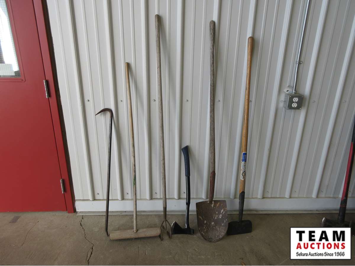 (1) axe, (1) broom, (1) gooseneck bar, (1) round nose spade, (1) hand weeder, (1) scraper