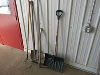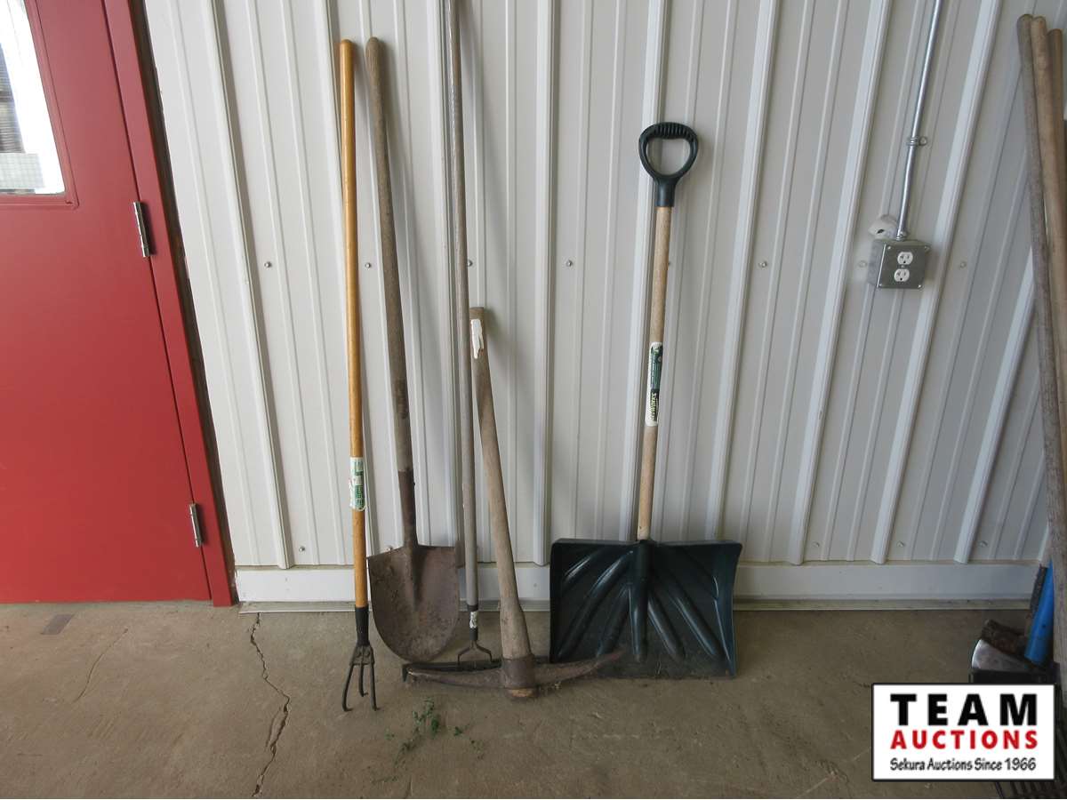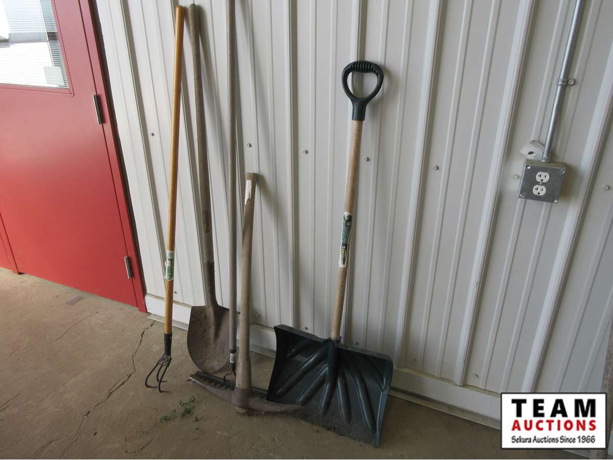 (1) snow shovel, (1) pick axe, (1)rake, (1) weeder, (1) round nose spade