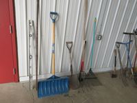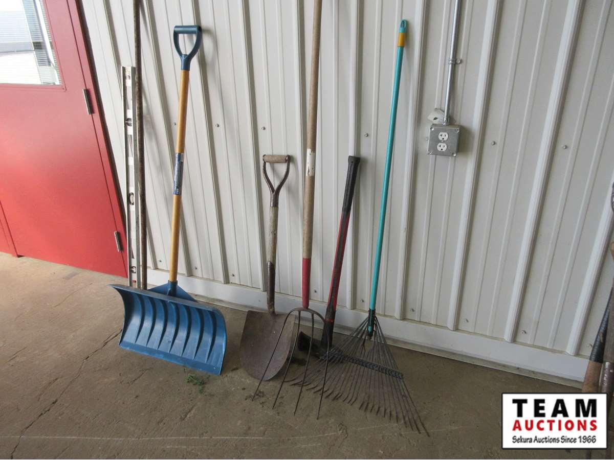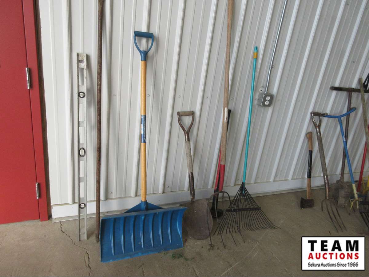(1) rake, (1) snow shovel, (1) 4 tine fork, (1) round nose spade, (1) crow bar, (1) level, (1) splitting maul