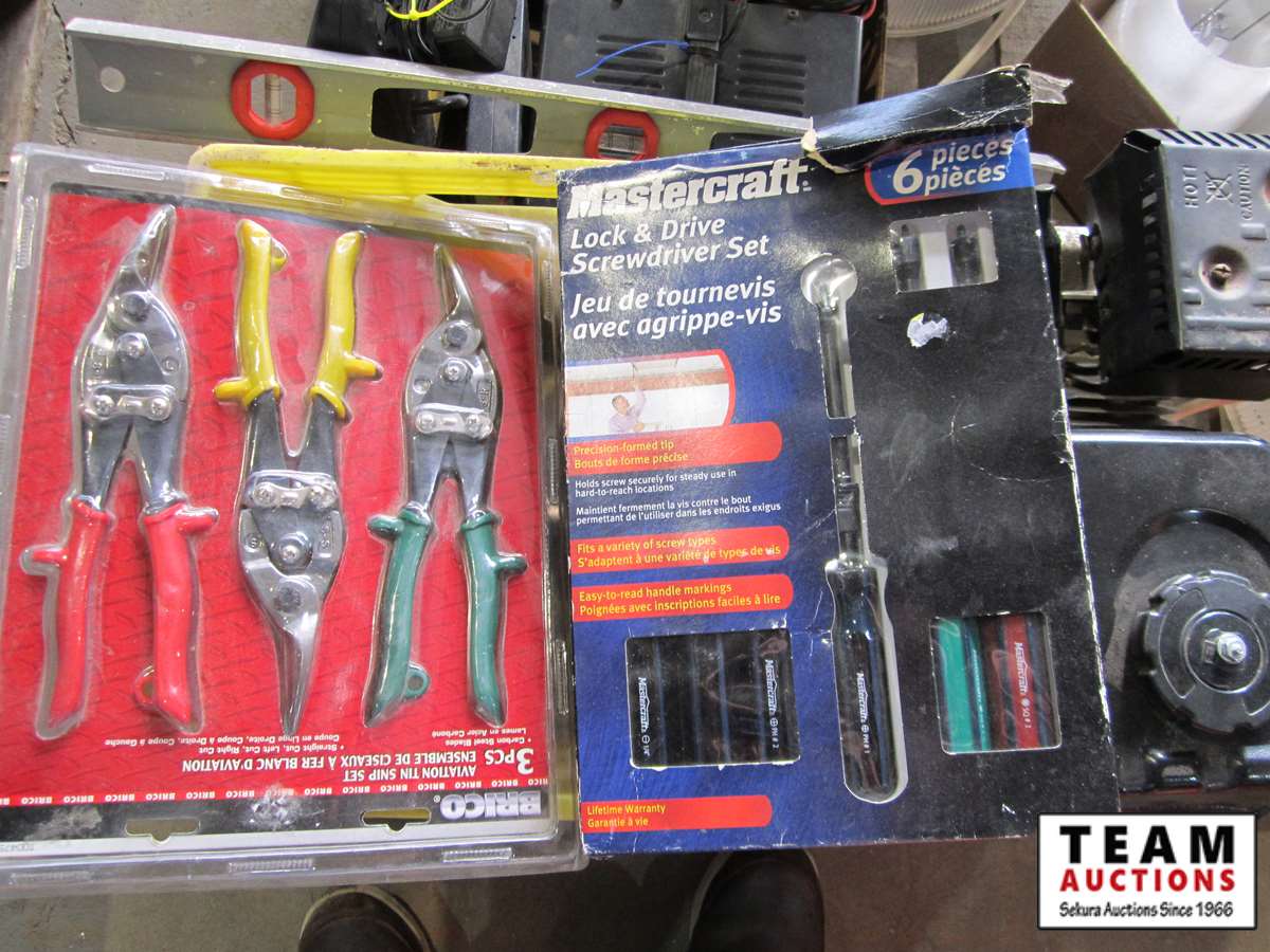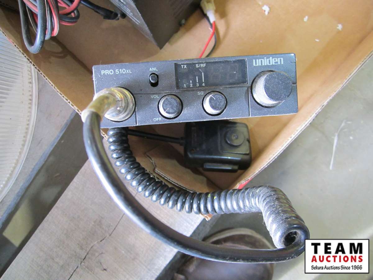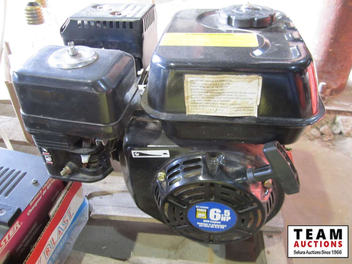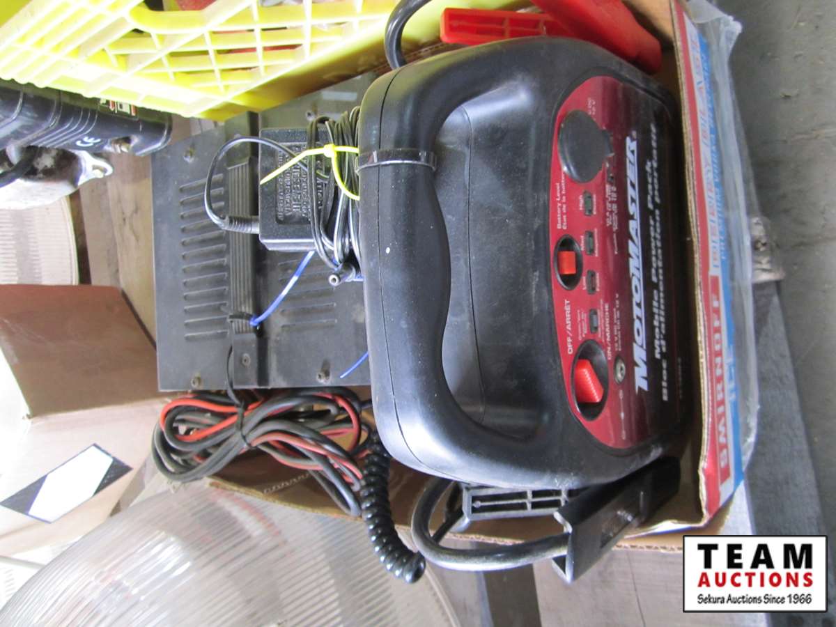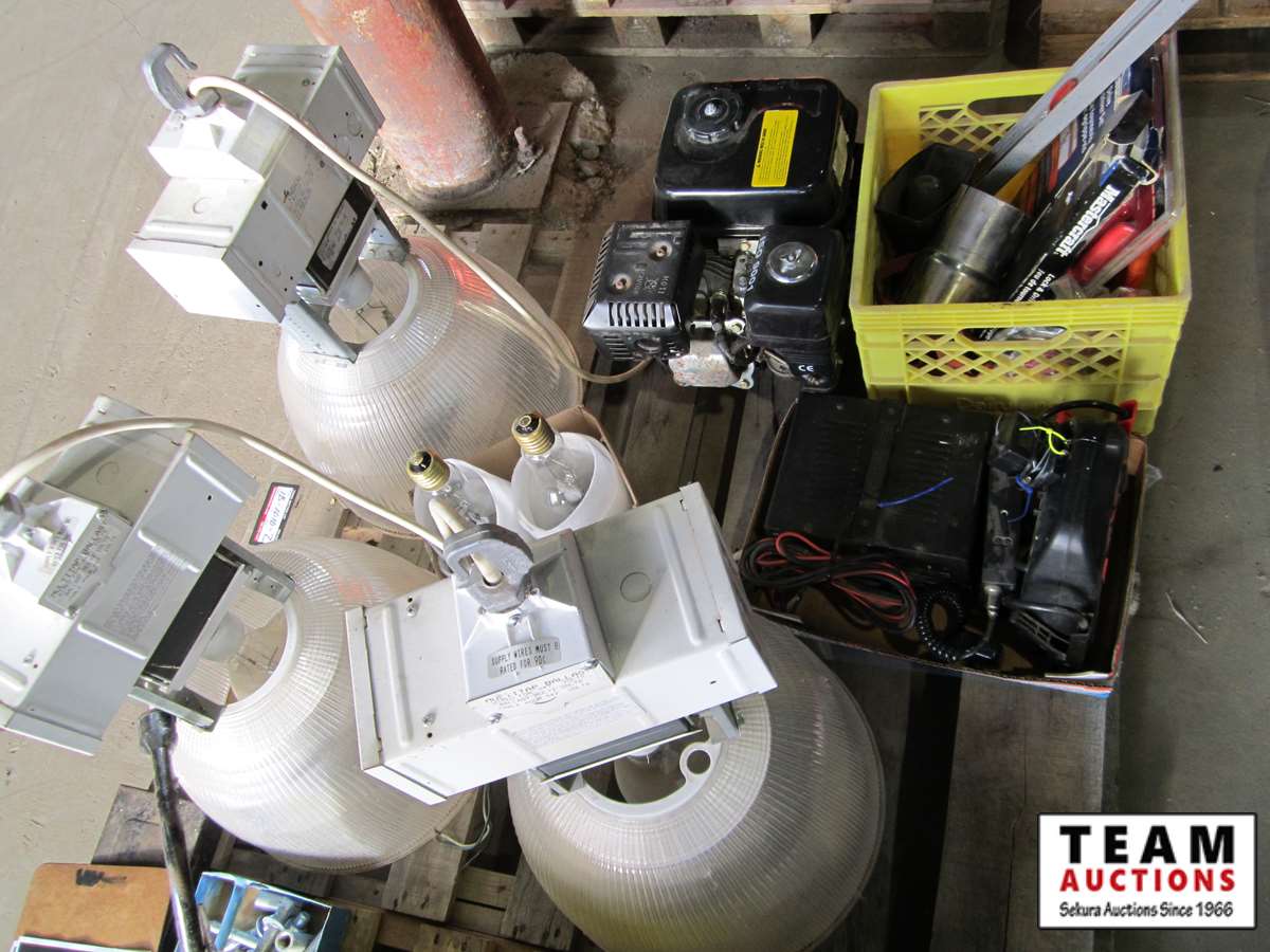 Power Fist 6.5 HP gas engine w/ horizontal shaft, tin snips, screw driver set, Motomaster booster/charger, Uniden CB radio, battery charger, (3) 110V shop lights w/(2) spare bulbs