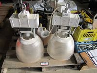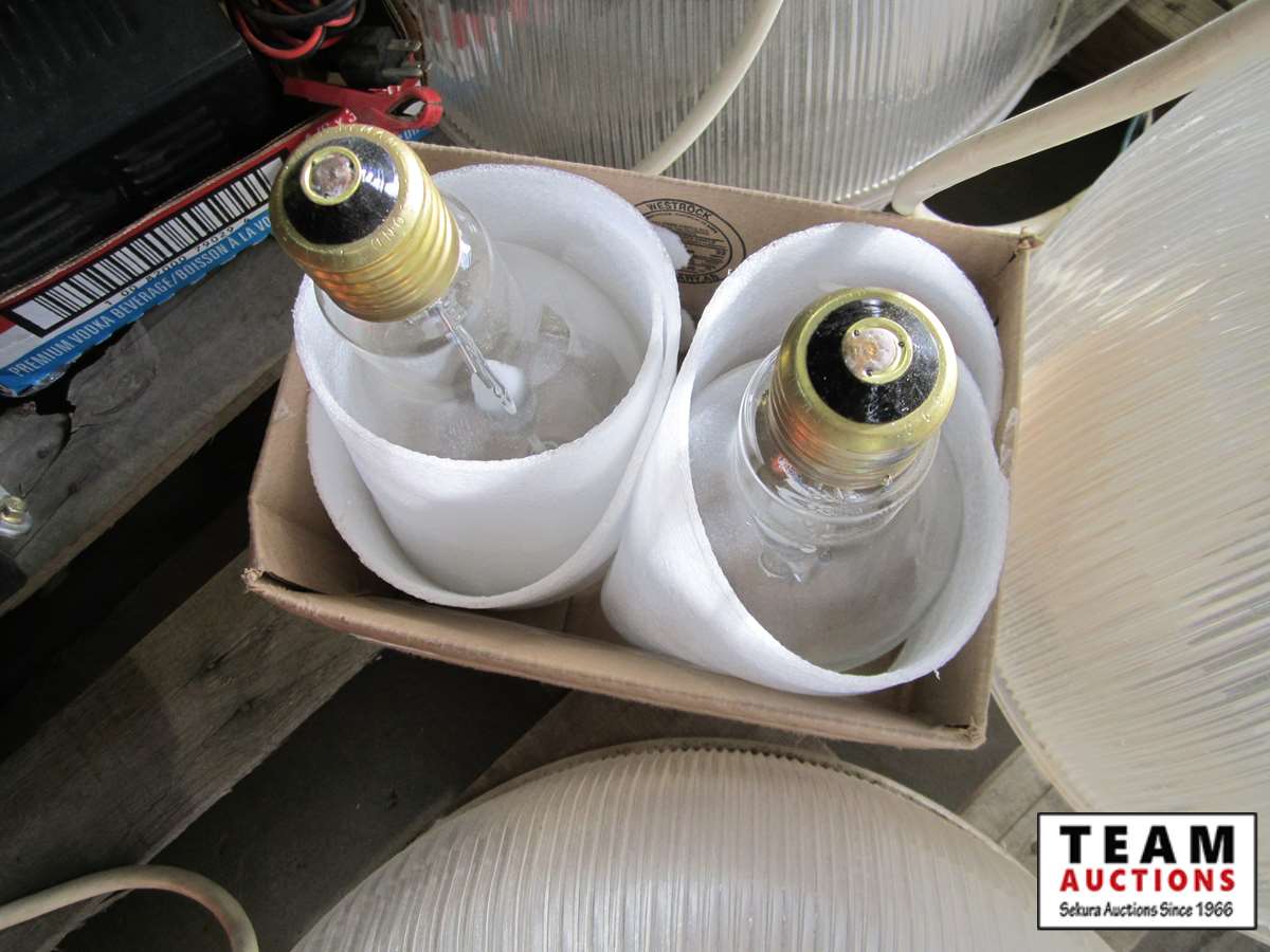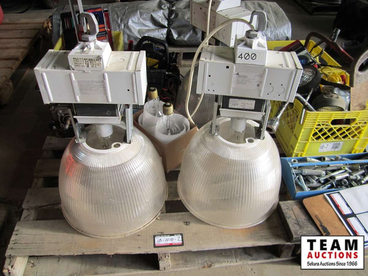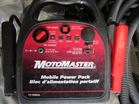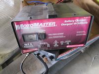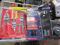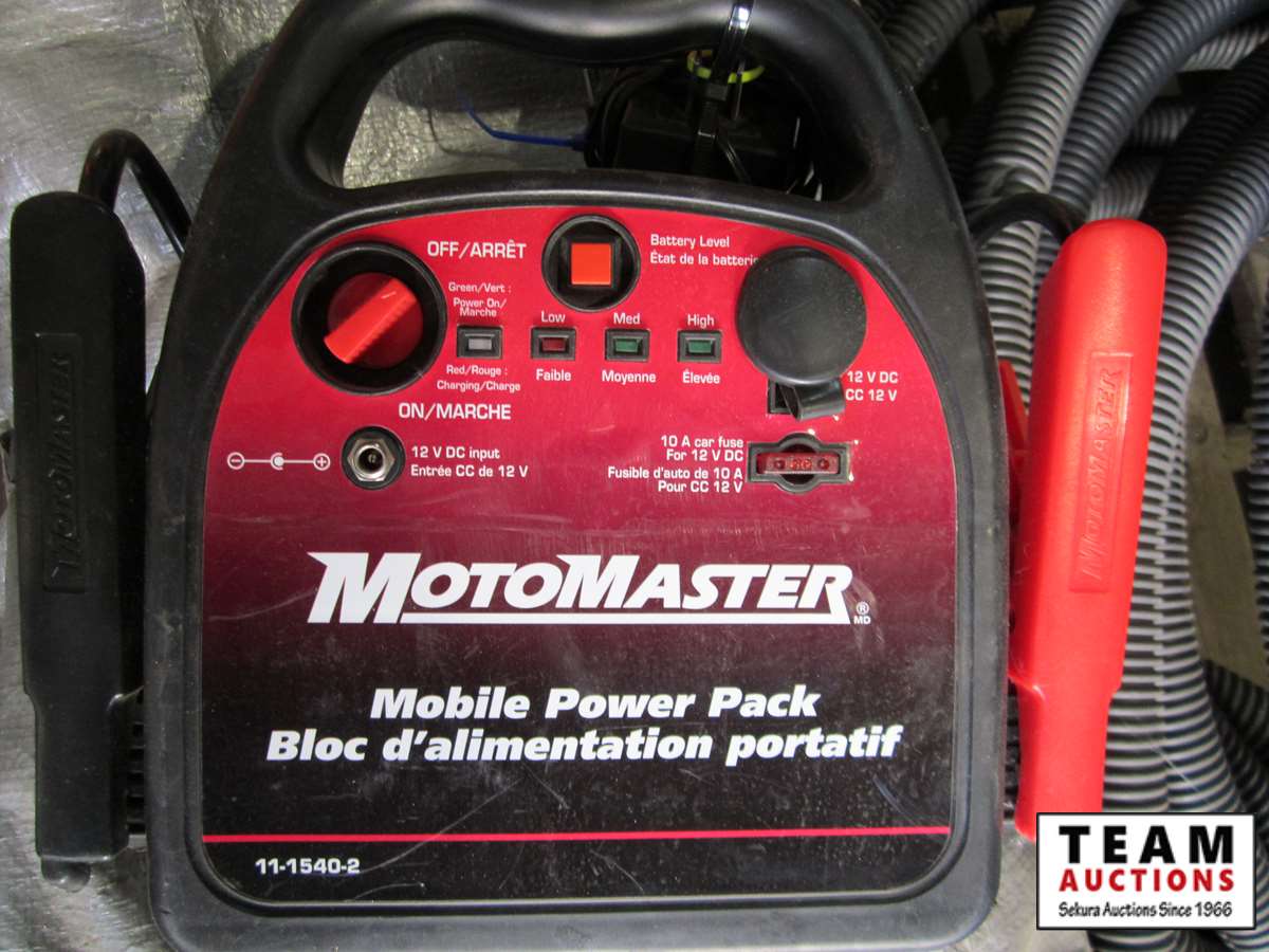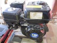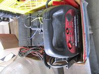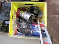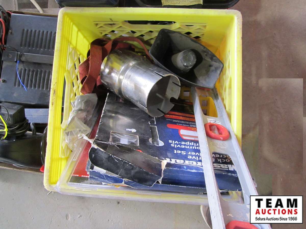 Power Fist 6.5 HP gas engine w/ horizontal shaft, tin snips, screw driver set, Motomaster booster/charger, Uniden CB radio, battery charger, (3) 110V shop lights w/(2) spare bulbs